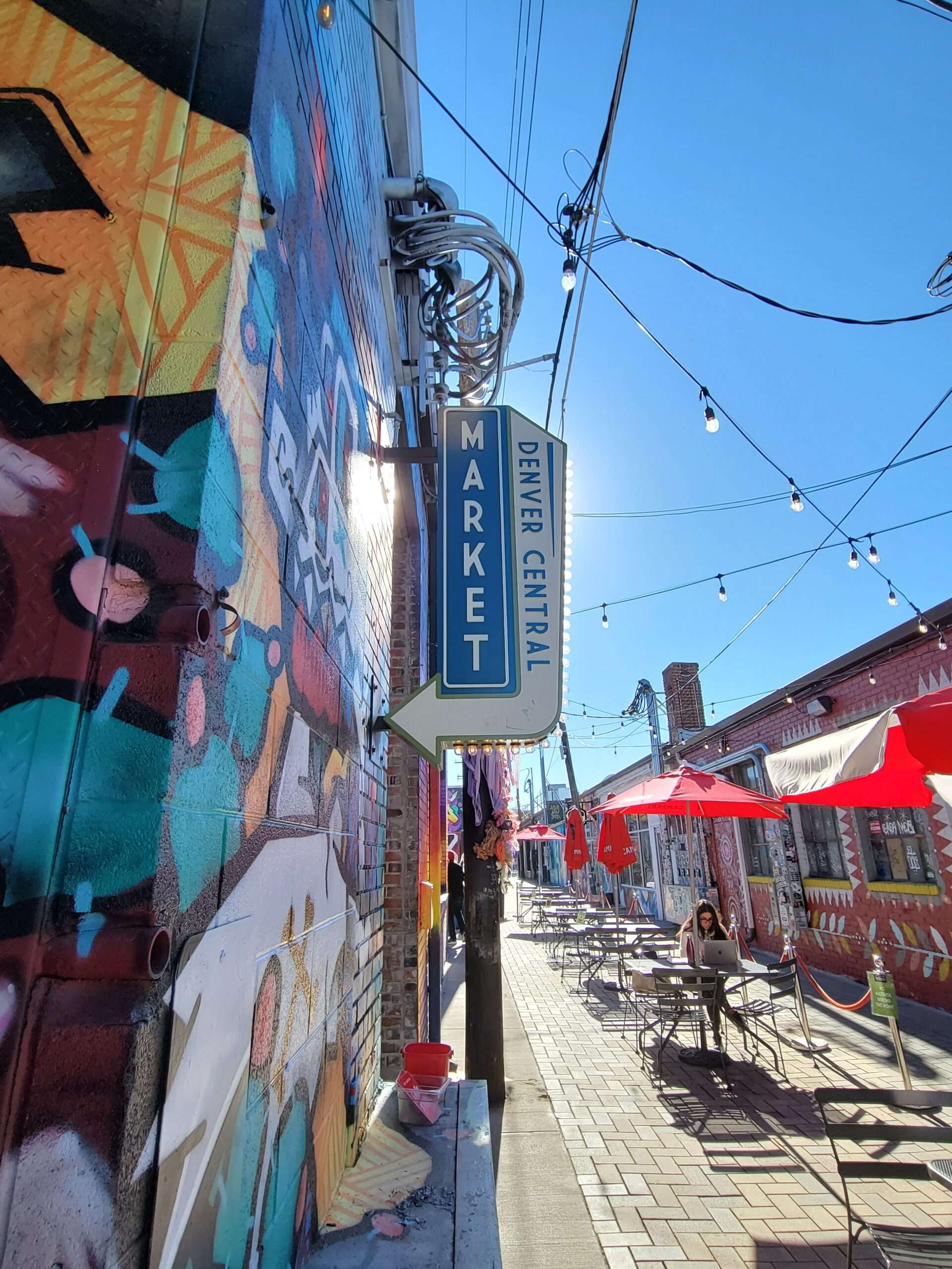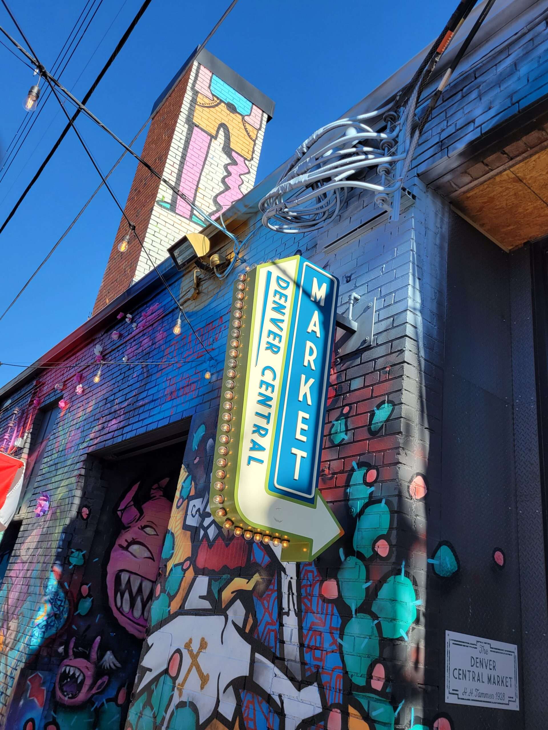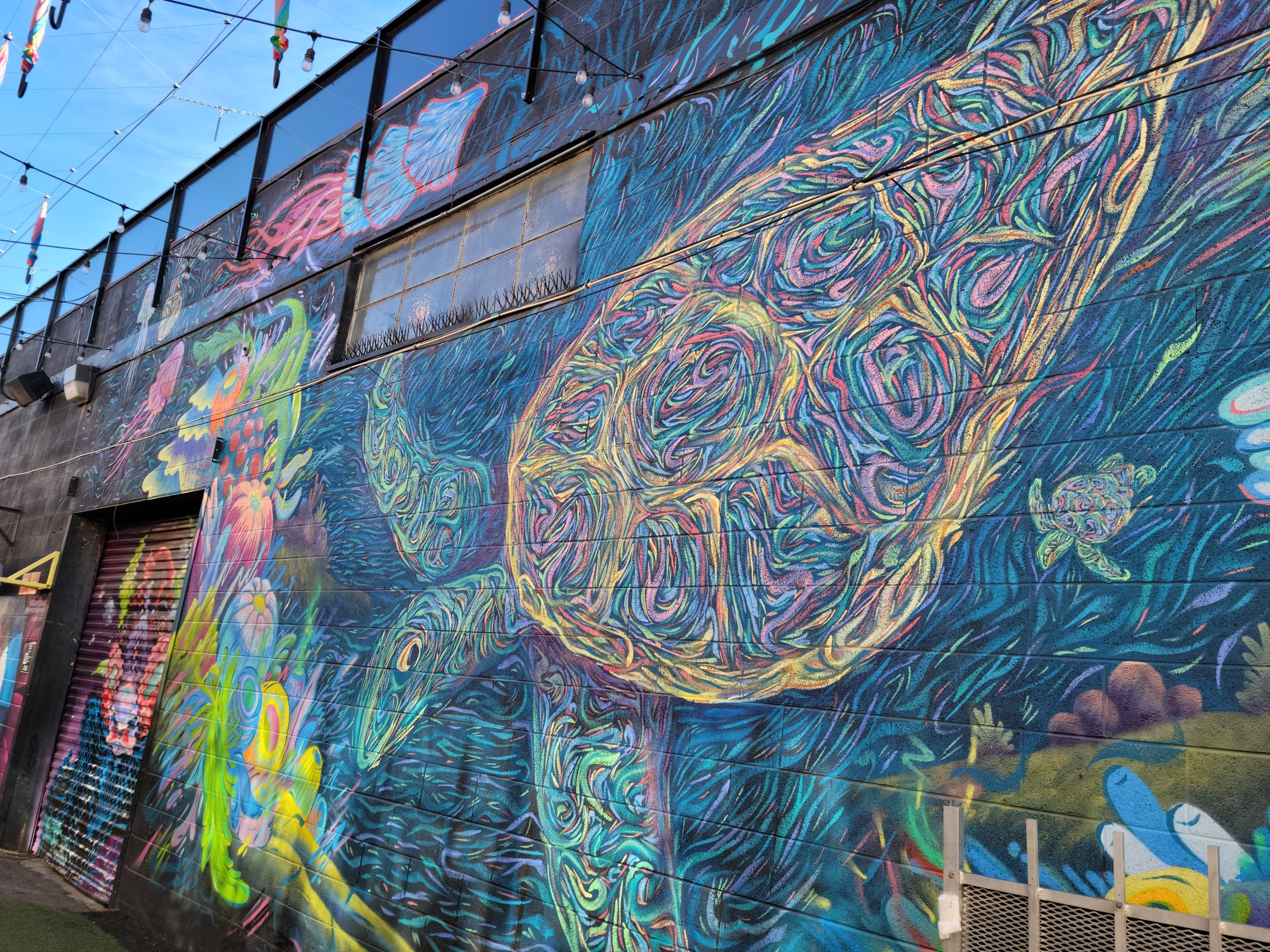 This striking urban artwork showcases a large-scale sea turtle rendered in a swirling, kaleidoscopic pattern of blues, yellows, and greens. The mural spans a large brick wall under string lights, creating an immersive underwater atmosphere in the heart of Denver's premier creative neighborhood.