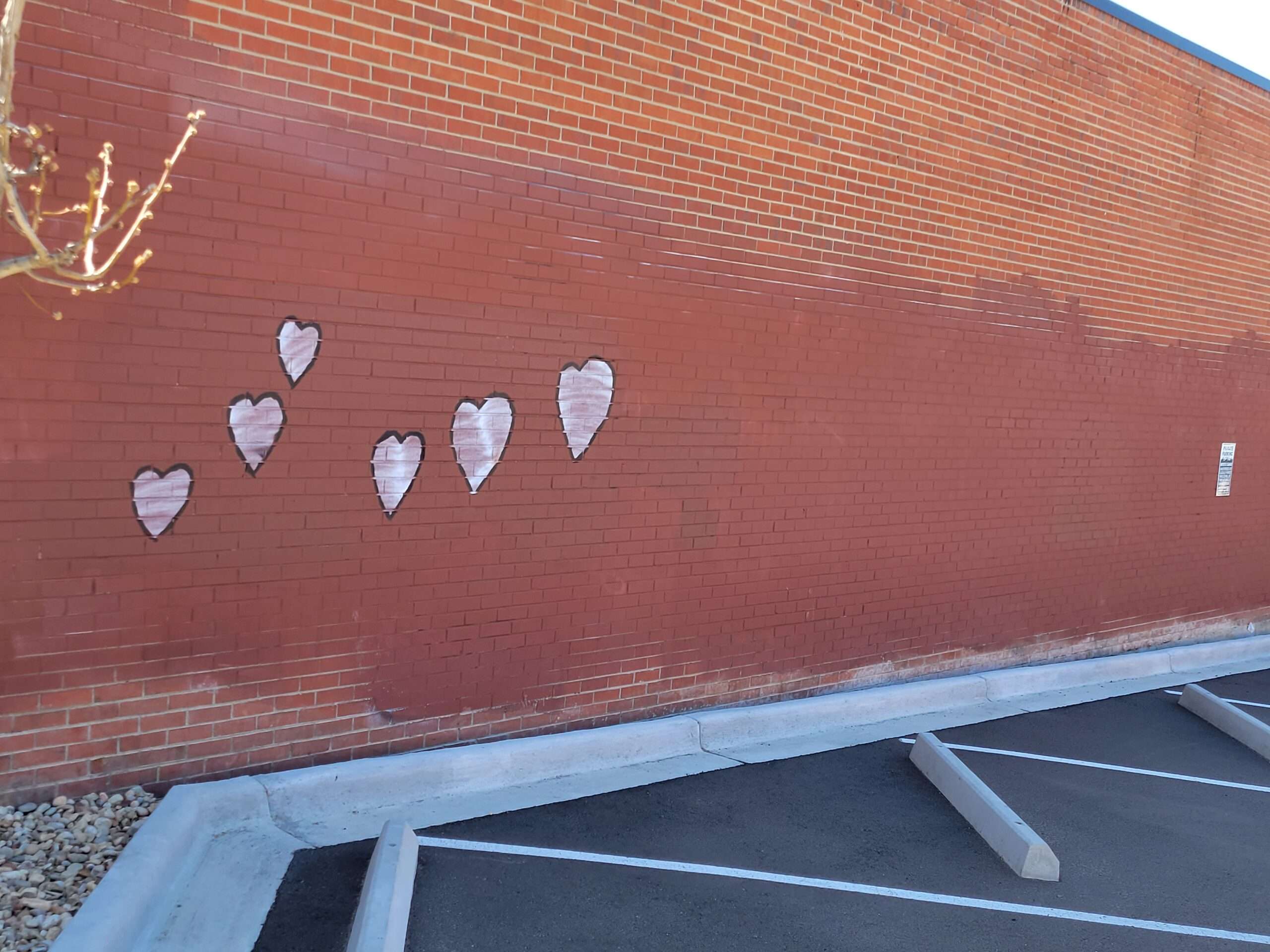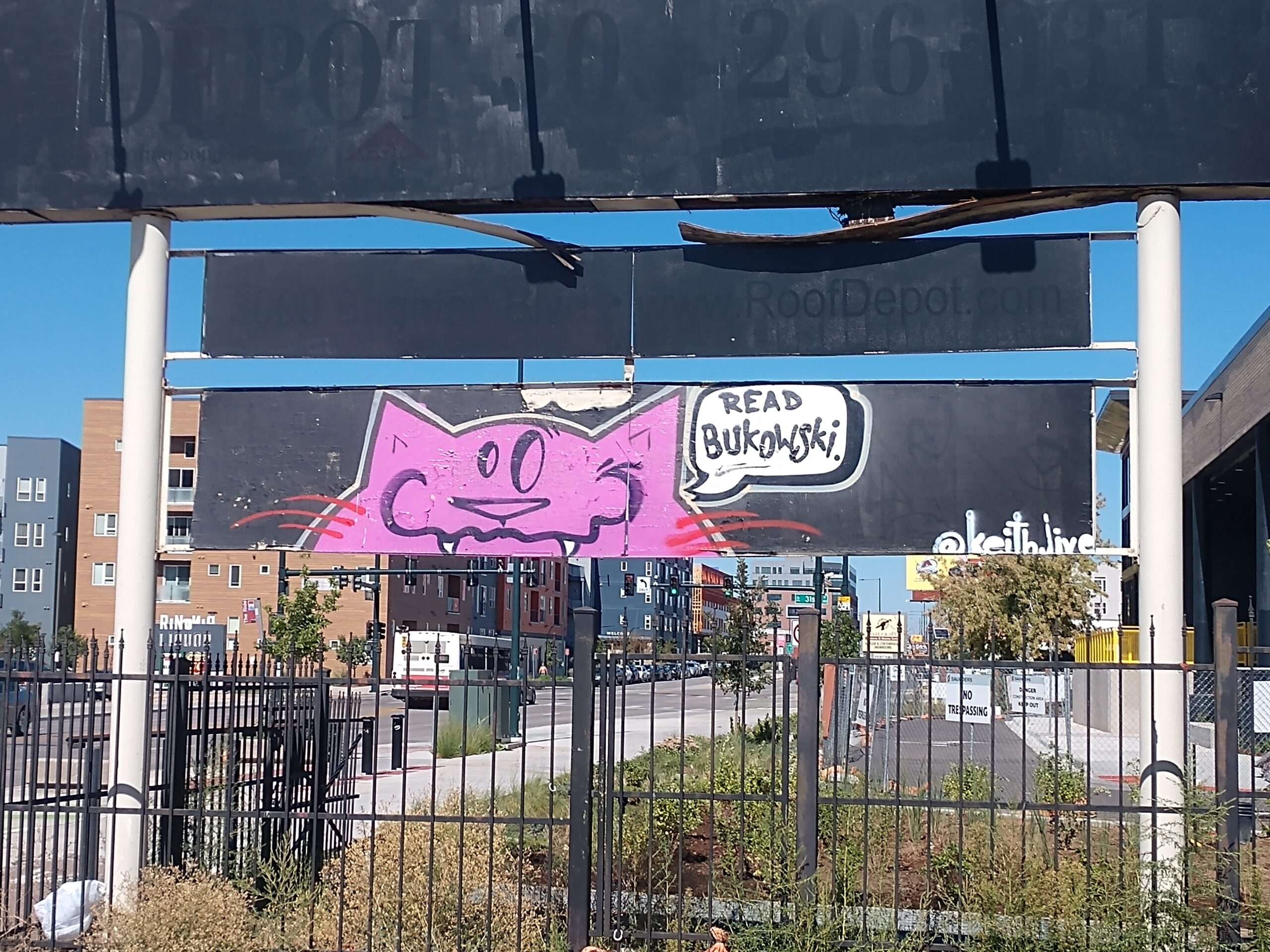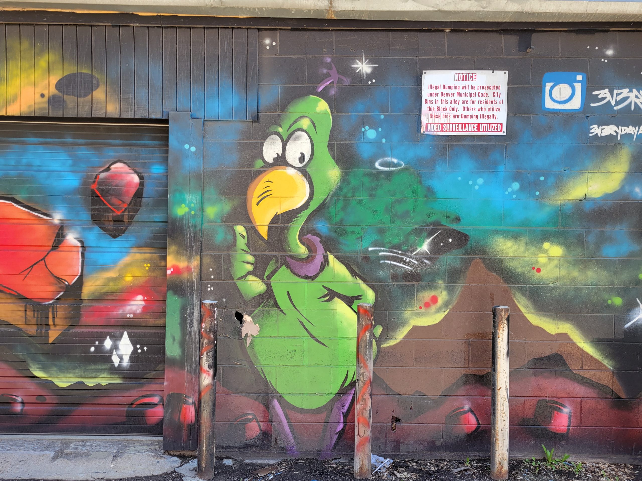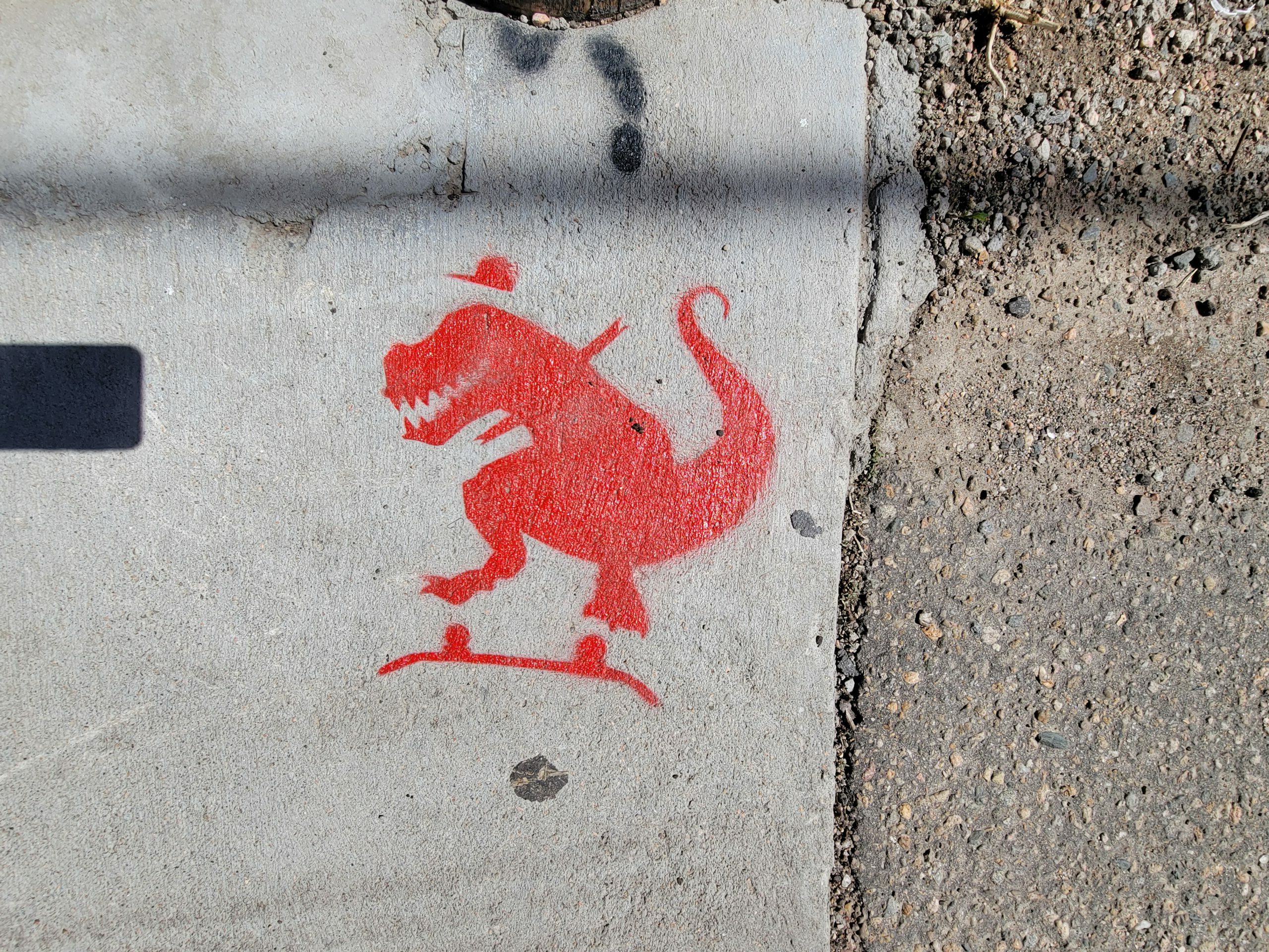 This charming, small-scale piece of street art features a crisp red stencil of a Tyrannosaurus Rex wearing a baseball cap and shredding on a skateboard. Found right on a concrete sidewalk in Denver, this playful detail proves that the city's vibrant, whimsical art scene extends all the way down to the pavement beneath your feet.
