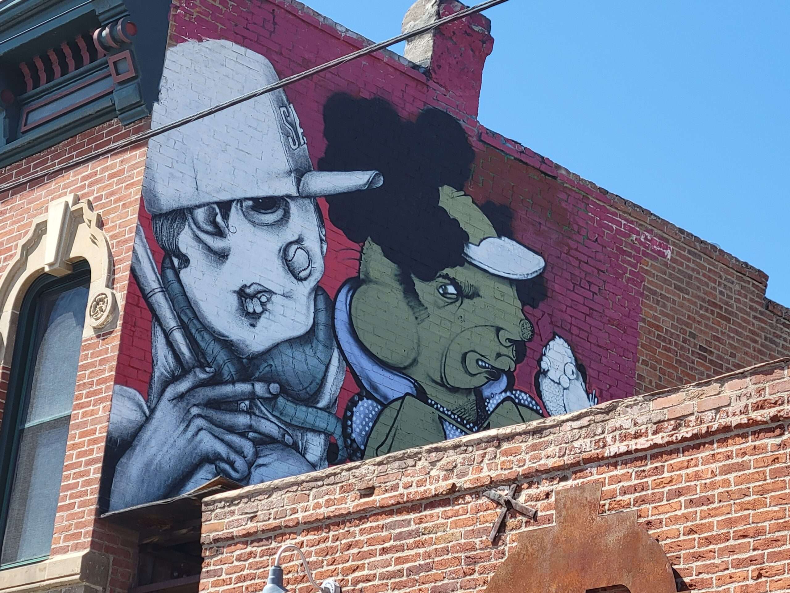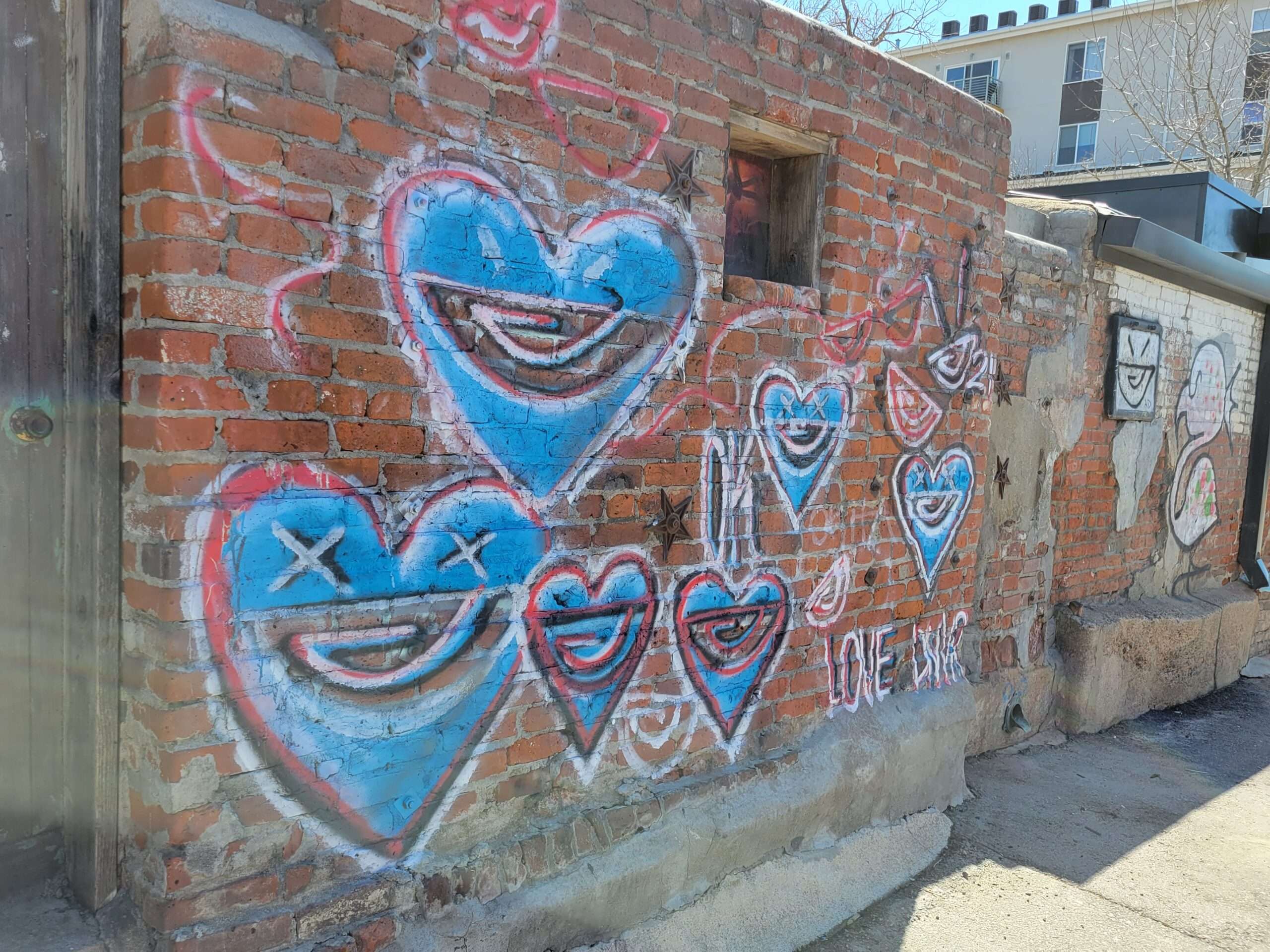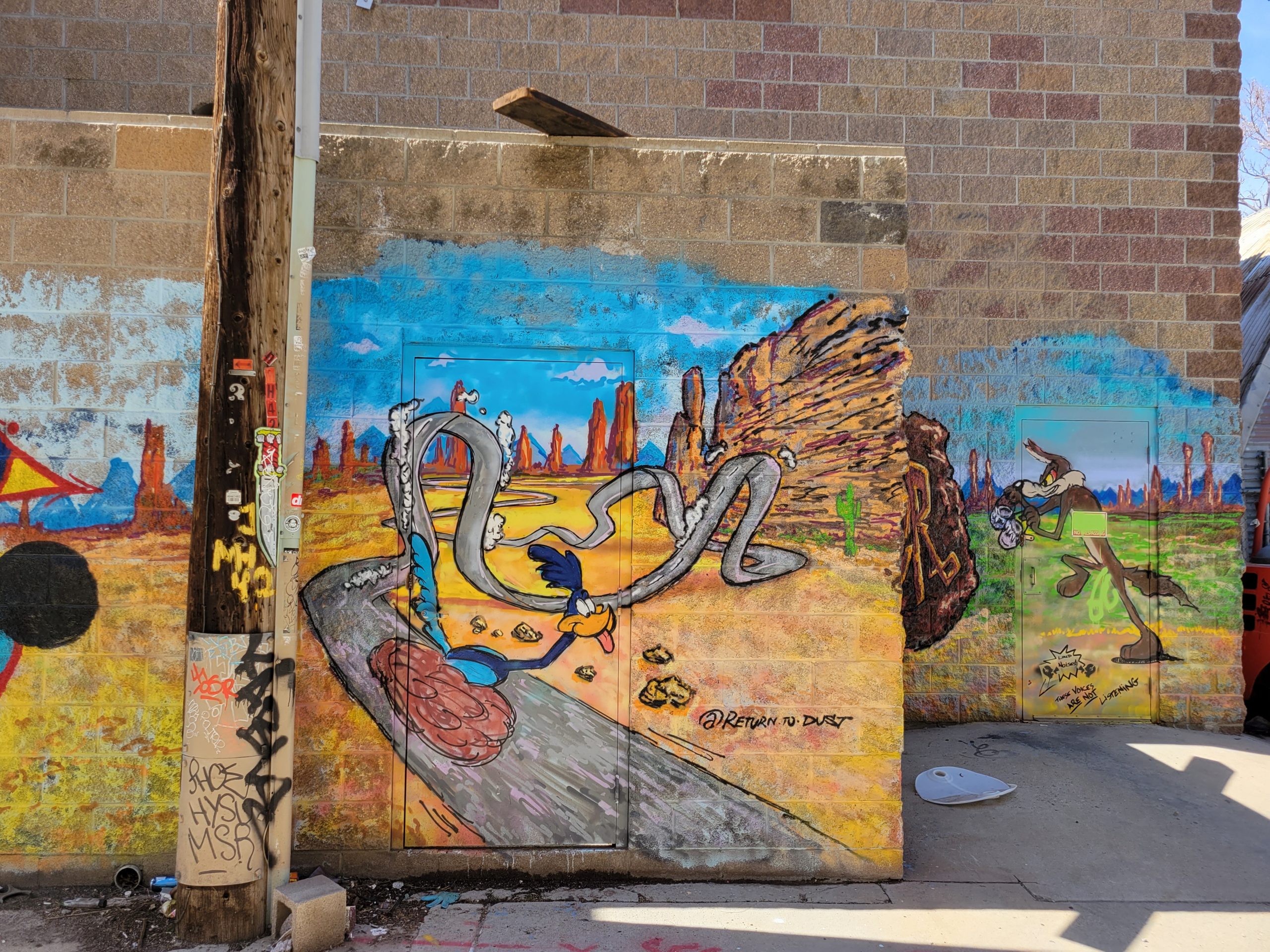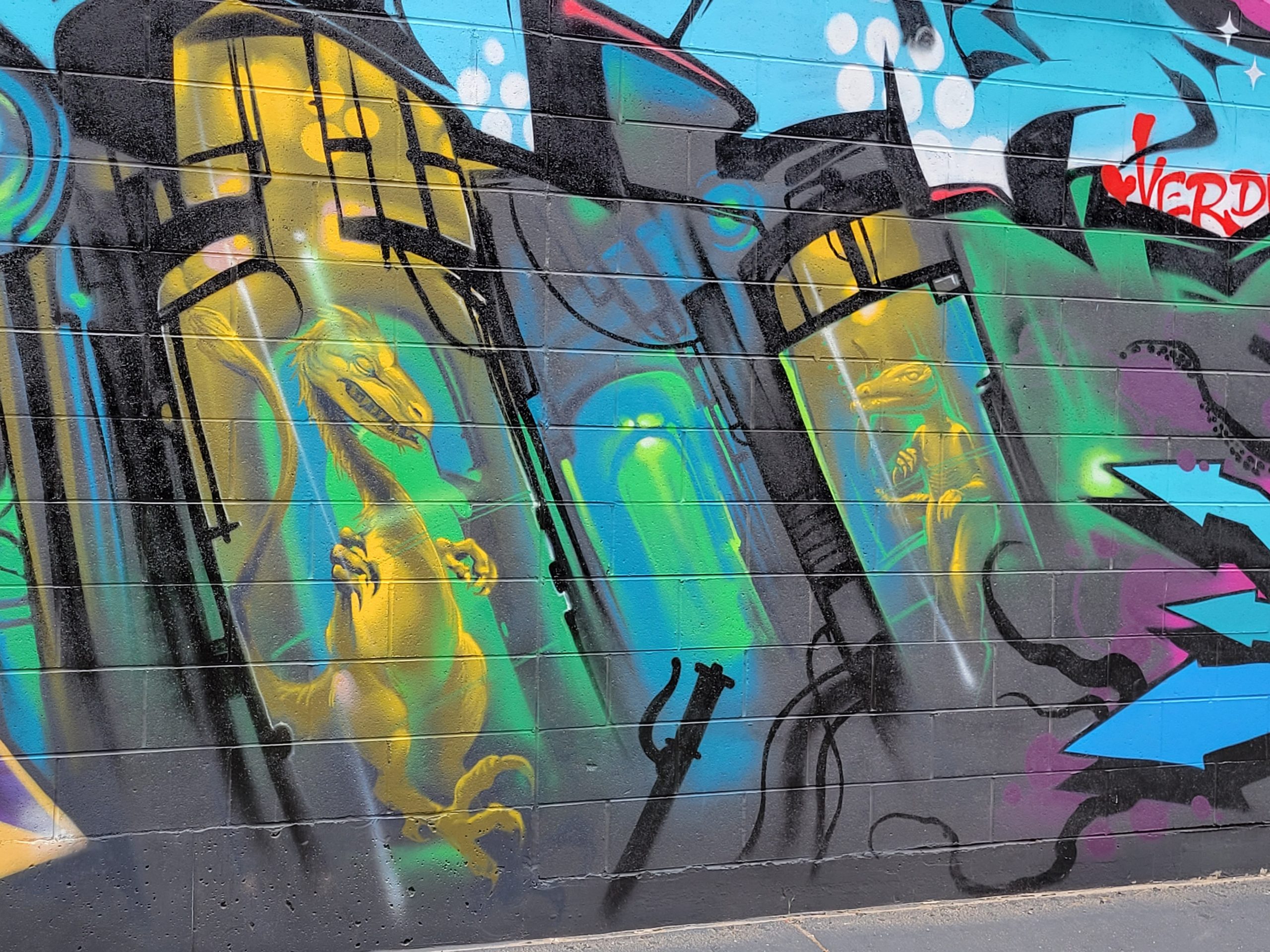This charming, small-scale piece of street art features a crisp red stencil of a Tyrannosaurus Rex wearing a baseball cap and shredding on a skateboard. Found right on a concrete sidewalk in Denver, this playful detail proves that the city's vibrant, whimsical art scene extends all the way down to the pavement beneath your feet.