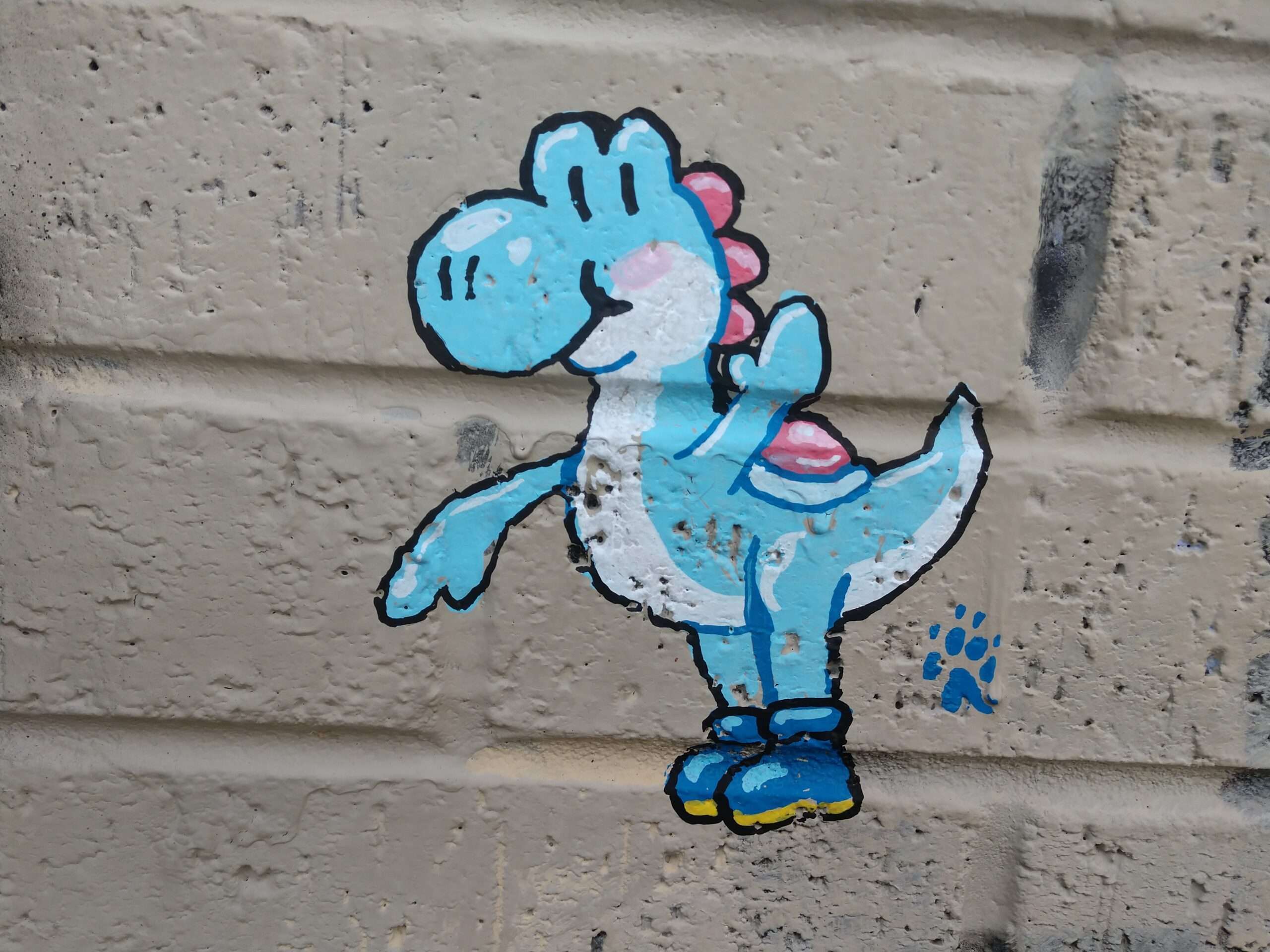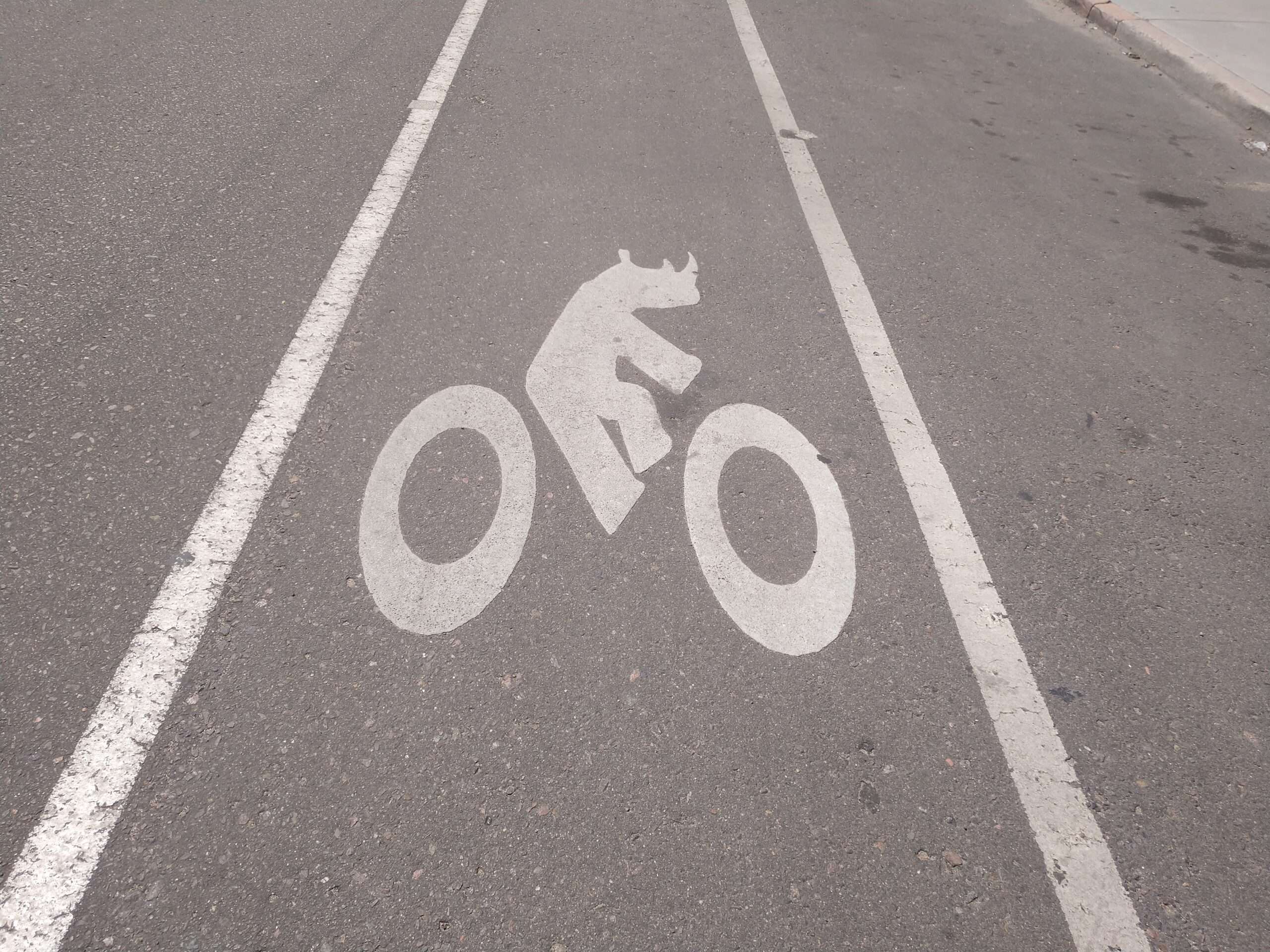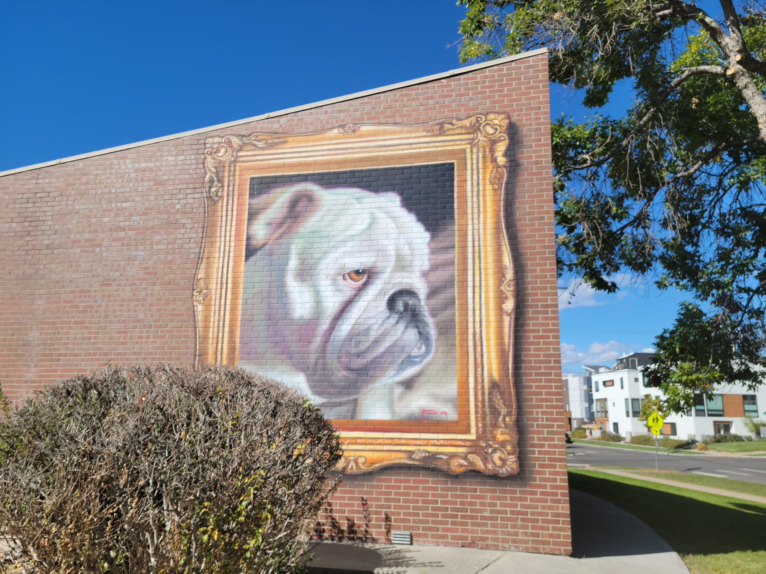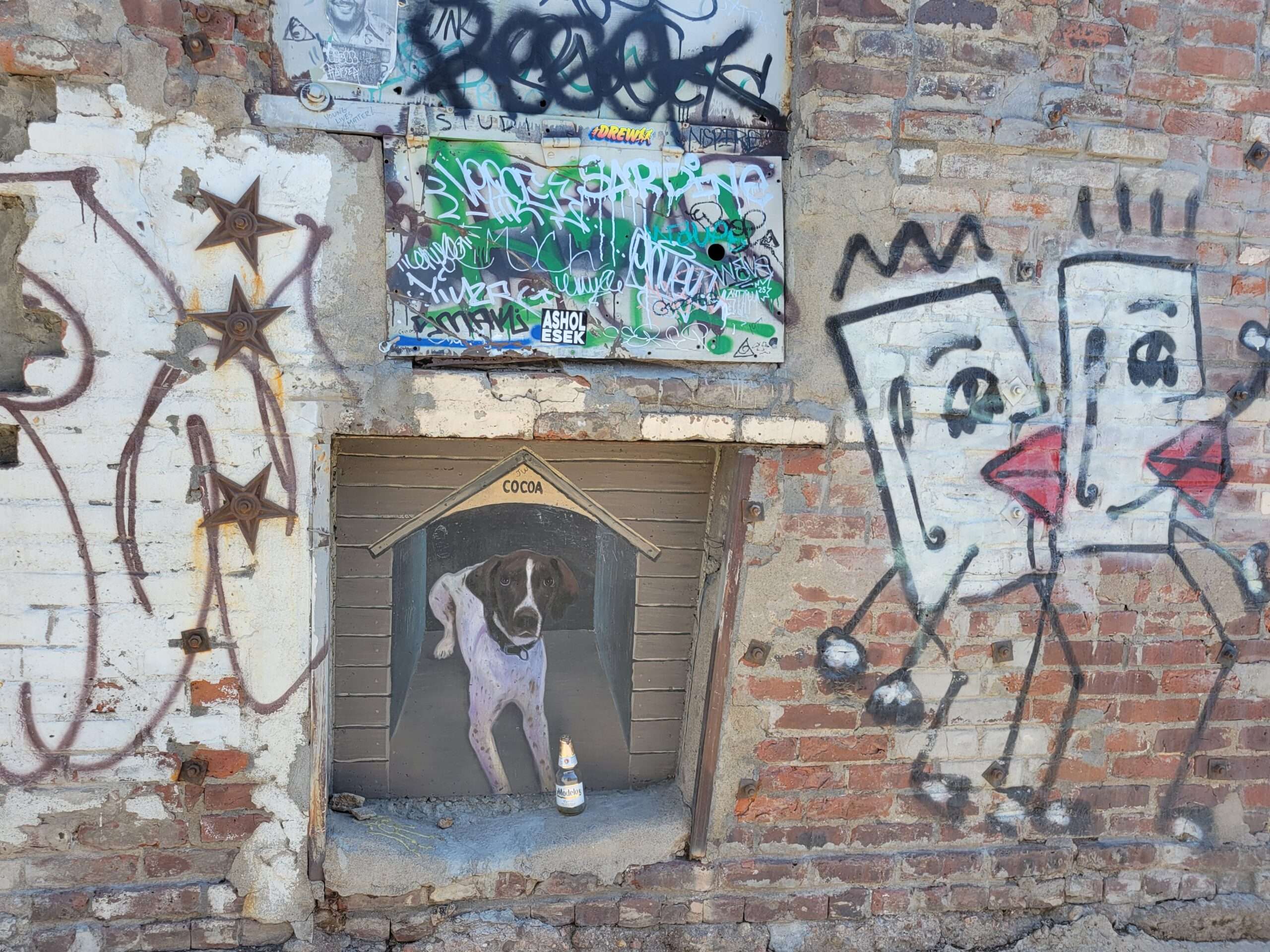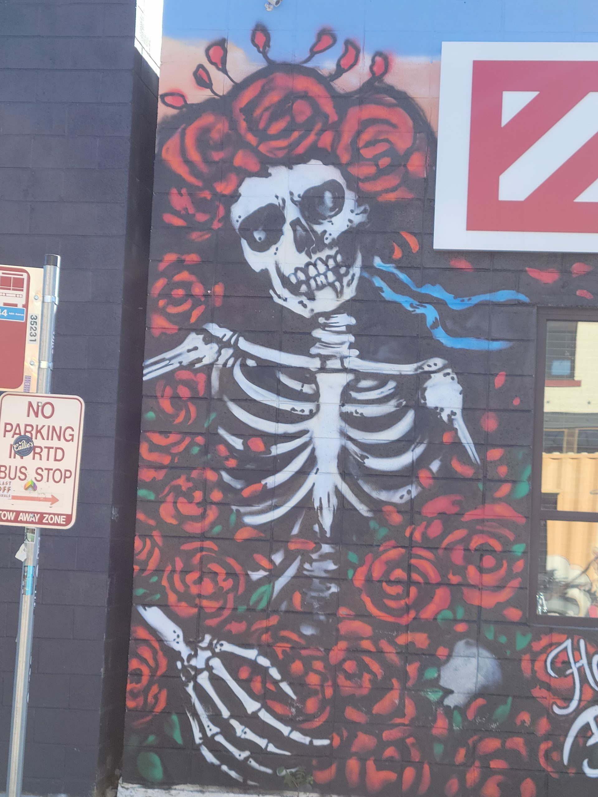 This charming, small-scale piece of street art features a crisp red stencil of a Tyrannosaurus Rex wearing a baseball cap and shredding on a skateboard. Found right on a concrete sidewalk in Denver, this playful detail proves that the city's vibrant, whimsical art scene extends all the way down to the pavement beneath your feet.