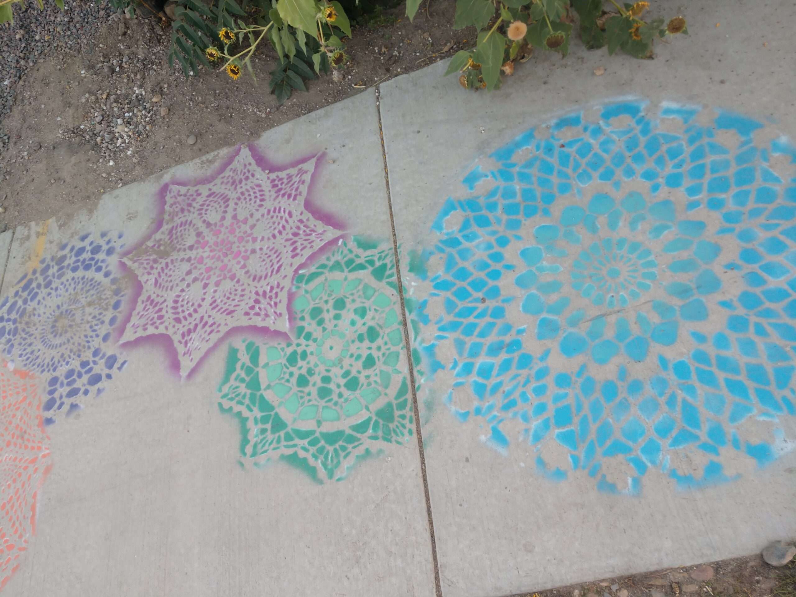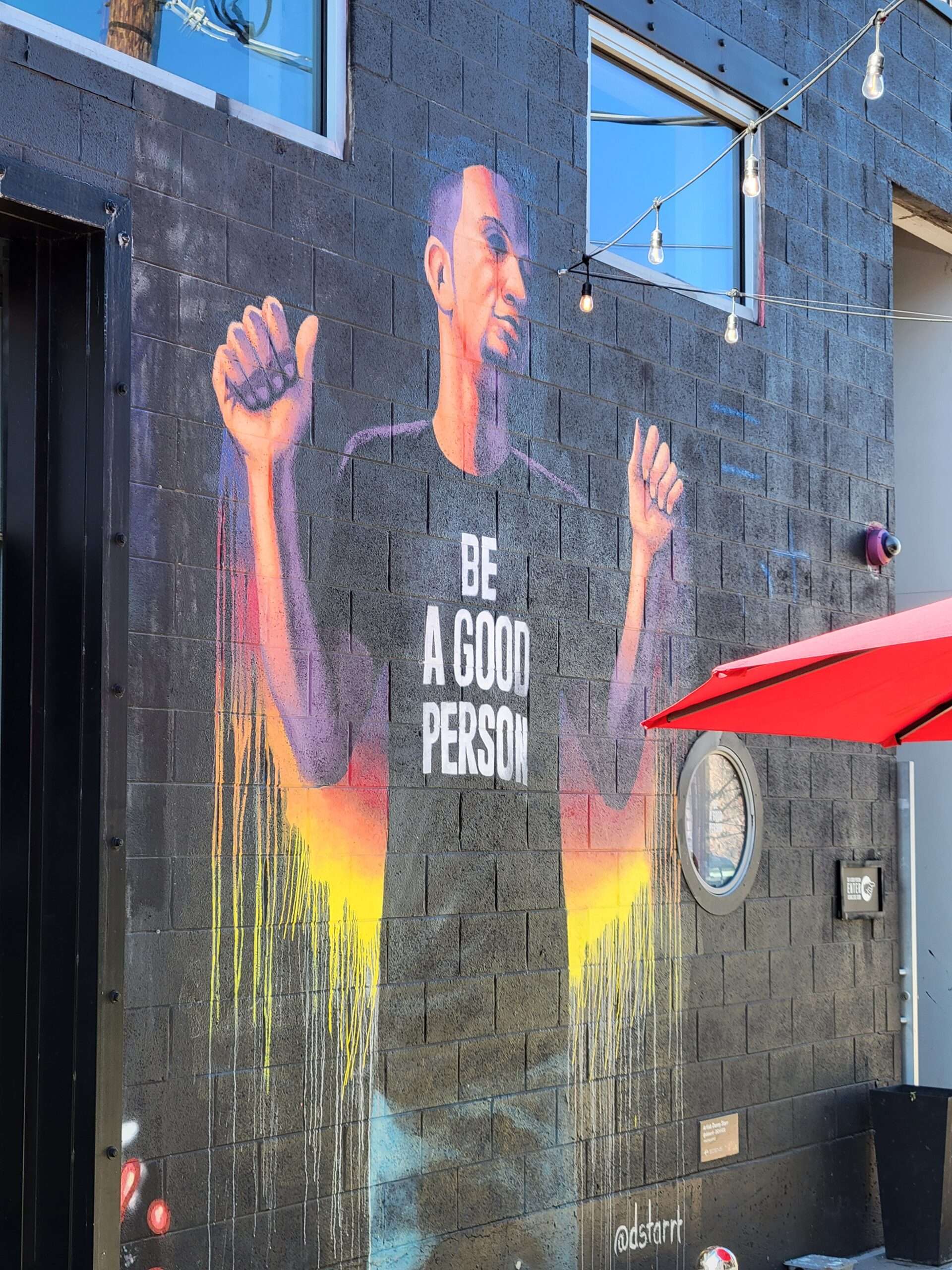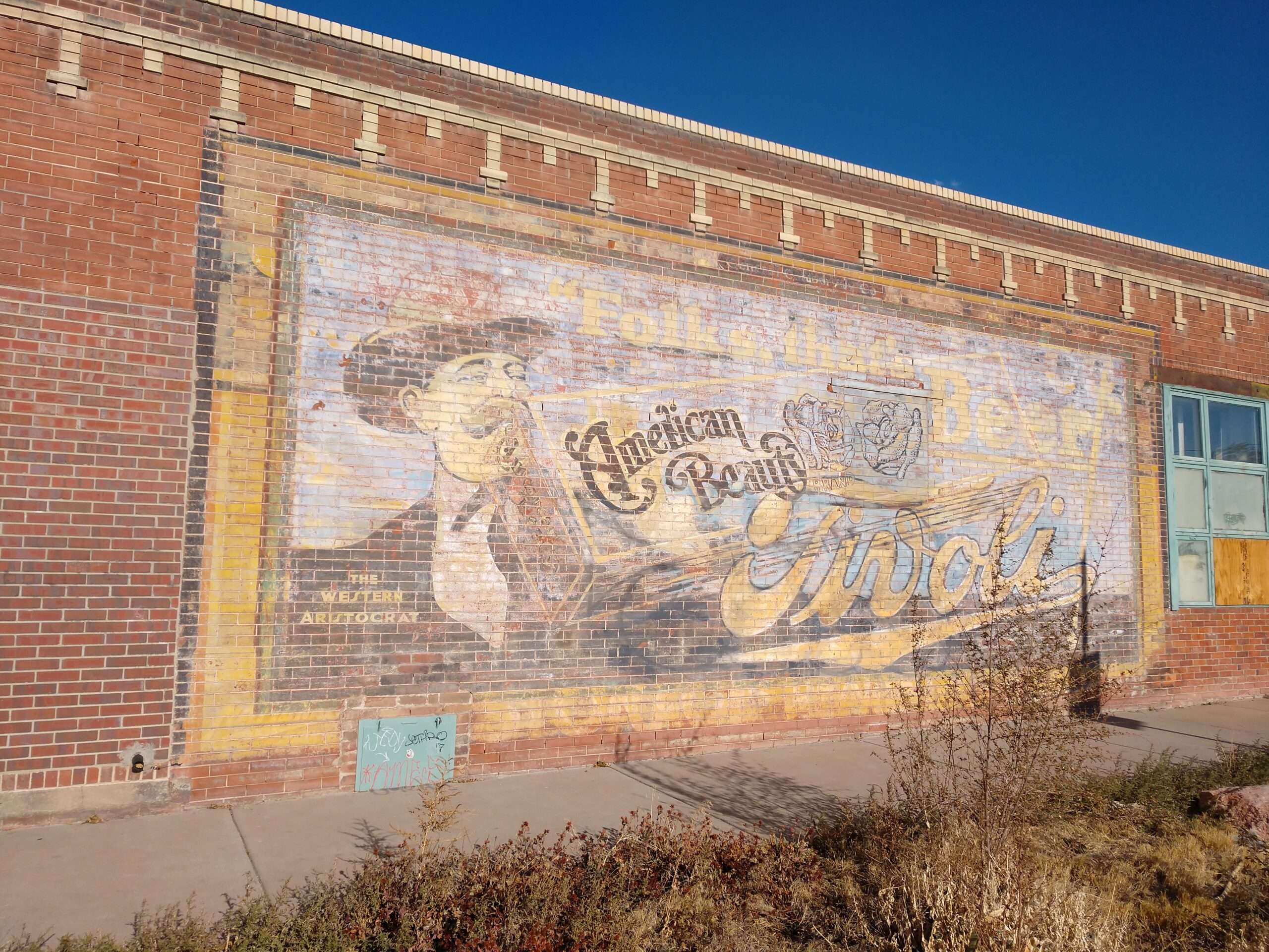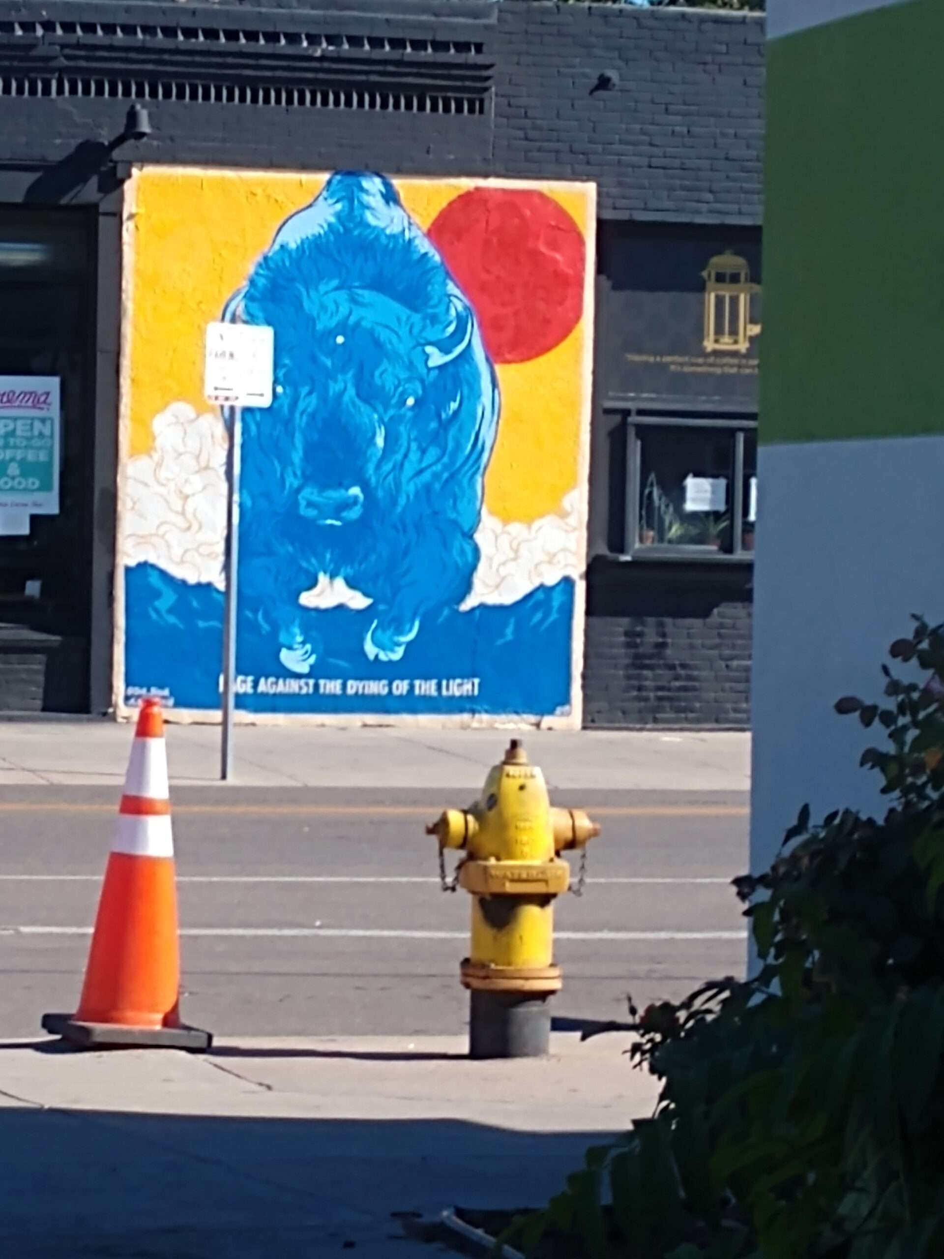 This charming, small-scale piece of street art features a crisp red stencil of a Tyrannosaurus Rex wearing a baseball cap and shredding on a skateboard. Found right on a concrete sidewalk in Denver, this playful detail proves that the city's vibrant, whimsical art scene extends all the way down to the pavement beneath your feet.