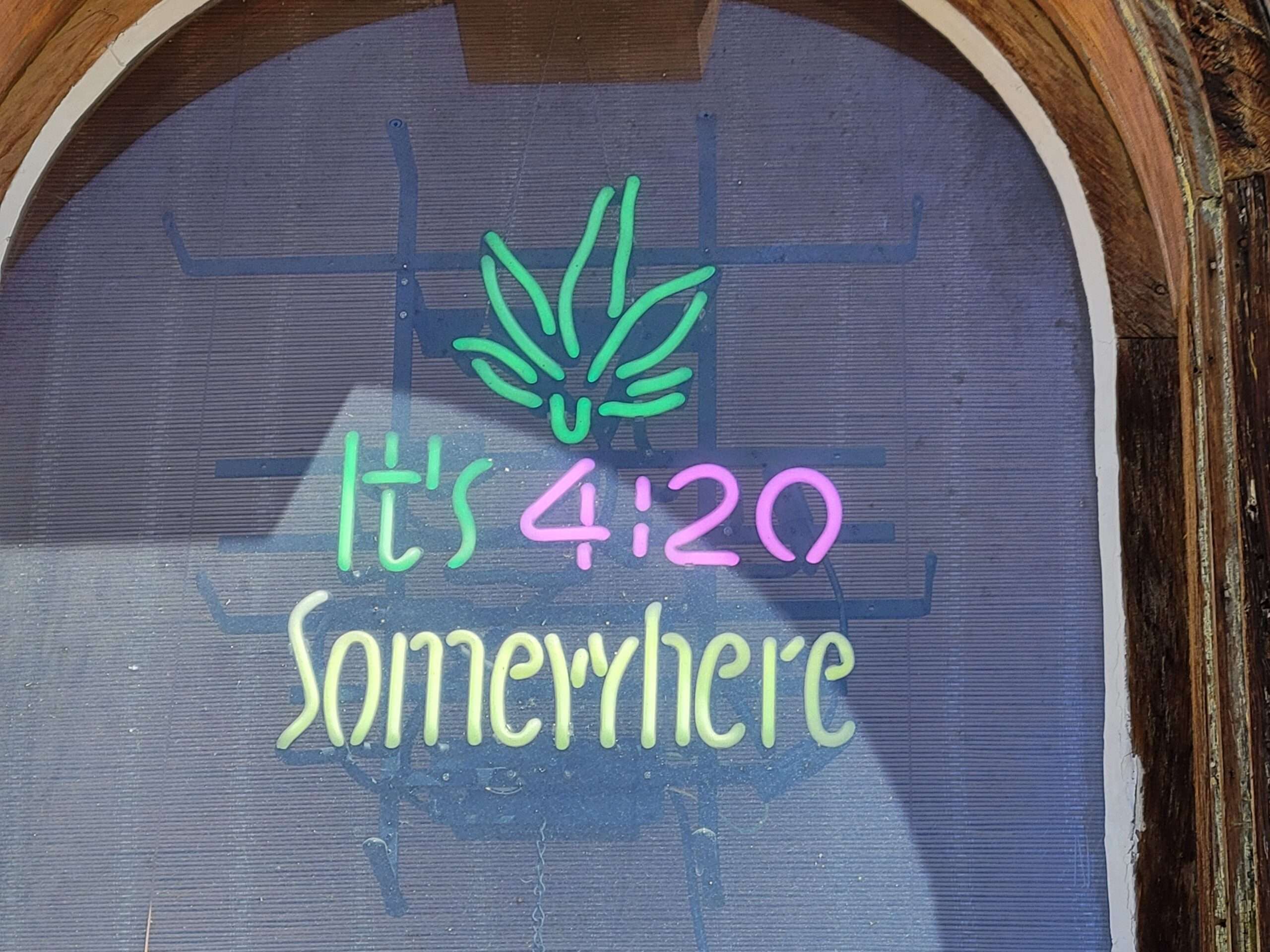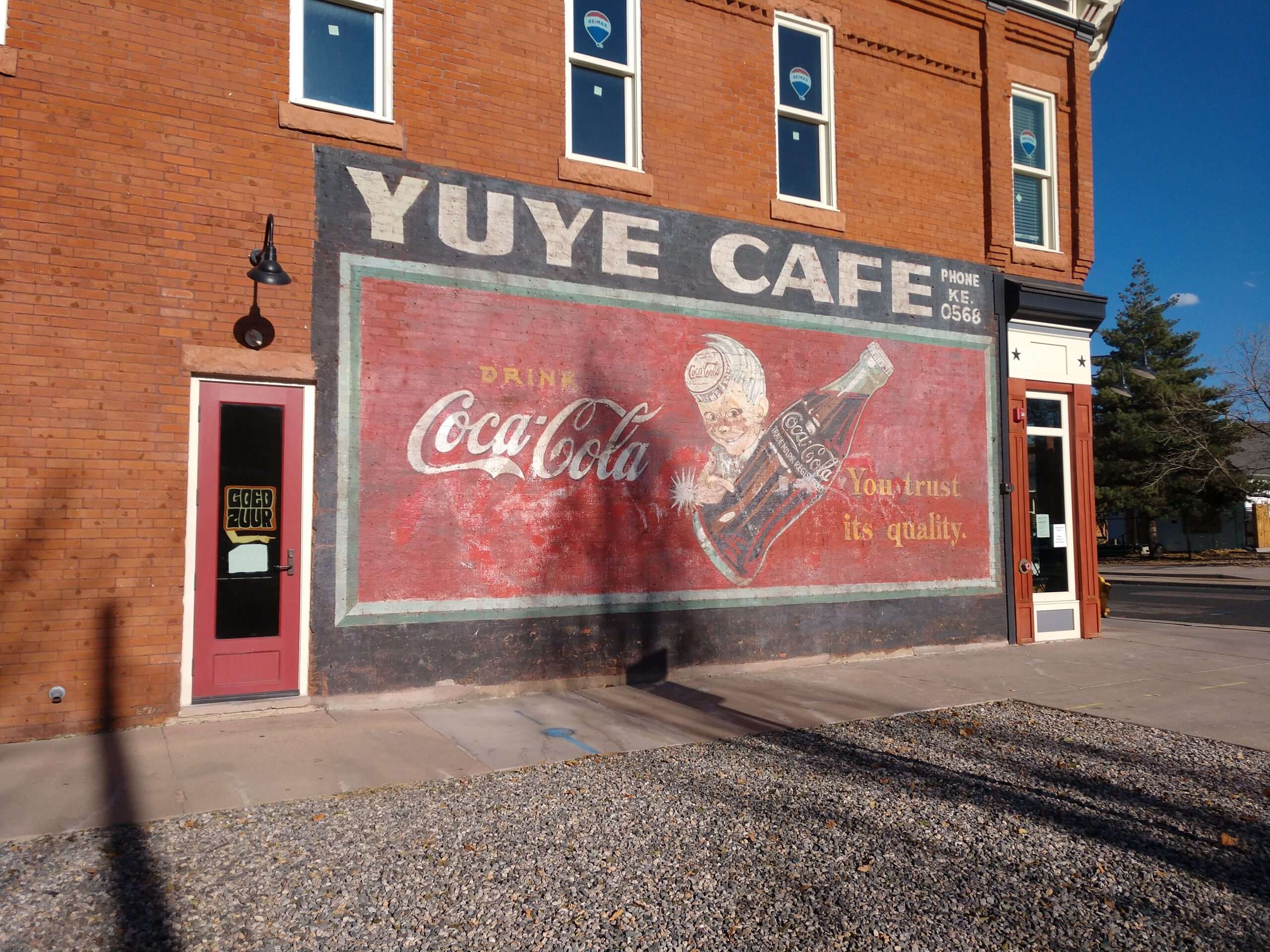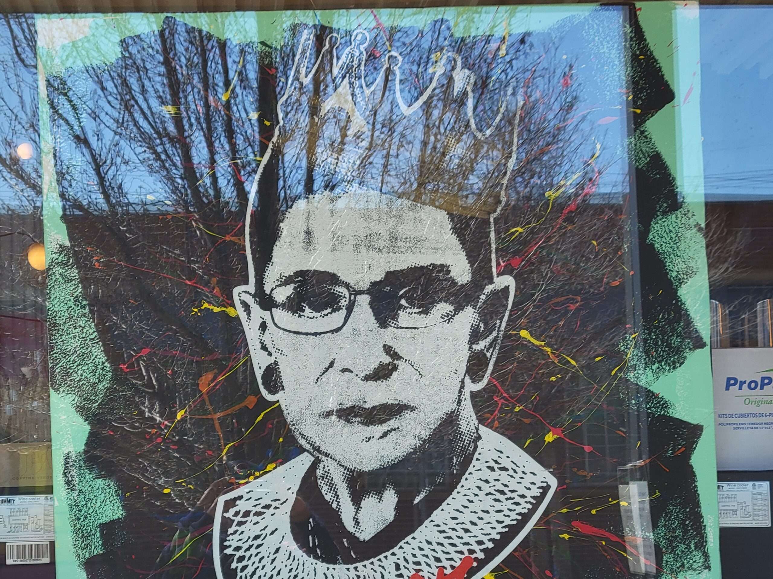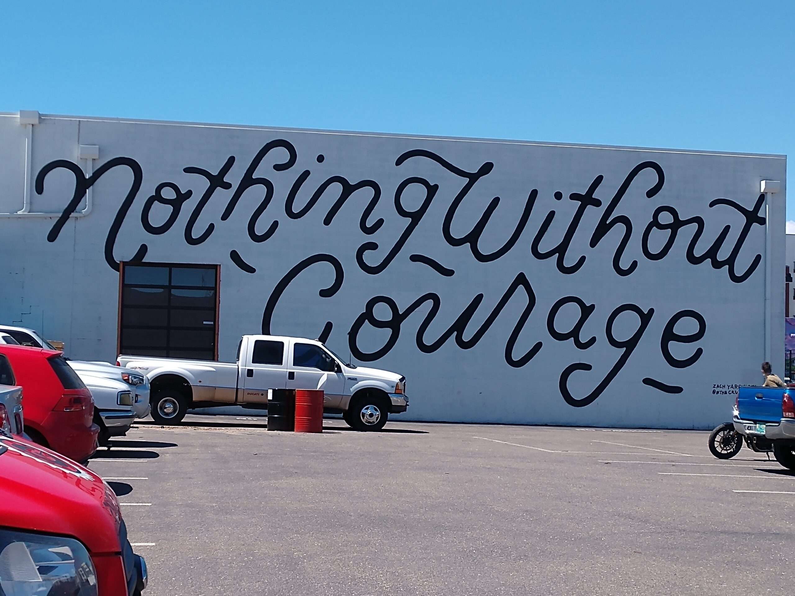 This charming, small-scale piece of street art features a crisp red stencil of a Tyrannosaurus Rex wearing a baseball cap and shredding on a skateboard. Found right on a concrete sidewalk in Denver, this playful detail proves that the city's vibrant, whimsical art scene extends all the way down to the pavement beneath your feet.