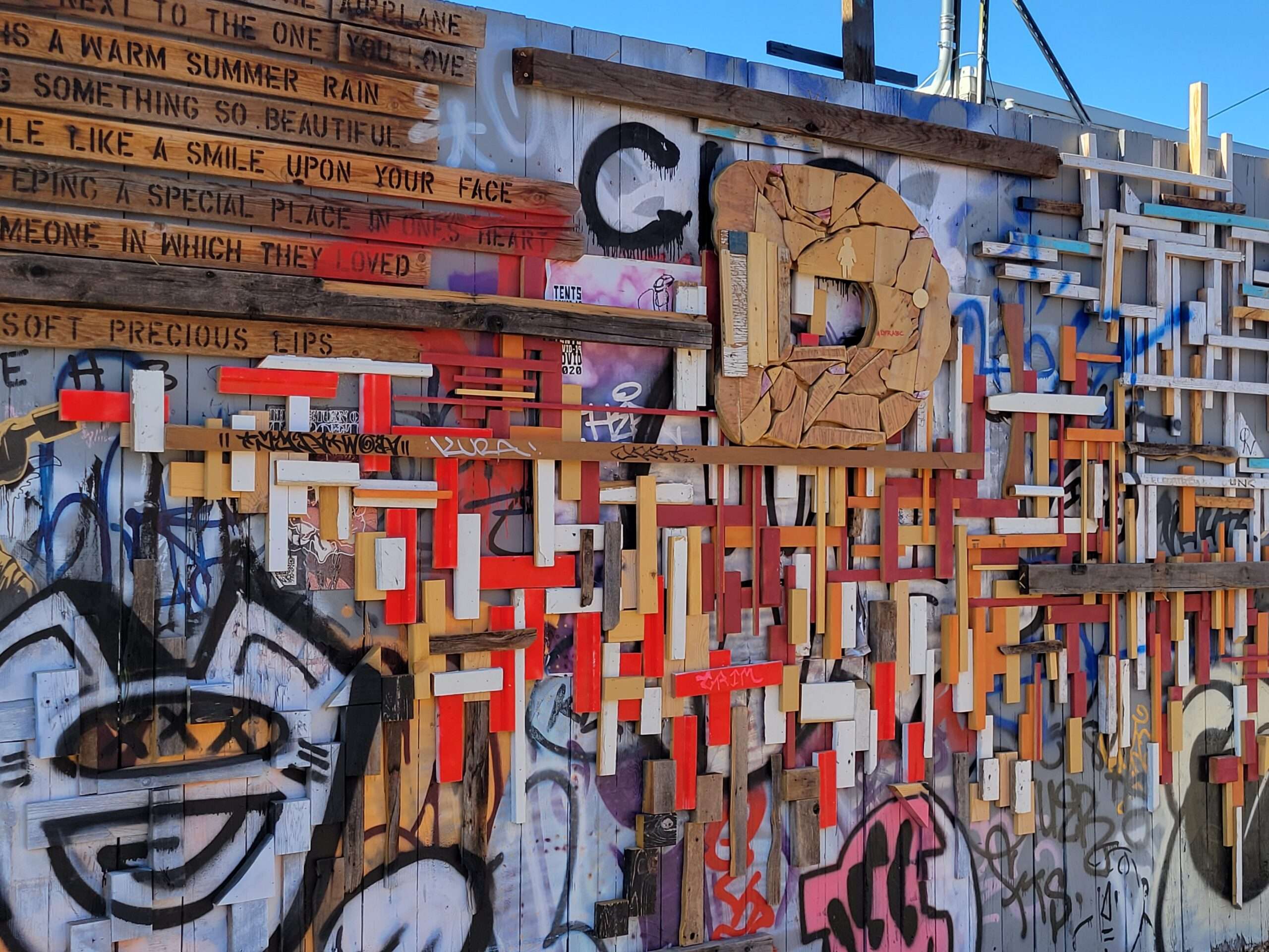 This photograph captures a large-scale, mixed-media wall installation on a weathered grey wooden fence. The artwork consists of numerous wooden planks and geometric blocks in natural wood tones, orange, red, and white, arranged in a dense, overlapping pattern. In the upper-left corner, several horizontal planks are inscribed with poetic text, including phrases like "A WARM SUMMER RAIN," "SOMETHING SO BEAUTIFUL," and "SOFT PRECIOUS LIPS". A prominent circular feature, possibly a letter "D," made of curved wooden sections, is located on the right side of the main cluster. The background fence is covered in various tags and graffiti, including a large stencil of a character with "X" eyes in the lower-left corner. The scene is captured in bright daylight under a clear blue sky.