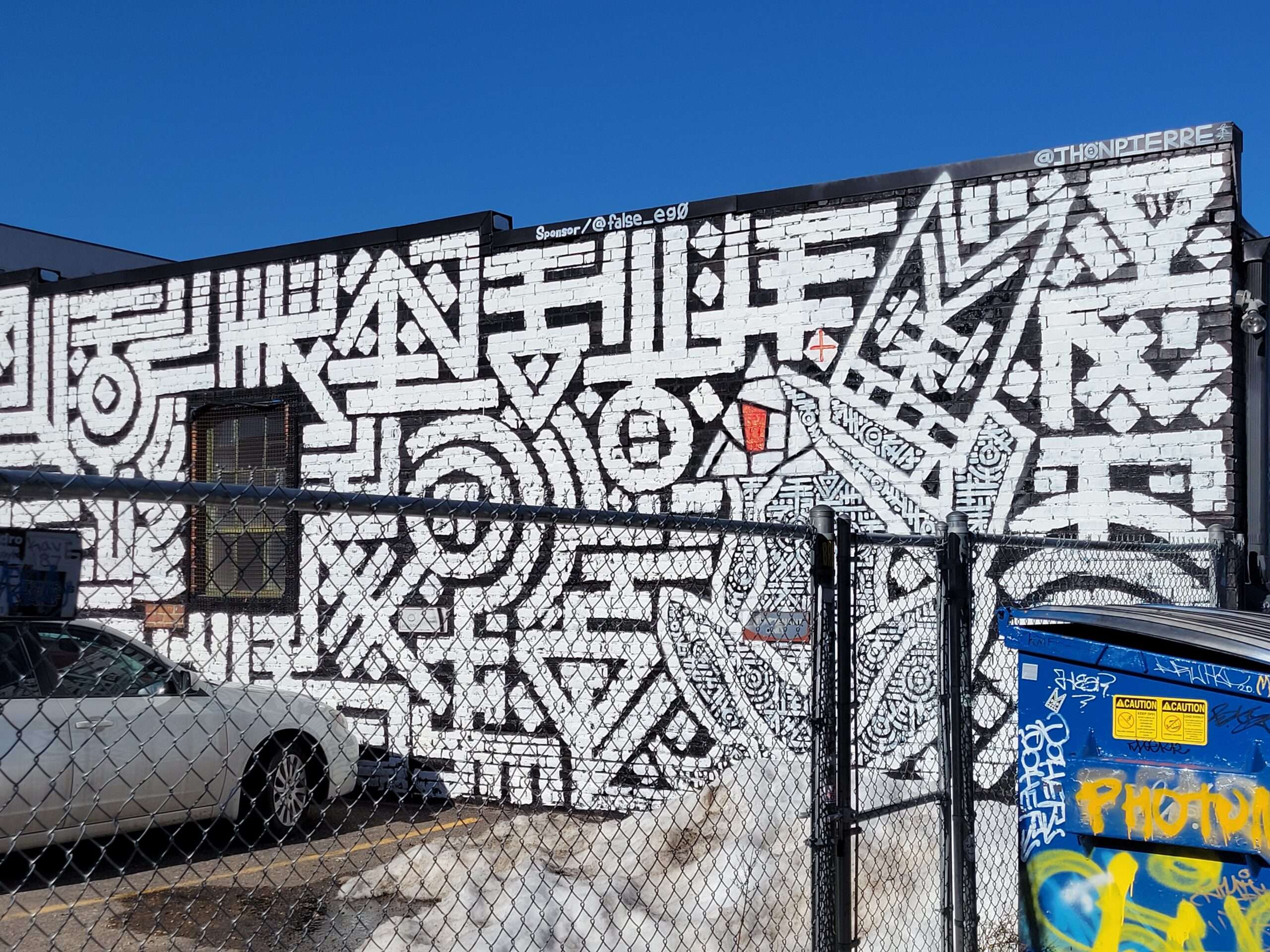 This photograph captures a large-scale mural painted on a black brick wall. The artwork is composed entirely of white paint, forming a dense and intricate pattern of stylized symbols, sharp-edged geometric shapes, and flowing calligraphic lines that cover nearly the entire facade. Near the top edge of the wall, the text "Sponsor / @false_eg0" is visible, and the handle "@THONPTERRE" is written in the upper right corner. The mural is viewed through a chain-link fence in the foreground. A white sedan is partially visible on the left, and a blue dumpster with yellow graffiti is situated on the right. A pile of melting snow rests at the base of the fence under a clear, bright blue sky.