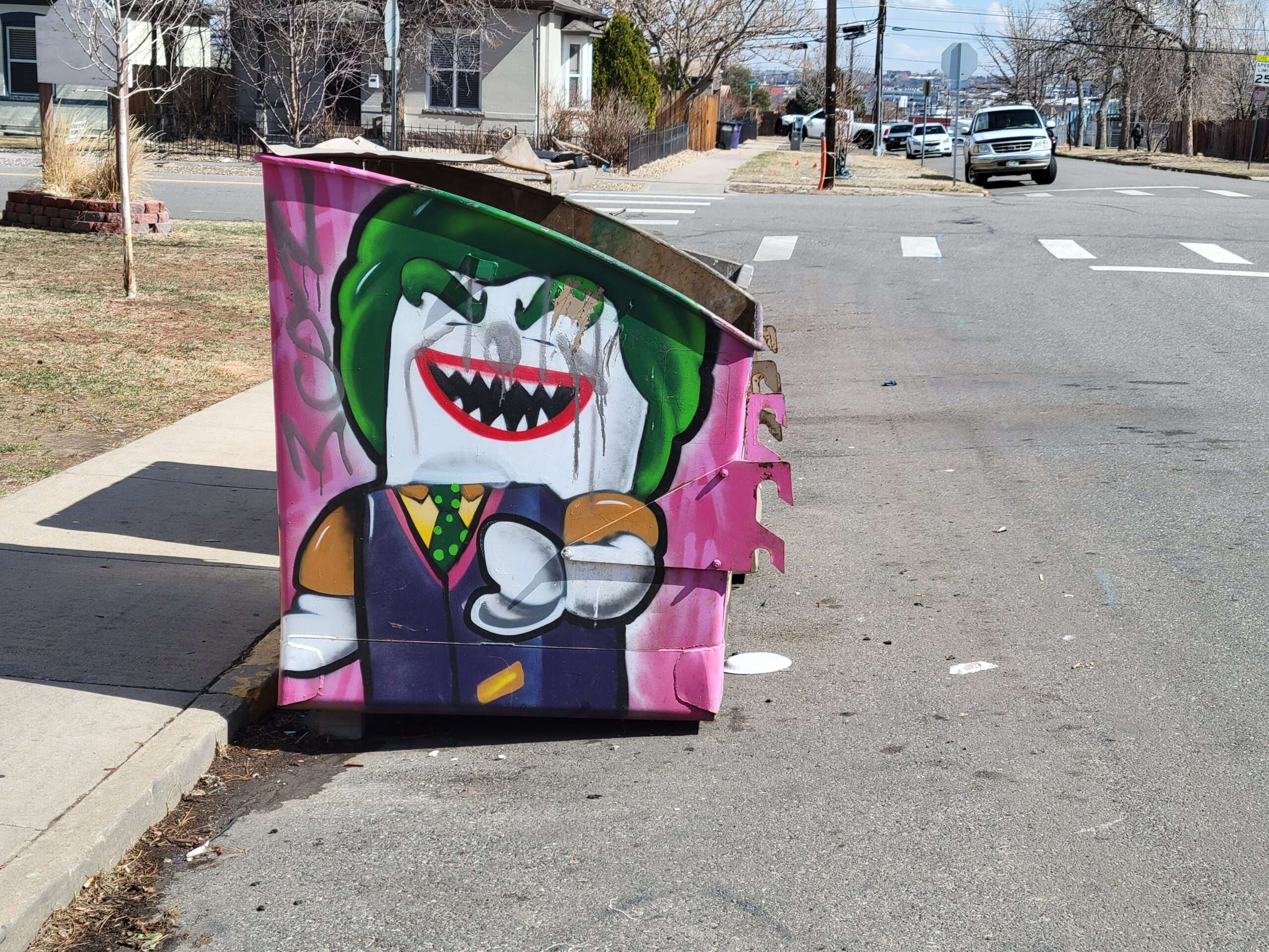 This photograph captures a pink metal dumpster situated at the corner of a residential street intersection. The side of the bin features a stylized, cartoonish depiction of the Joker with neon green hair, a white face, and a large, jagged red smile. The dumpster is placed on an asphalt patch next to a concrete sidewalk. In the background, a suburban street stretches into the distance, lined with houses, bare trees, and parked vehicles under a clear sky.
