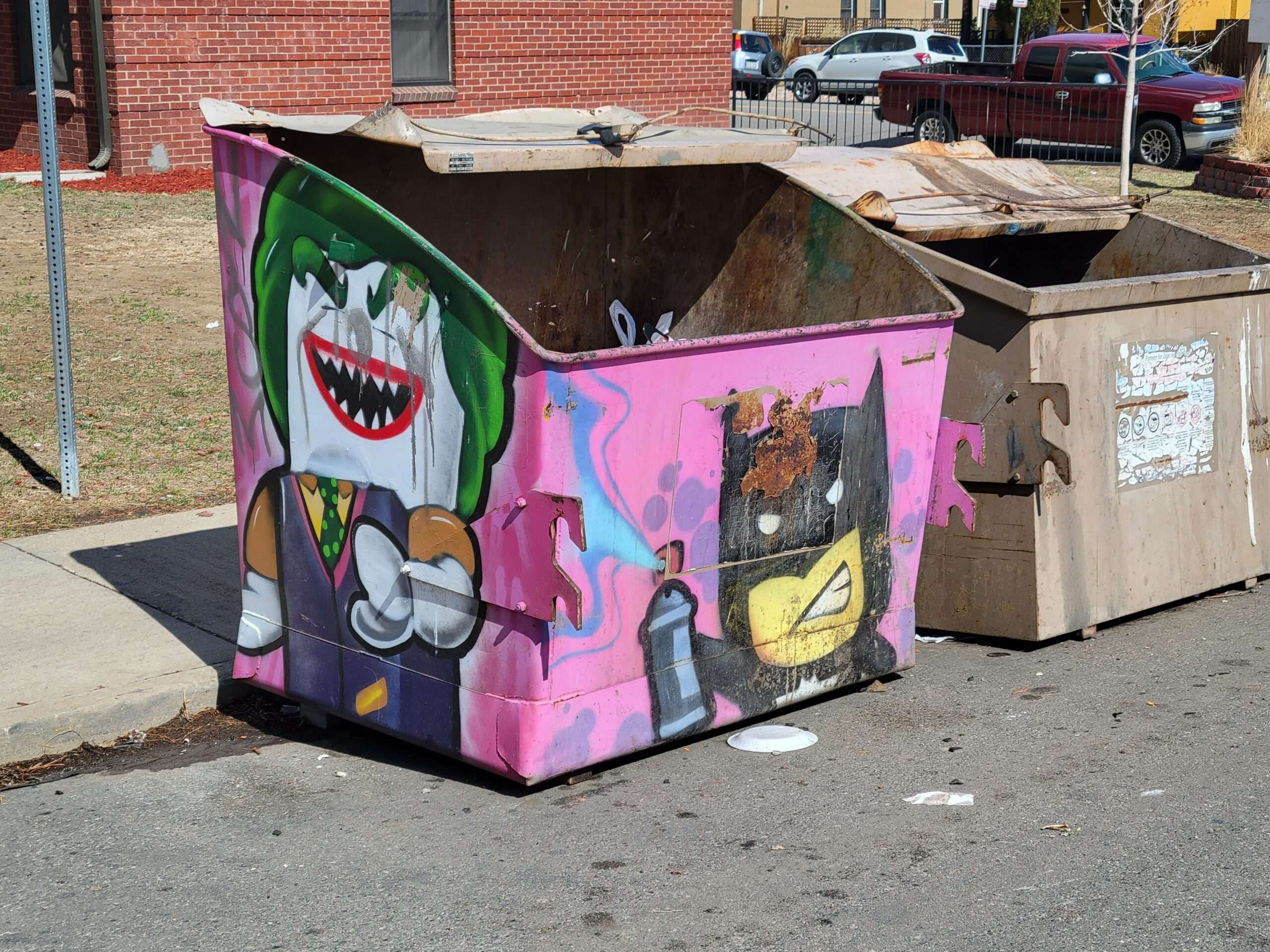 This photograph captures a pink-painted metal dumpster located in an asphalt parking area. The left side of the bin features a stylized, cartoonish Joker with vibrant green hair, a white face, and a wide, red-rimmed grin with sharp teeth. On the right, a blocky, black-and-yellow Batman character is depicted holding a spray-paint can and releasing a blue cloud of paint toward the Joker. Next to the pink bin sits a weathered, unpainted tan dumpster. The background shows a red brick building and several parked vehicles, including a red pickup truck, under a bright blue sky.