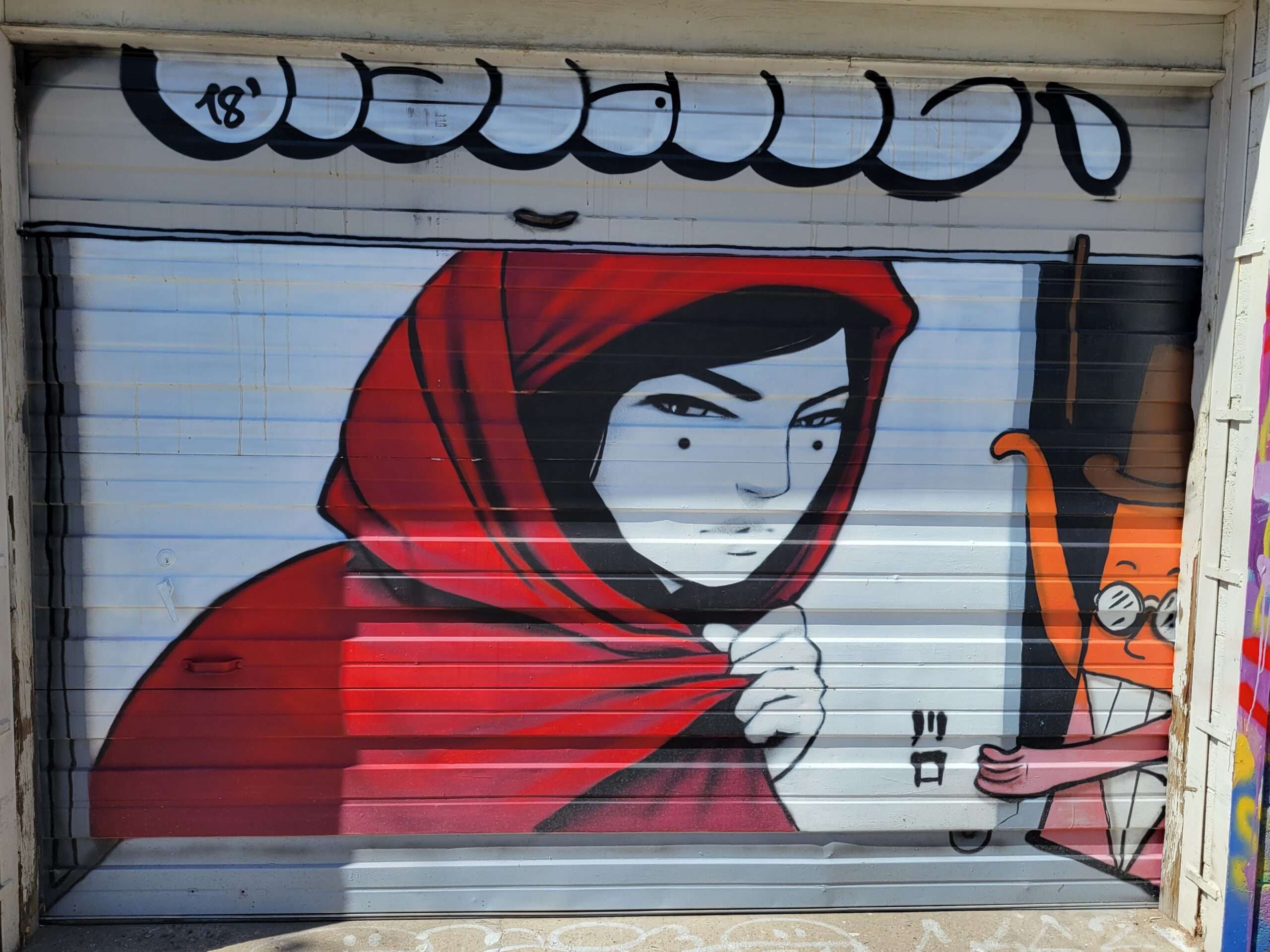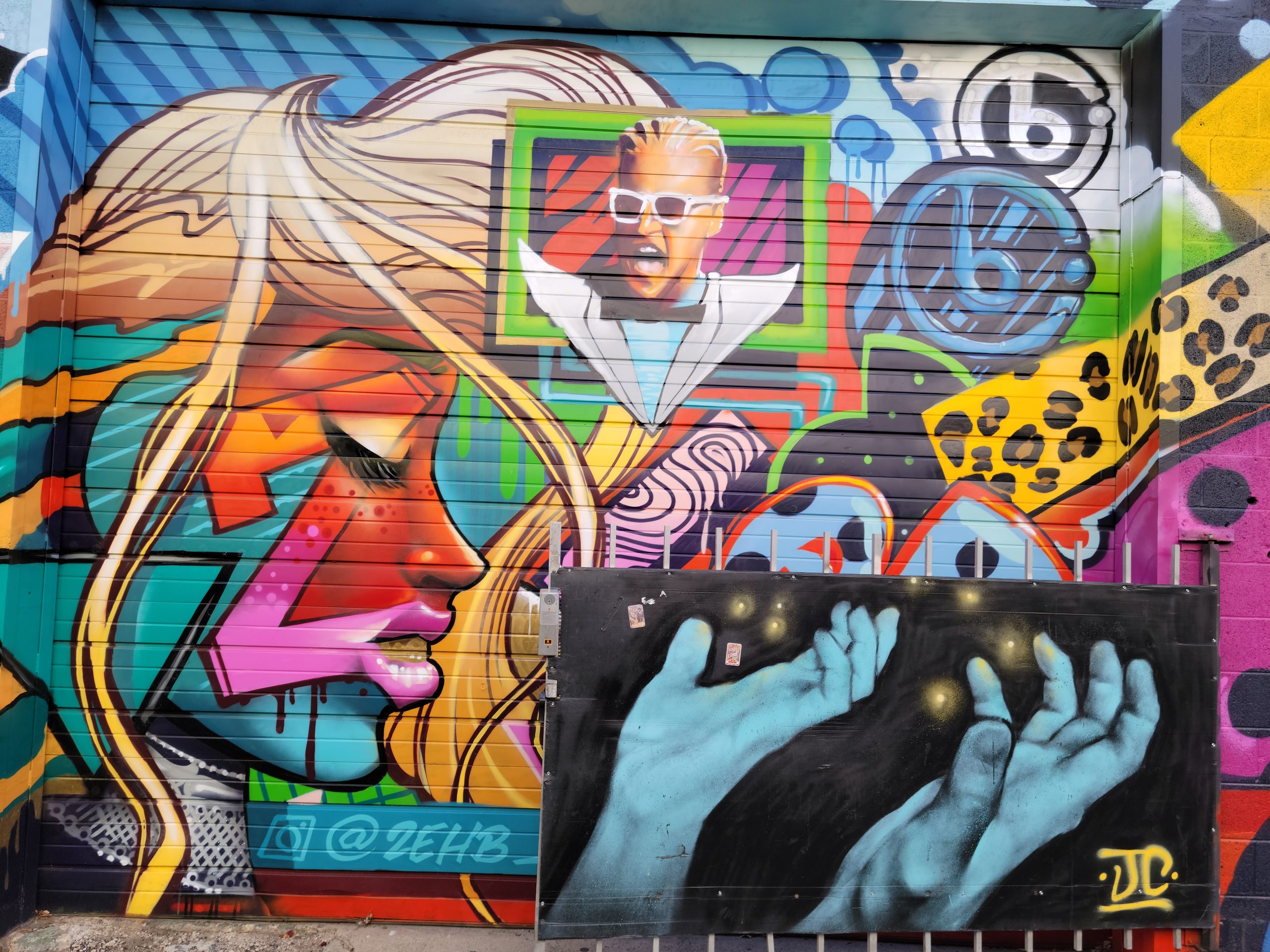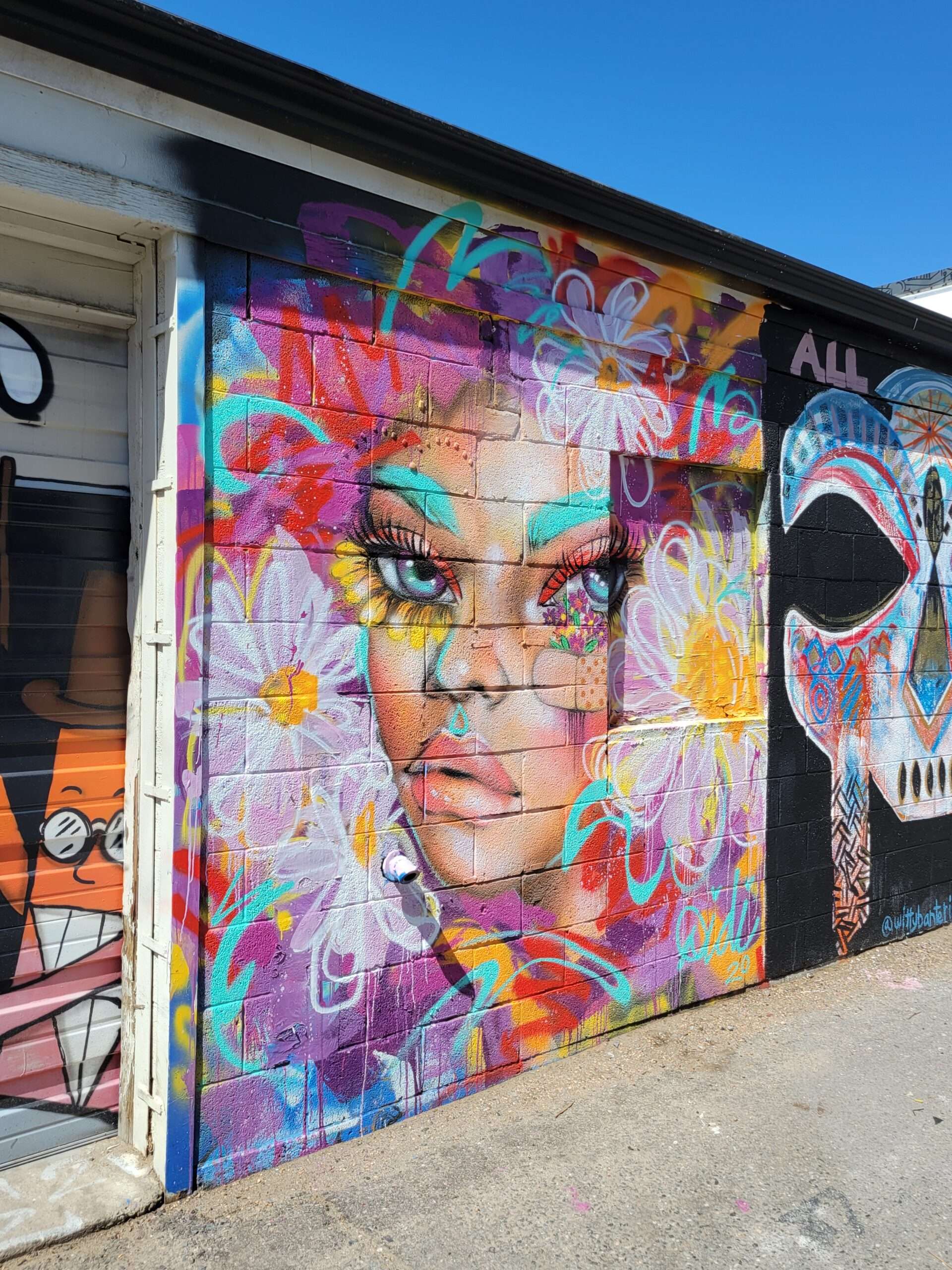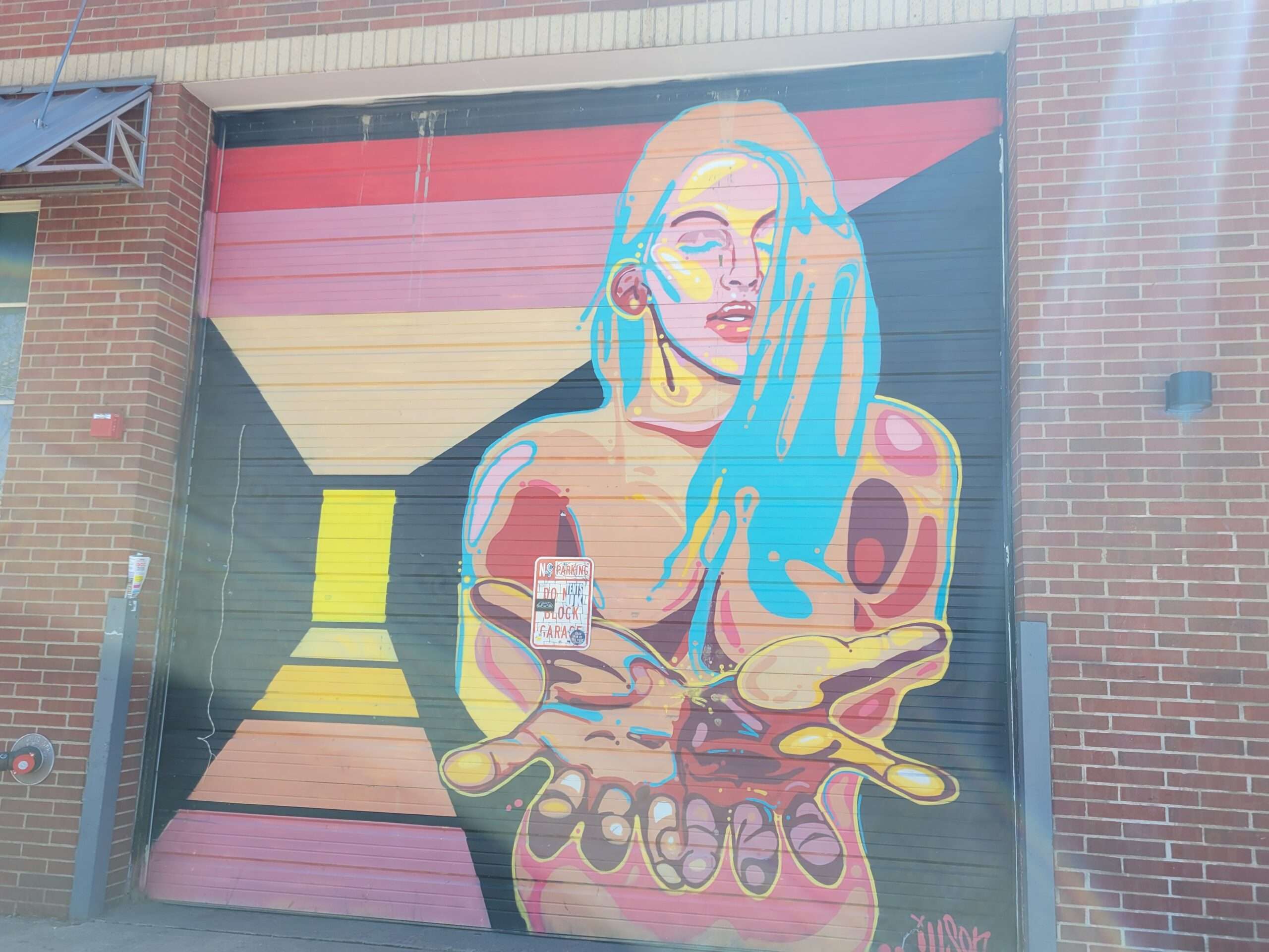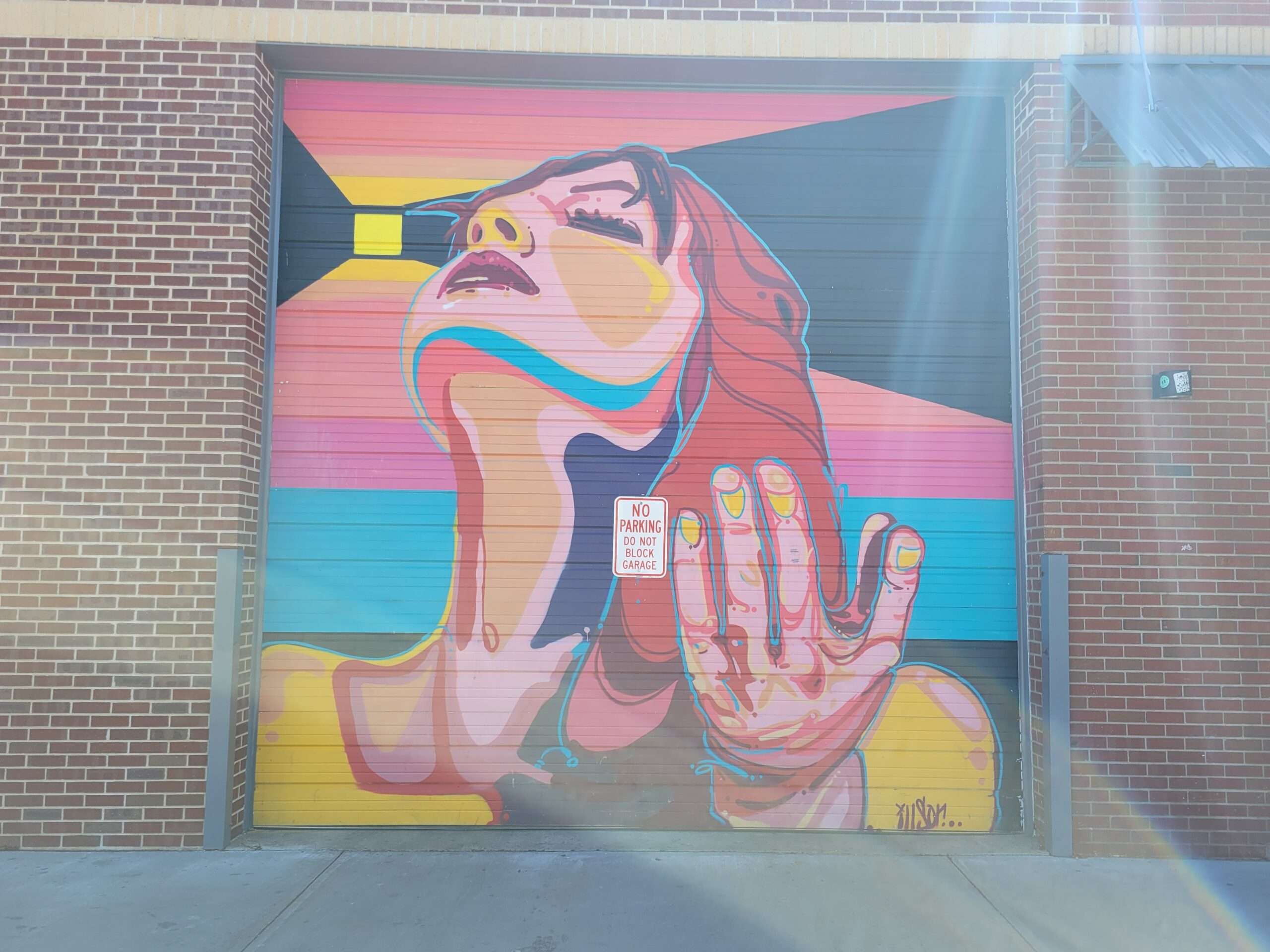 Large-scale colorful mural on a corrugated garage door featuring Max Headroom in a television frame, a profile of a woman with long blonde hair, and glowing blue hands.