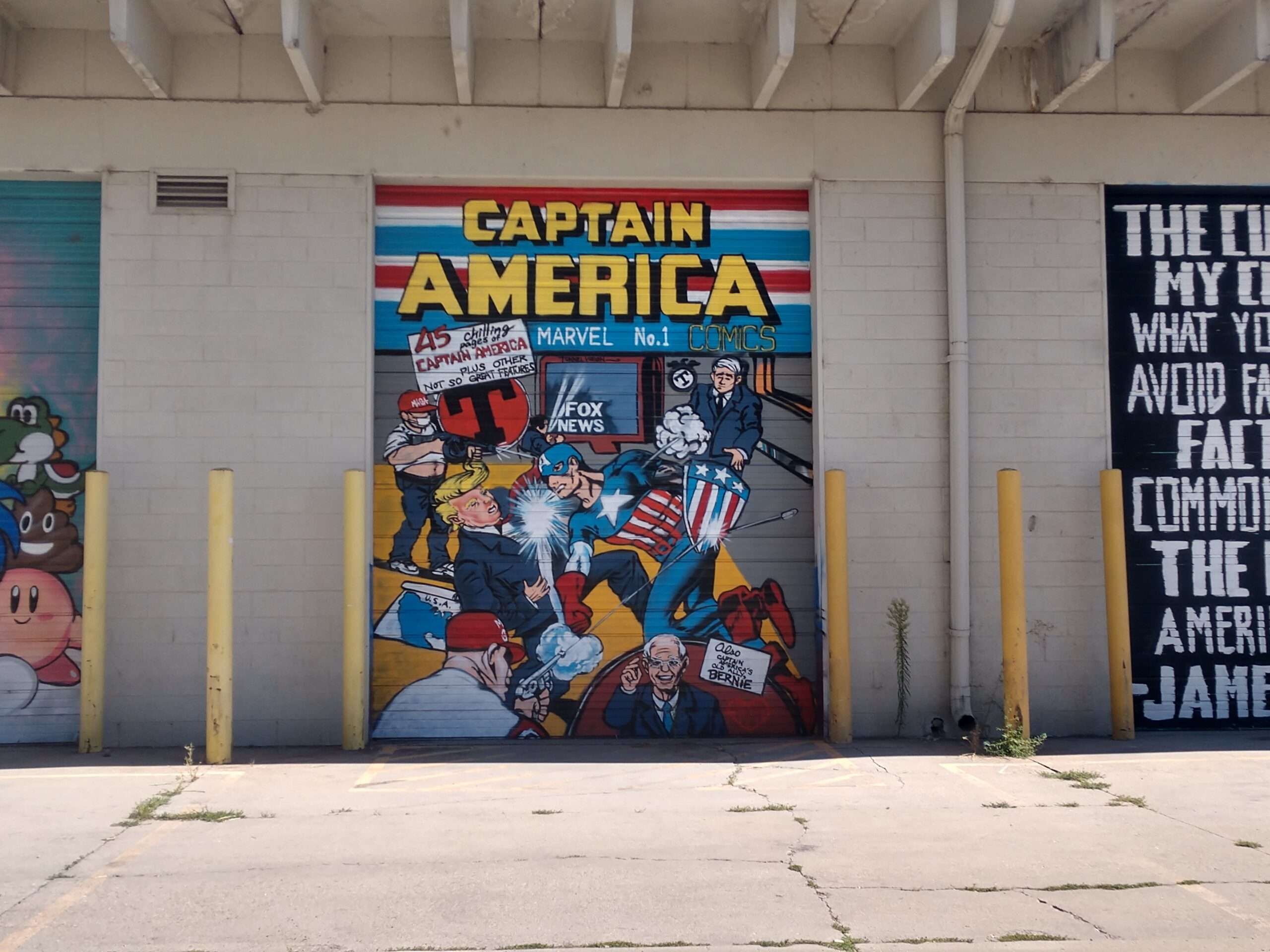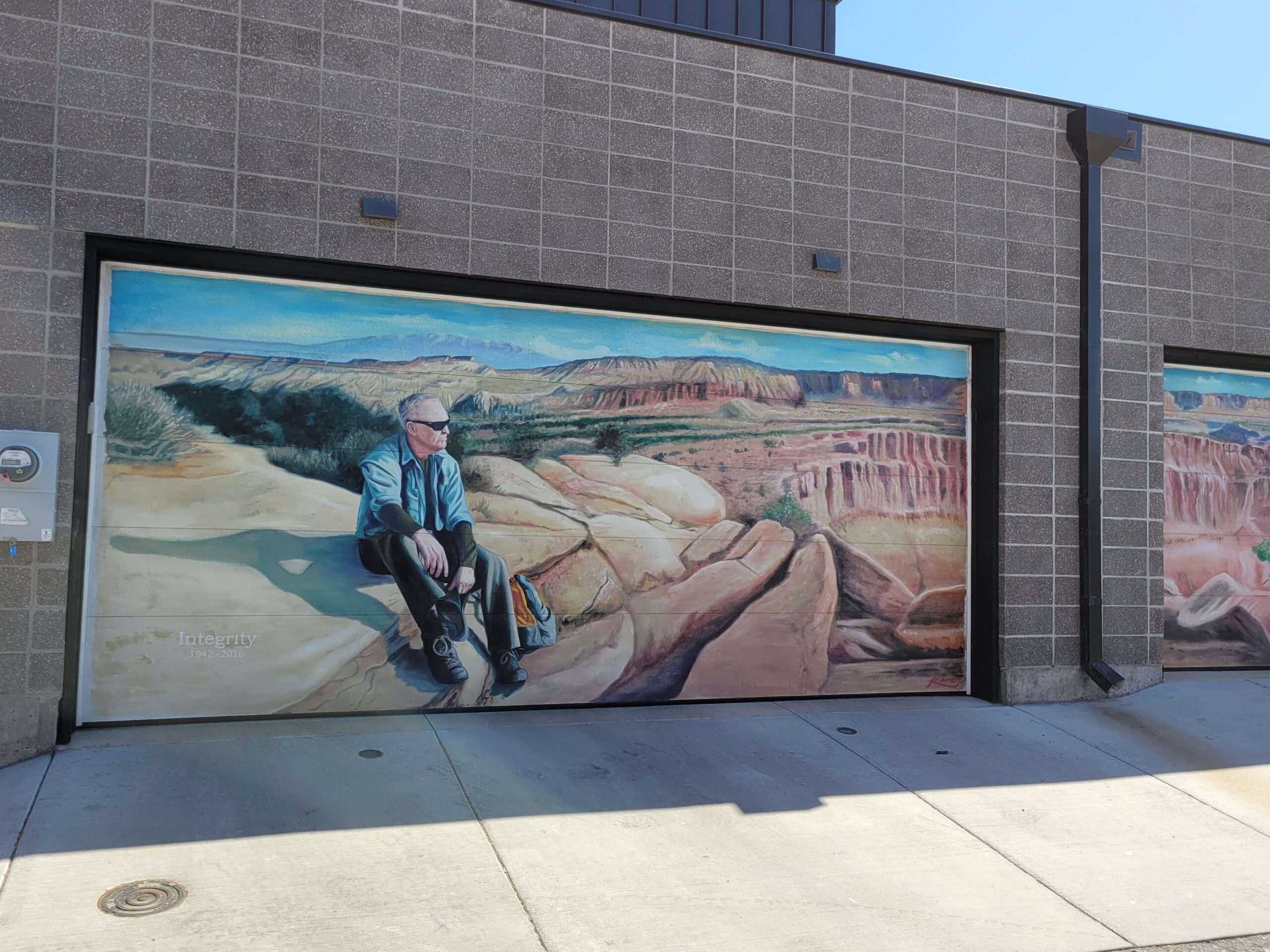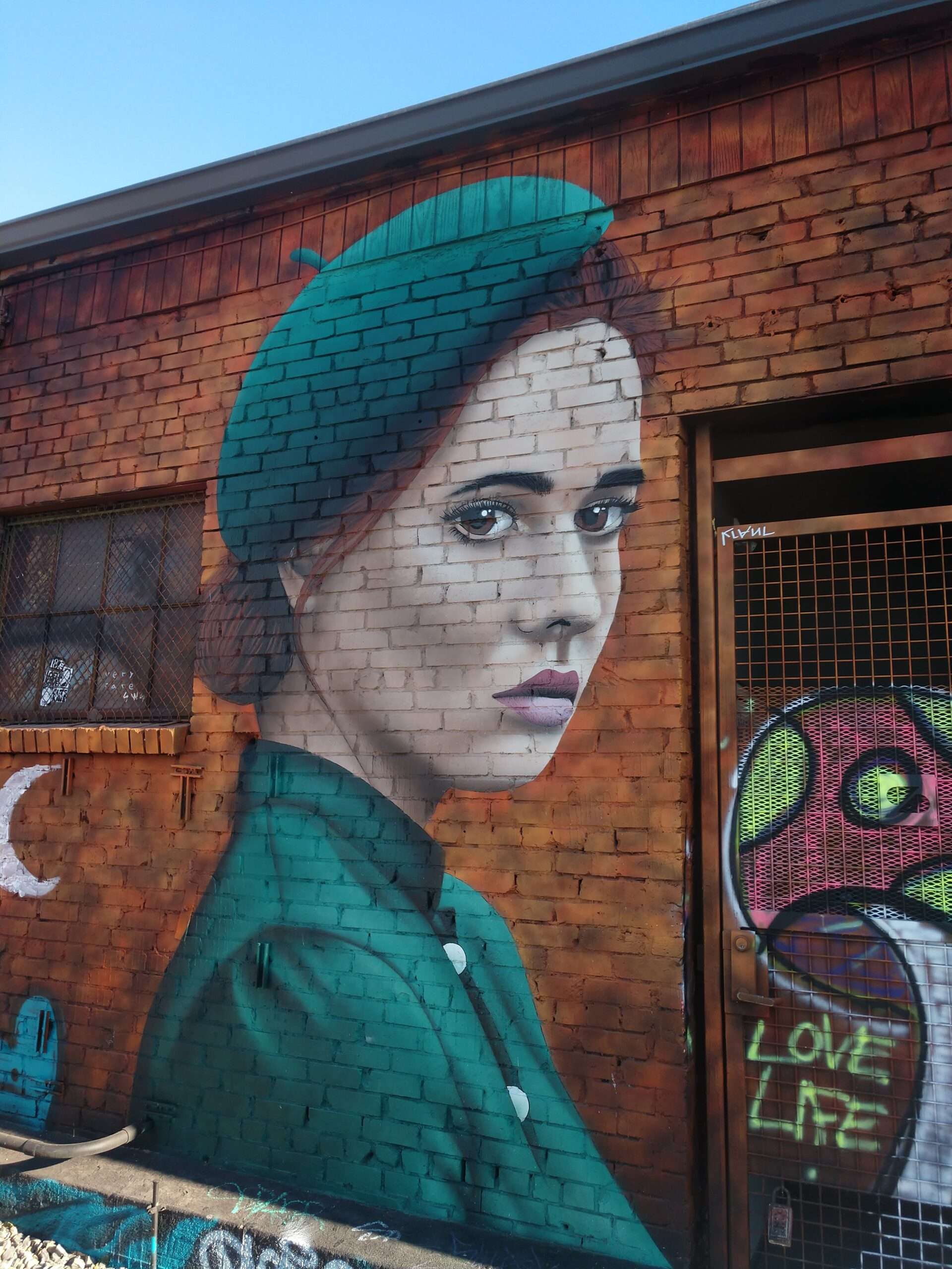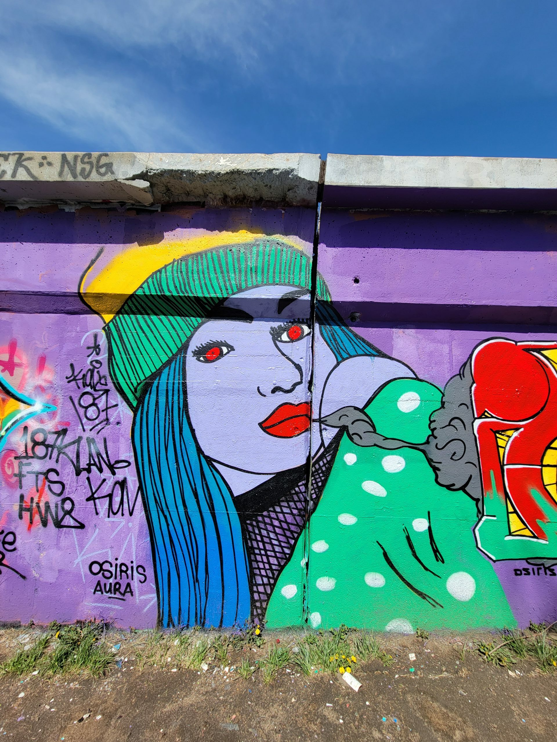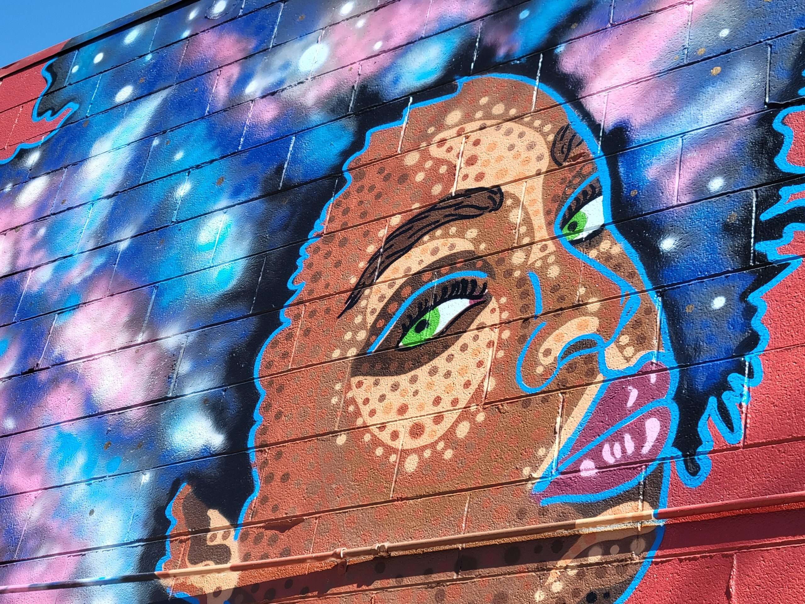 Large-scale colorful mural on a corrugated garage door featuring Max Headroom in a television frame, a profile of a woman with long blonde hair, and glowing blue hands.