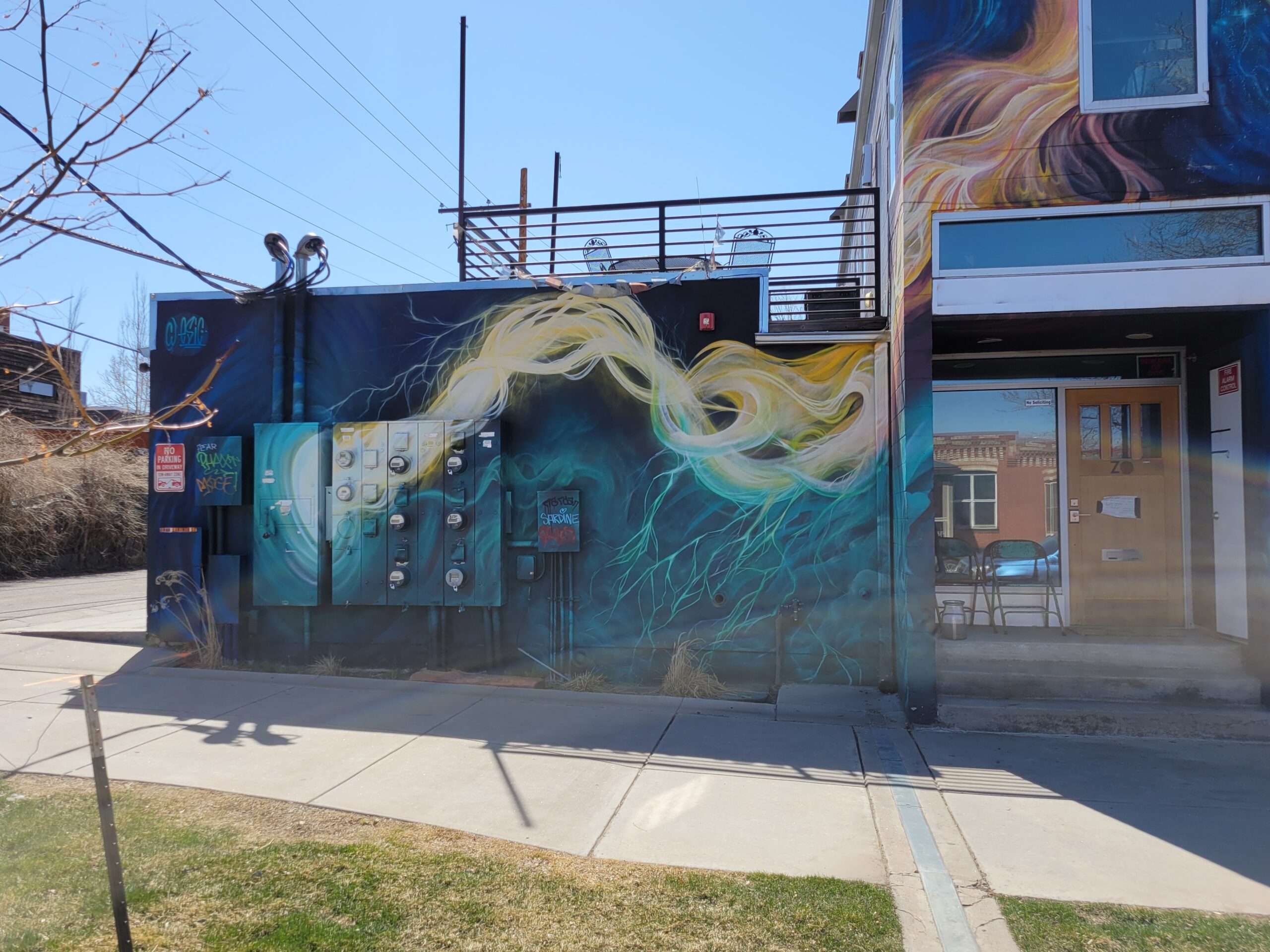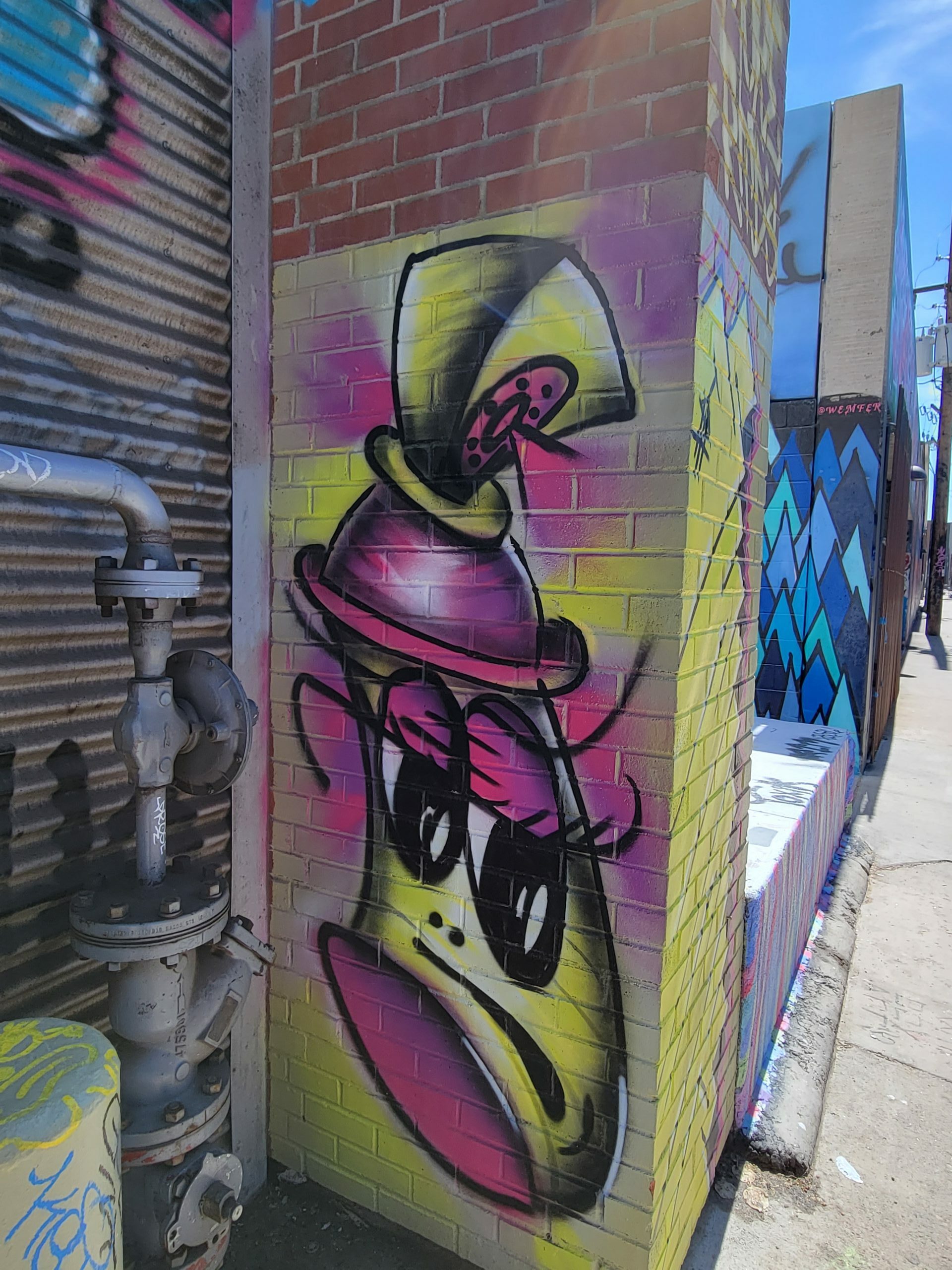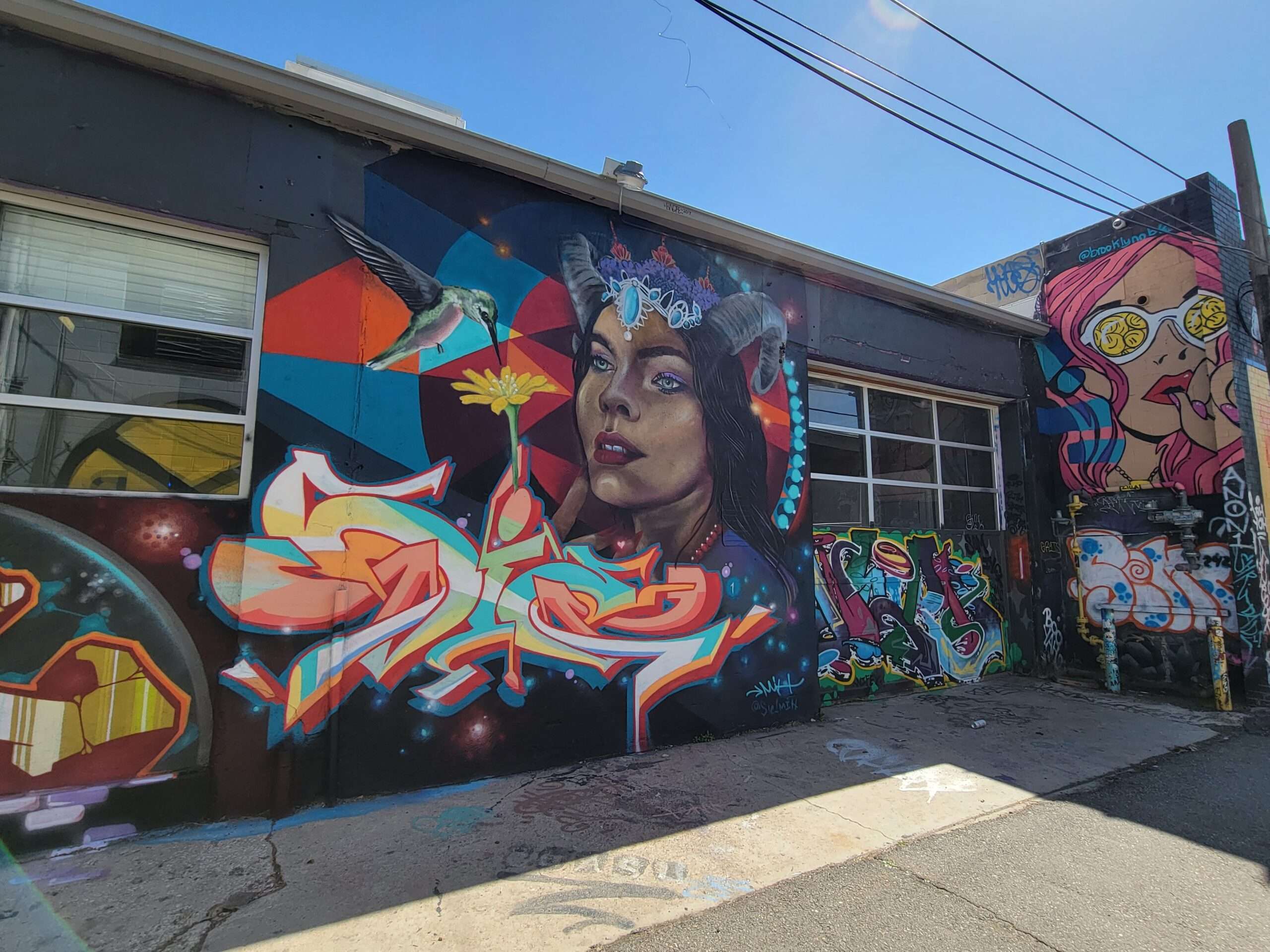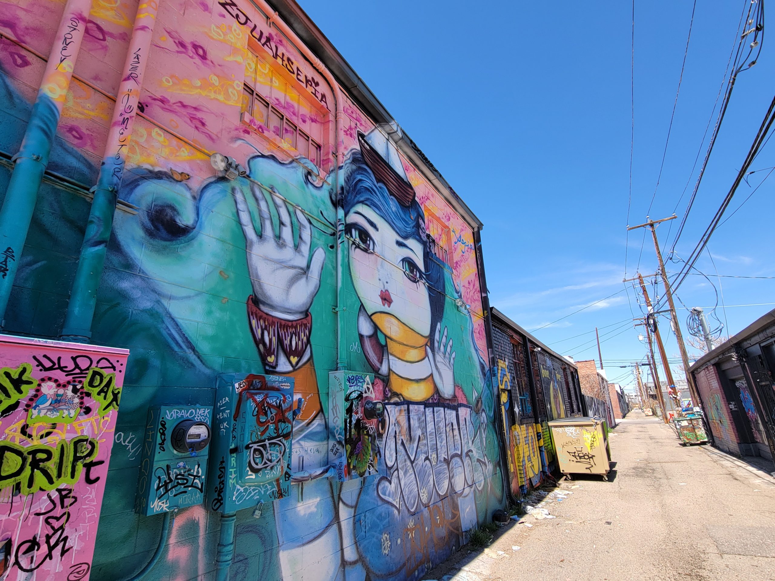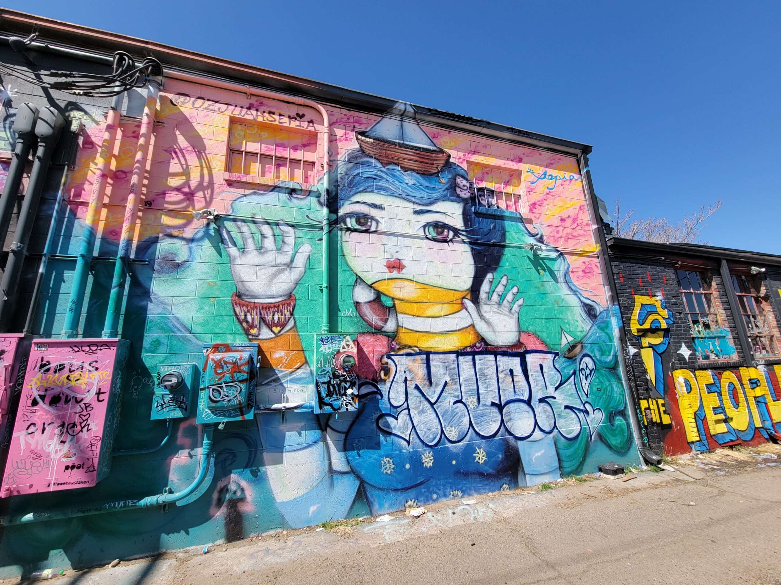 This captivating piece of Denver street art covers the side of a building with a large-scale, colorful mural of a whimsical girl. Featuring bright blue hair and wearing a small paper boat as a hat, the character raises her hands playfully amidst swirling painted blue waves. Set in a sunlit urban alleyway lined with other graffiti tags and utility boxes, the artwork beautifully highlights the city's continuous embrace of expansive, story-driven public murals.