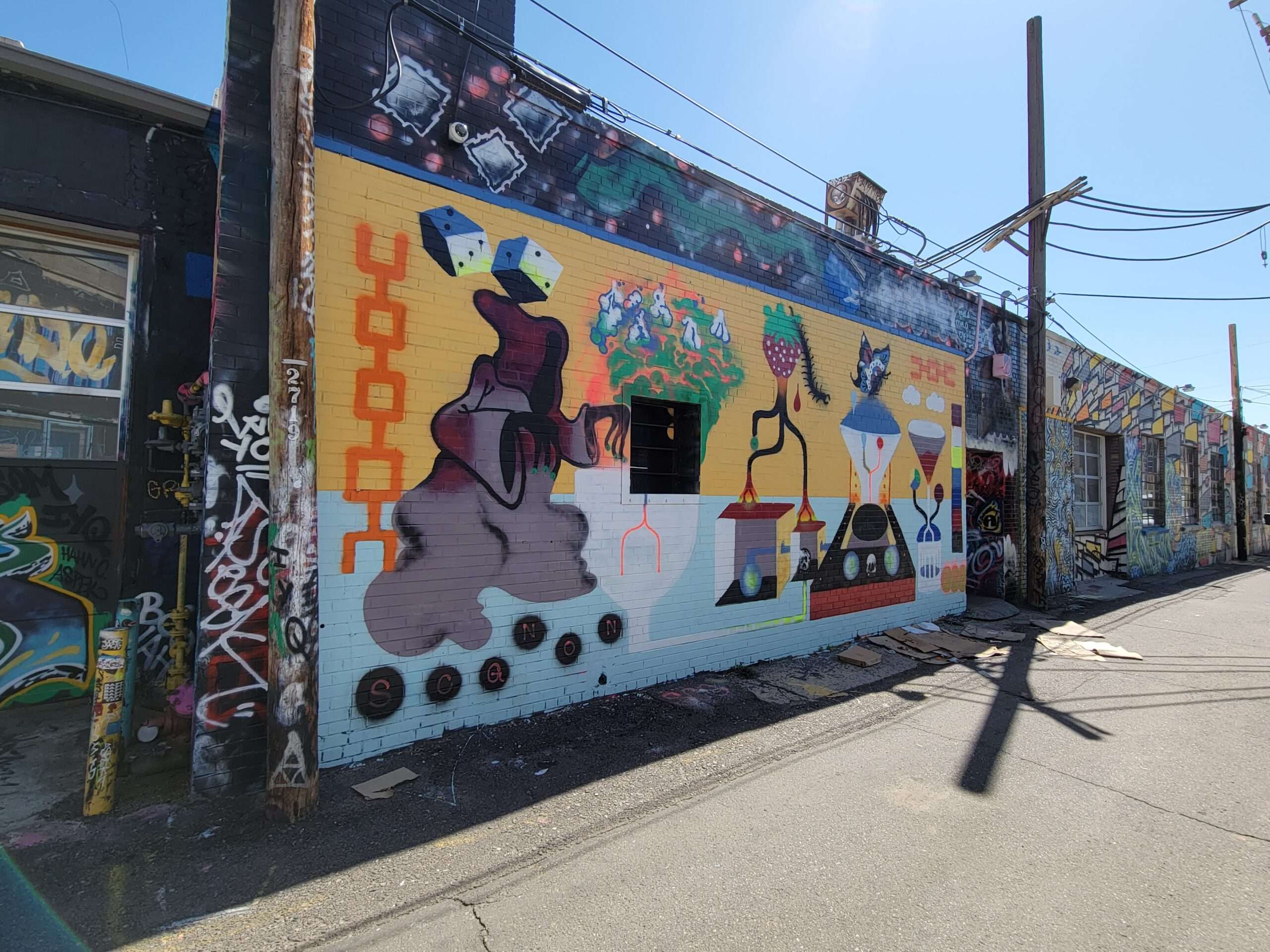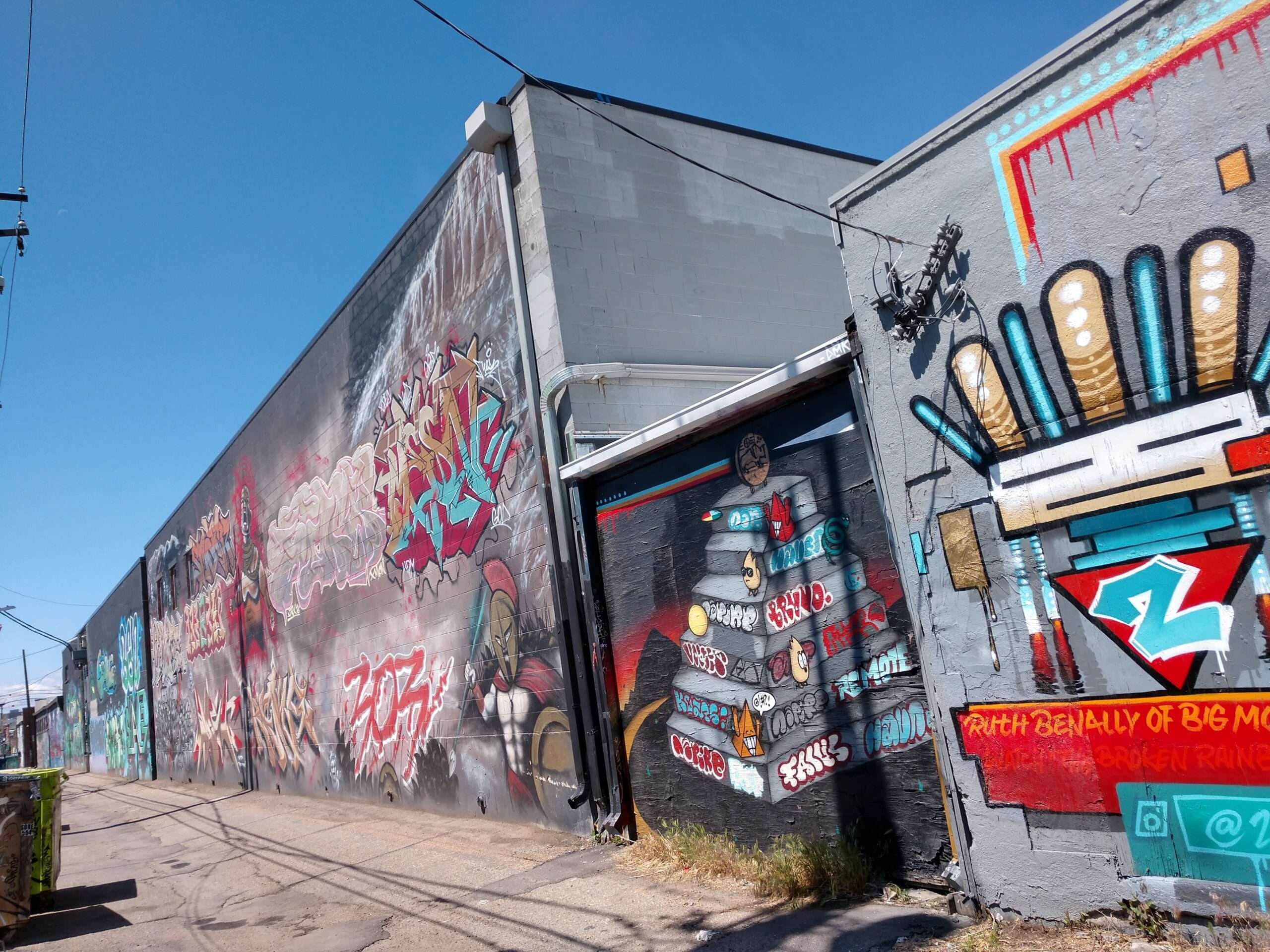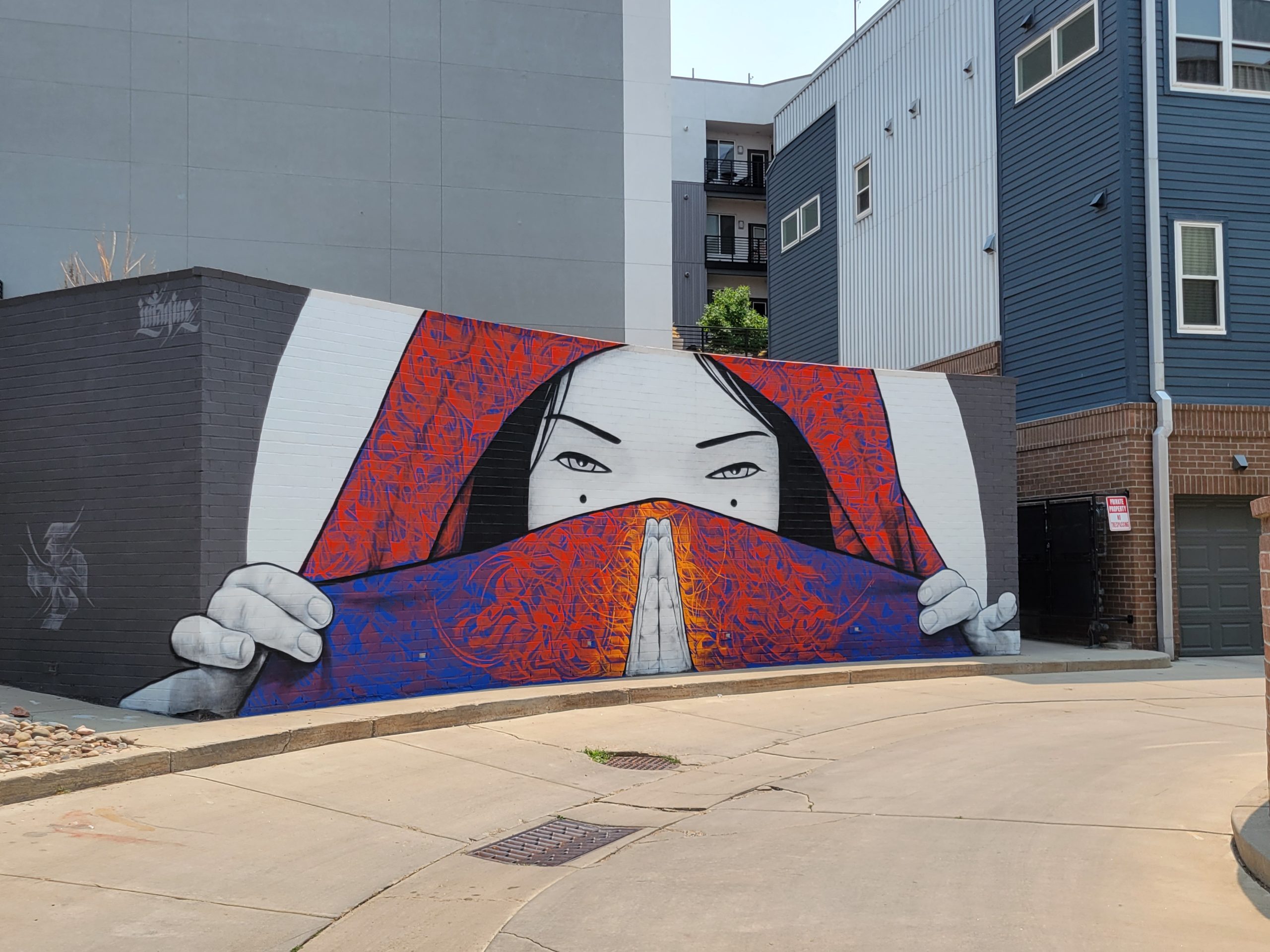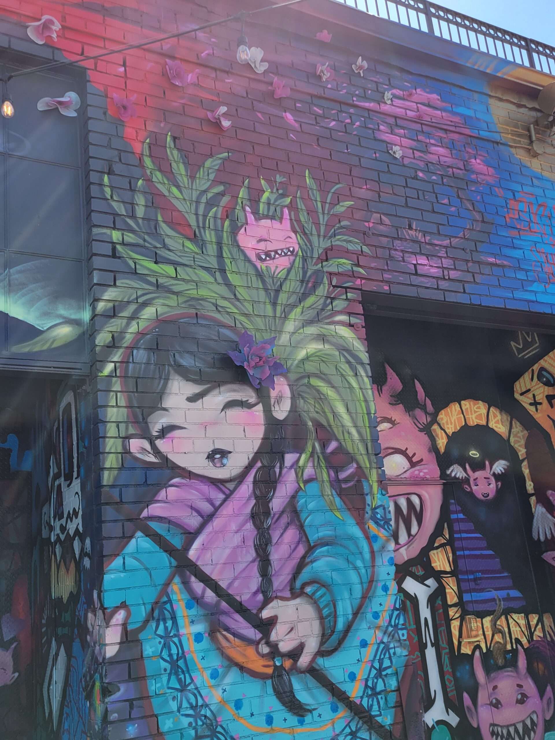 This captivating piece of Denver street art covers the side of a building with a large-scale, colorful mural of a whimsical girl. Featuring bright blue hair and wearing a small paper boat as a hat, the character raises her hands playfully amidst swirling painted blue waves. Set in a sunlit urban alleyway lined with other graffiti tags and utility boxes, the artwork beautifully highlights the city's continuous embrace of expansive, story-driven public murals.