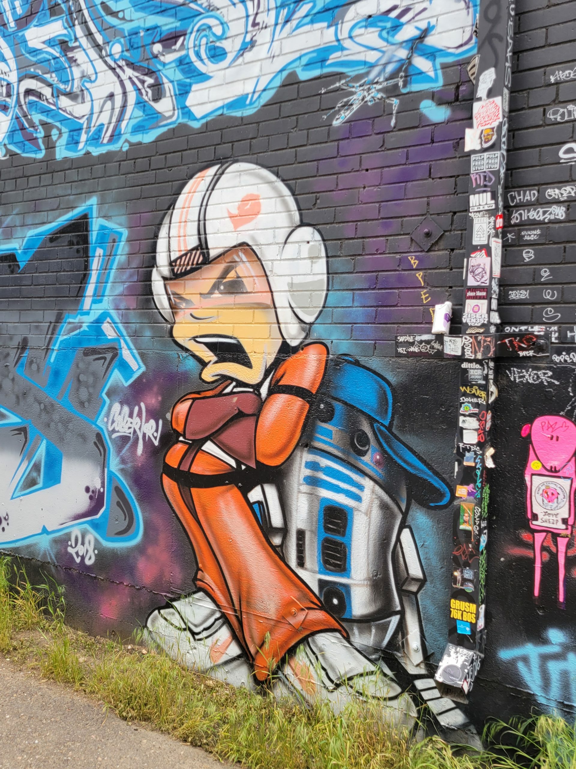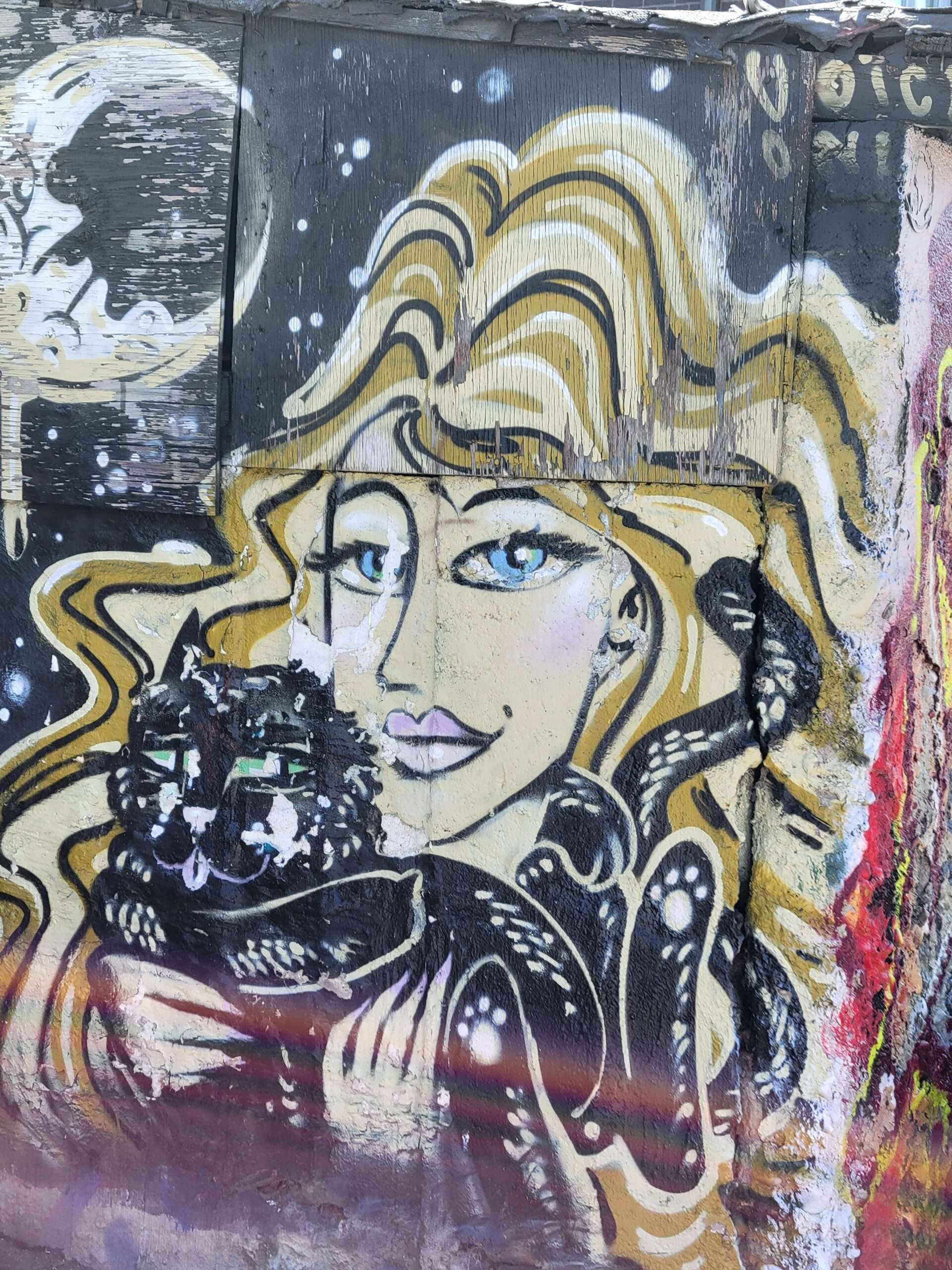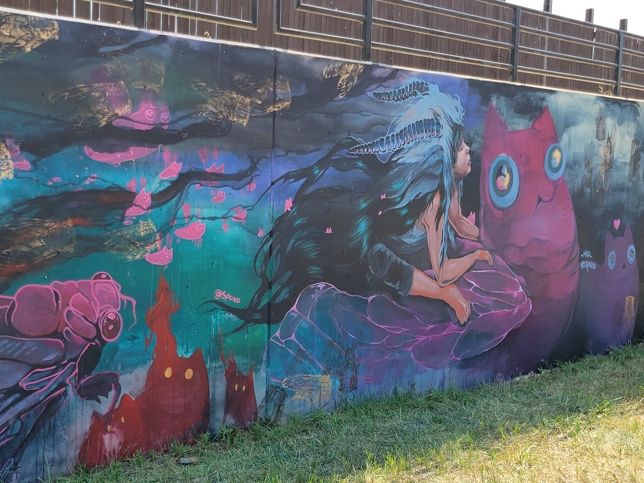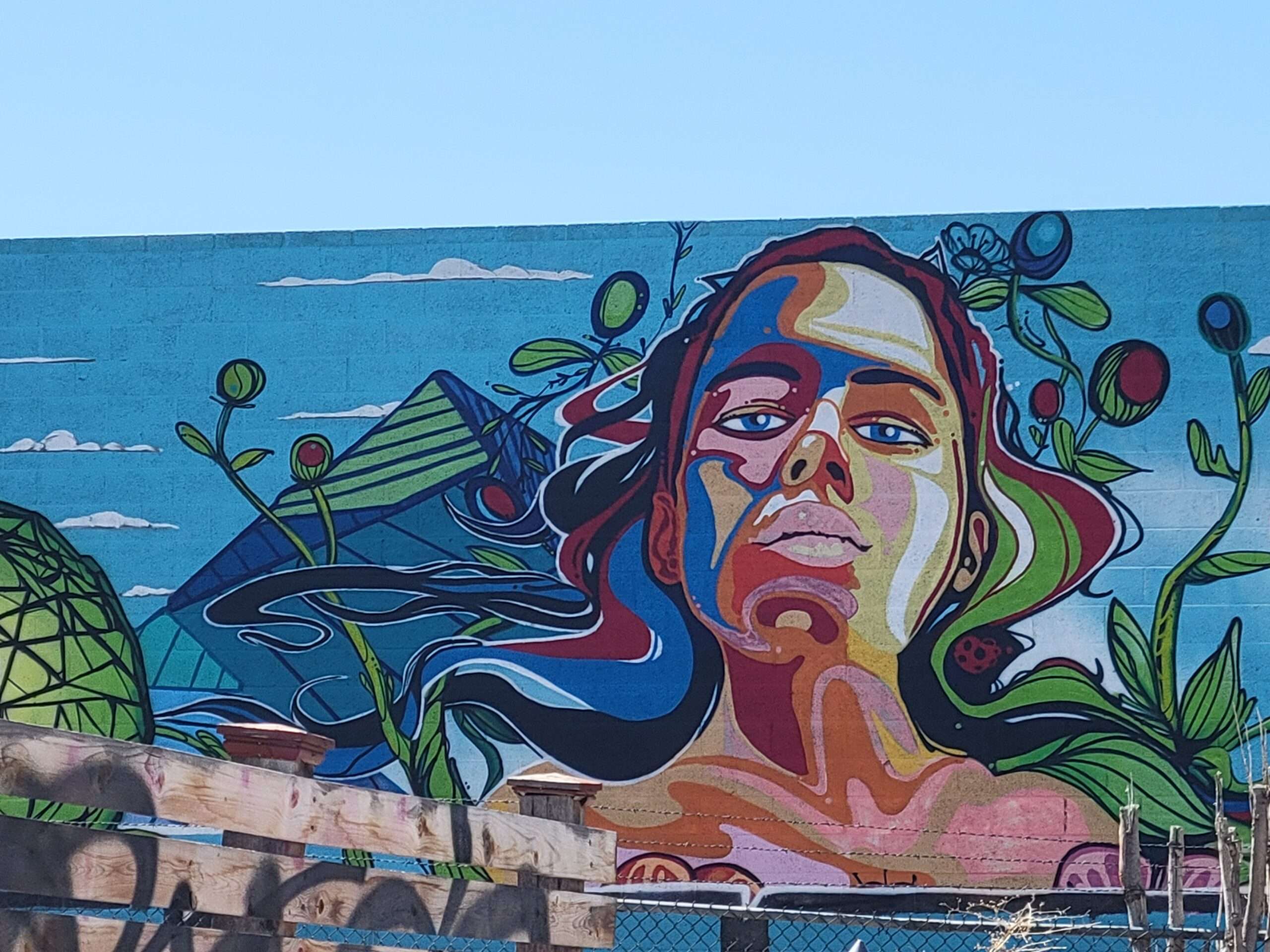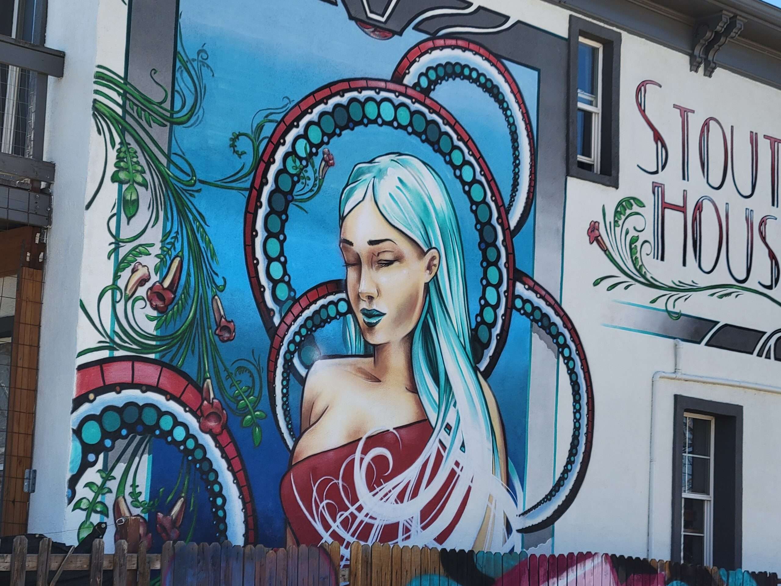 This captivating piece of Denver street art covers the side of a building with a large-scale, colorful mural of a whimsical girl. Featuring bright blue hair and wearing a small paper boat as a hat, the character raises her hands playfully amidst swirling painted blue waves. Set in a sunlit urban alleyway lined with other graffiti tags and utility boxes, the artwork beautifully highlights the city's continuous embrace of expansive, story-driven public murals.