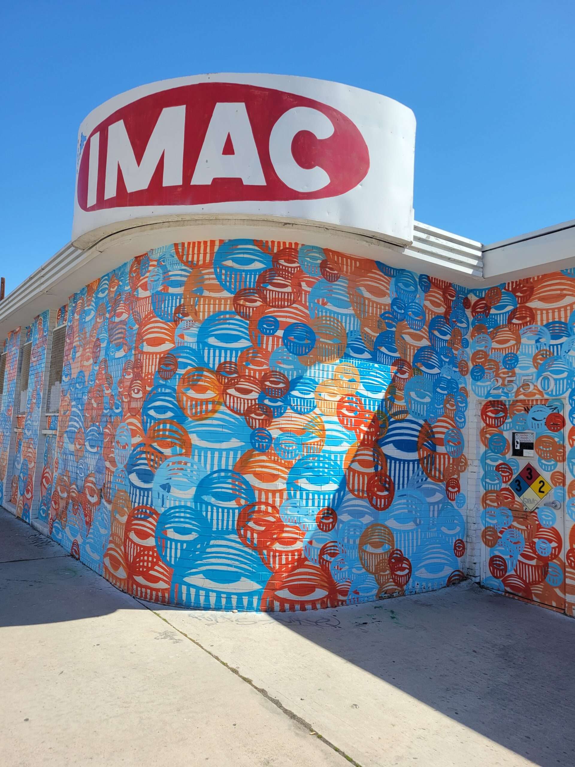 This photograph captures a white-painted industrial building at address 2550. The entire facade is covered in the dense, overlapping pattern of stylized orange and blue eyes seen in the previous close-up. At the top of the building's curved corner, a large white oval sign with the word "IMAC" in red is mounted. To the right, a white metal door is also painted with the eye pattern and features a diamond-shaped hazard placard (NFPA 704) with the ratings 3 (Health), 3 (Flammability), and 2 (Instability). The scene is set on a concrete sidewalk under a bright, cloudless sky.
