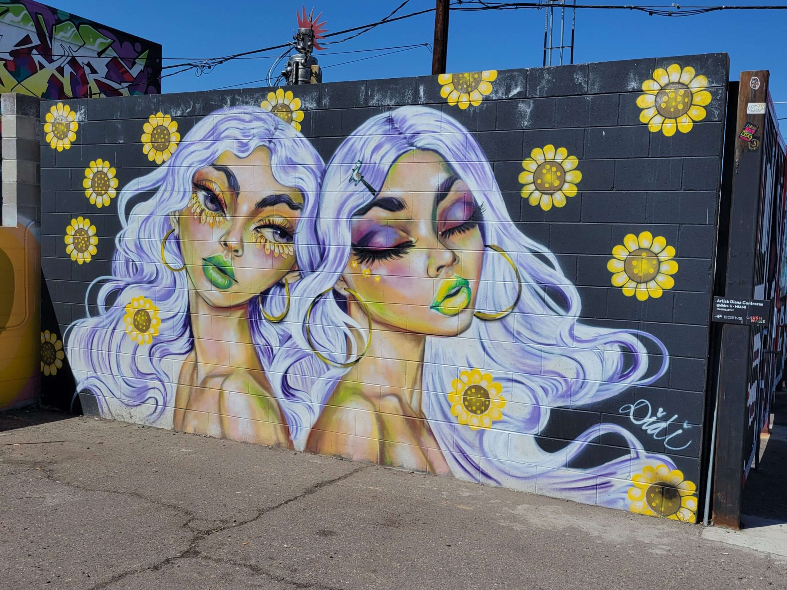This photograph captures a large mural painted on a black-painted cinder block wall. The artwork depicts two women with long, flowing, wavy hair in shades of lavender, white, and light blue. The woman on the left has large, expressive eyes with orange and yellow eyeshadow, while the woman on the right has her eyes closed. Both women feature vibrant green lips and large gold hoop earrings. The entire background is decorated with numerous yellow sunflowers with brown centers. The artist's signature, "Didi," is written in white script at the bottom right. A small plaque to the right identifies the artist as Diana Contreras from Miami and mentions the CRUSH Walls festival. In the distance above the wall, the spiky orange mohawk of the "Skater-Bot" sculpture is visible against the clear blue sky.