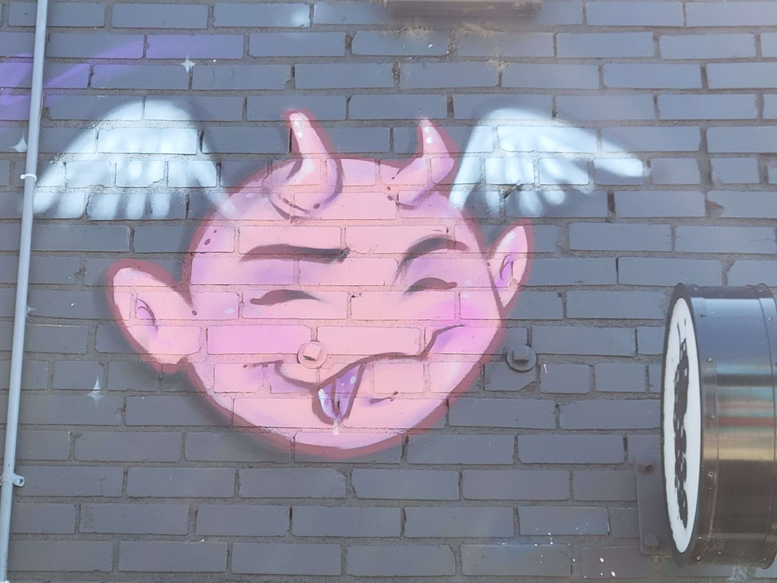 This photograph captures a small, stylized character painted on a dark grey-brown brick wall. The focal point is a circular pink face with a wide, smiling mouth and a small purple tongue sticking out. The eyes are closed in happy, upward-curving lines, and two small, pointed pink horns protrude from the top of the head. A pair of white, feathery angel wings with soft grey shading is painted above and to the sides of the head. A grey metal electrical conduit runs vertically on the left, and a circular black outdoor fixture is mounted to the wall on the right.