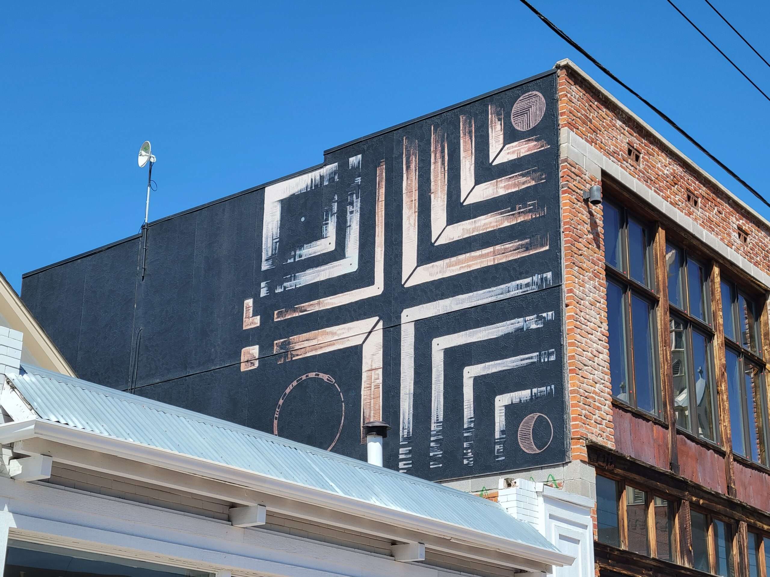This photograph captures a massive mural painted on the black-painted exterior wall of a building. The artwork is composed of thick white and tan lines that form a series of nested, right-angled "L" shapes and boxes radiating from a central cross-like structure. In the bottom left corner, a circular Ouroboros—a snake or dragon eating its own tail—is rendered in thin tan lines. Other geometric icons, including a circle with internal stripes in the top right and a crescent moon shape in the bottom right, are integrated into the design. The mural is painted on a textured wall adjacent to a historic red brick section of the building. A silver satellite dish and a white corrugated metal roof are visible in the foreground under a clear blue sky.