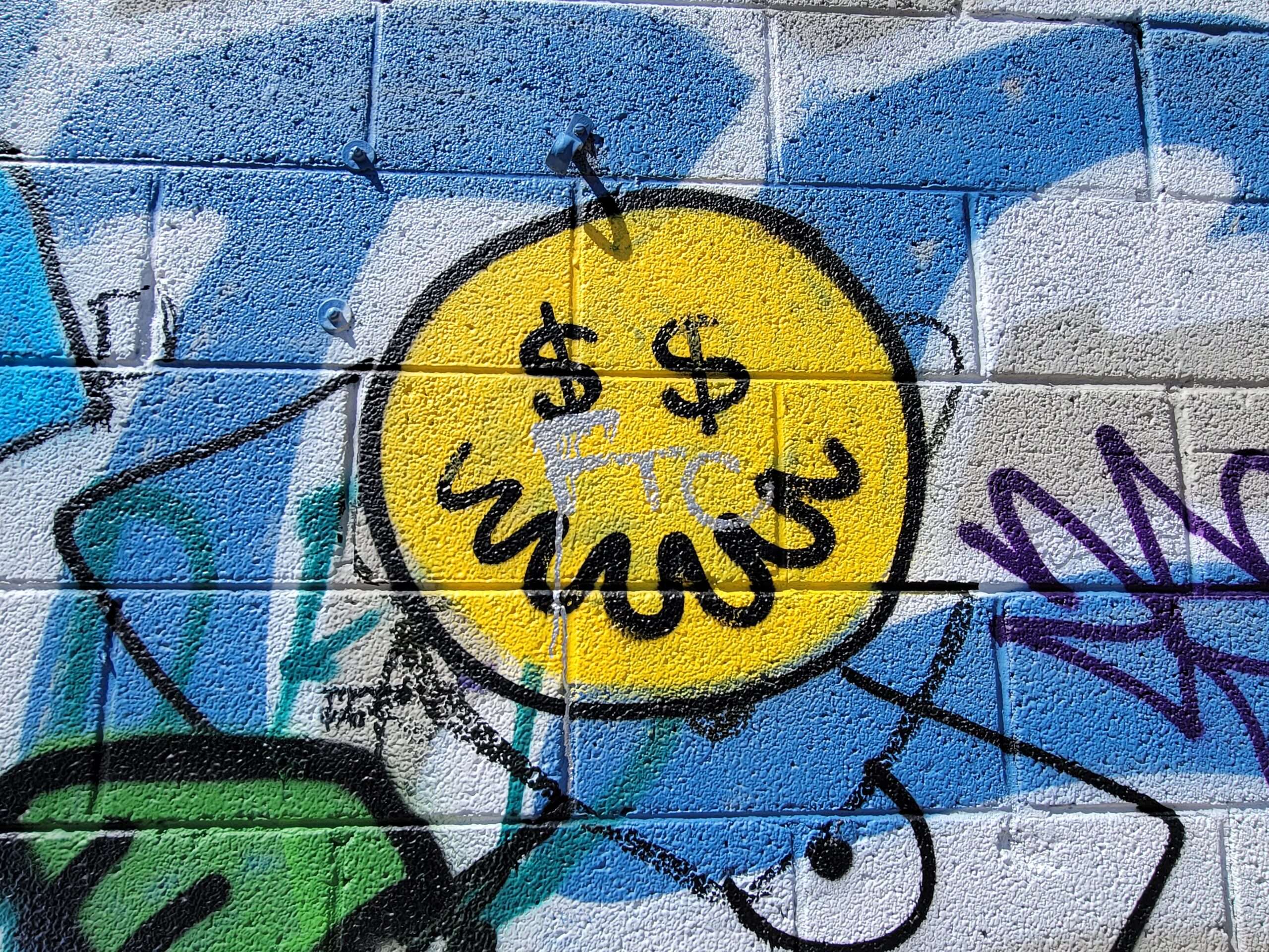 This photograph captures a small, circular graffiti icon painted on a light blue and white-washed cinder block wall. The focal point is a bright yellow "smiley face". Instead of standard eyes, it features two black dollar signs ($). The mouth is rendered as a single, continuous black squiggly line. Faint white lettering that appears to read "FTC" is visible in the center of the yellow circle. The icon is set against a background of overlapping blue and white paint, with a small portion of a green shape visible in the bottom left corner. A single metal bolt or utility fixture is visible on the wall directly above the character.