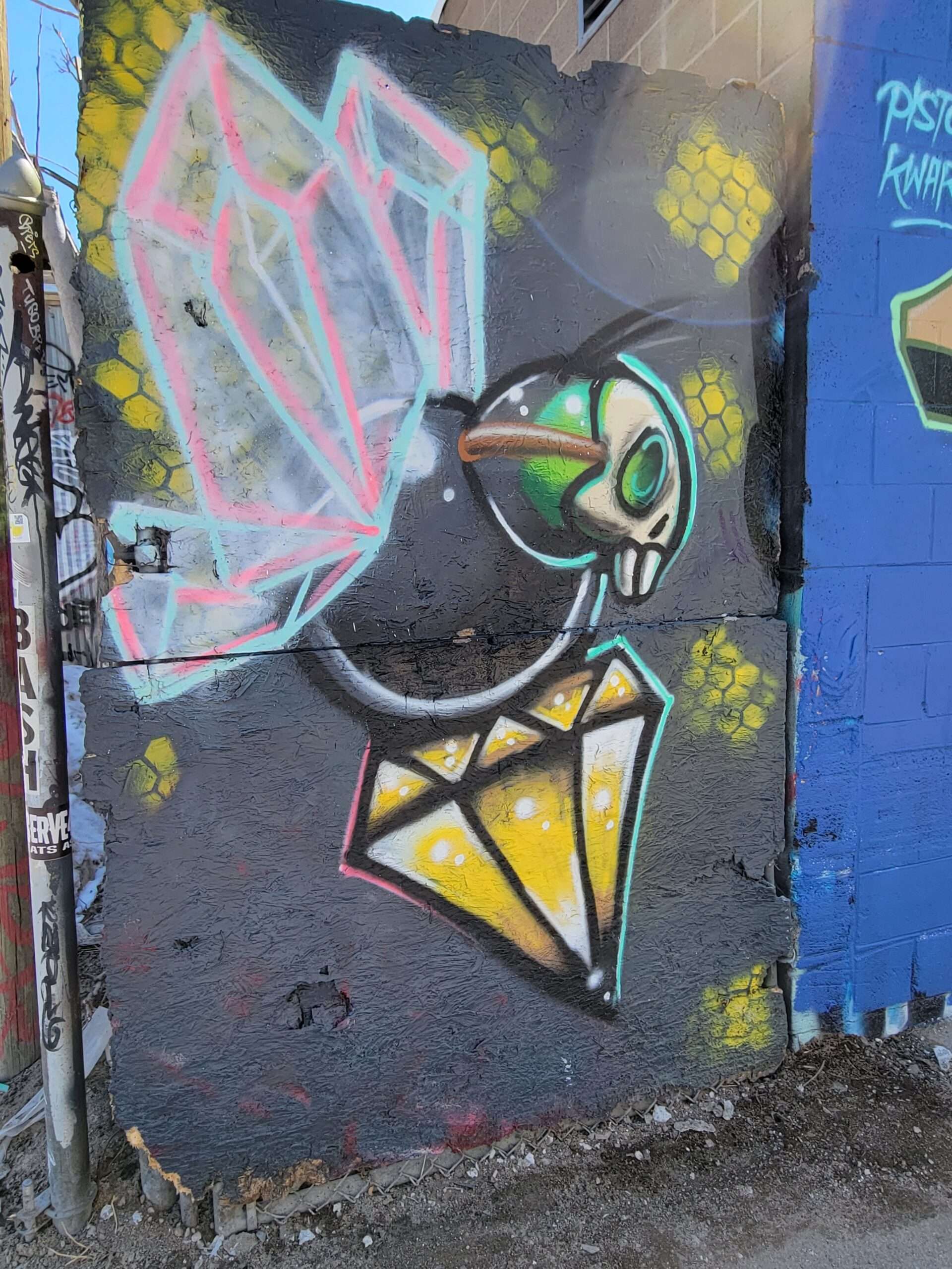 This photograph captures a mural on a dark grey, heavily textured wooden or plywood wall. The artwork depicts a stylized insect in profile, facing right. Its head is rendered as a white-and-green skull with a large, glowing green eye. Its wings are large, pointed, and translucent, featuring geometric crystal-like facets in light blue and pink. The lower portion of the insect's body is a large, faceted yellow-and-white diamond. Faint yellow honeycomb or hexagonal patterns are scattered around the character. To the right, a bright blue wall with the text "PISTON KWAR" is partially visible. A metal utility pole with various stickers stands on the far left edge of the frame.