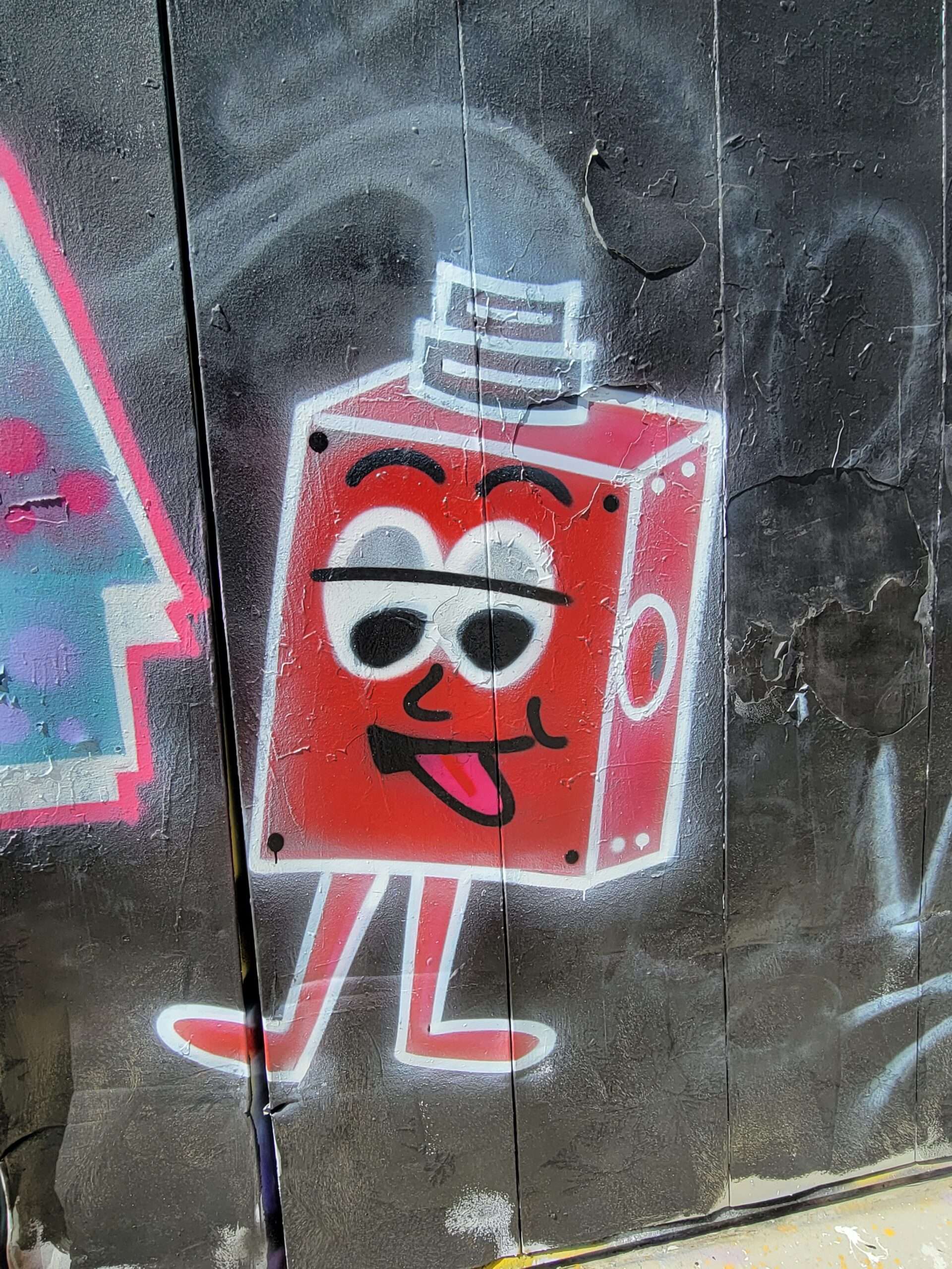 This photograph captures a small, stylized character mural painted on a black-and-grey weathered wall. The focal point is a red, rectangular character that resembles a box or a stylized spray can body. On top of its "head" is a white-and-grey spray can nozzle or cap. The character has large, rounded white eyes with black pupils and a playful, open-mouthed grin with a vibrant pink tongue sticking out to the side. It stands on two thin, pink-and-white legs. To the left, a sliver of a pink-and-blue pixelated shape is visible. The background wall is heavily textured with peeling paint and dark, vertical drips.