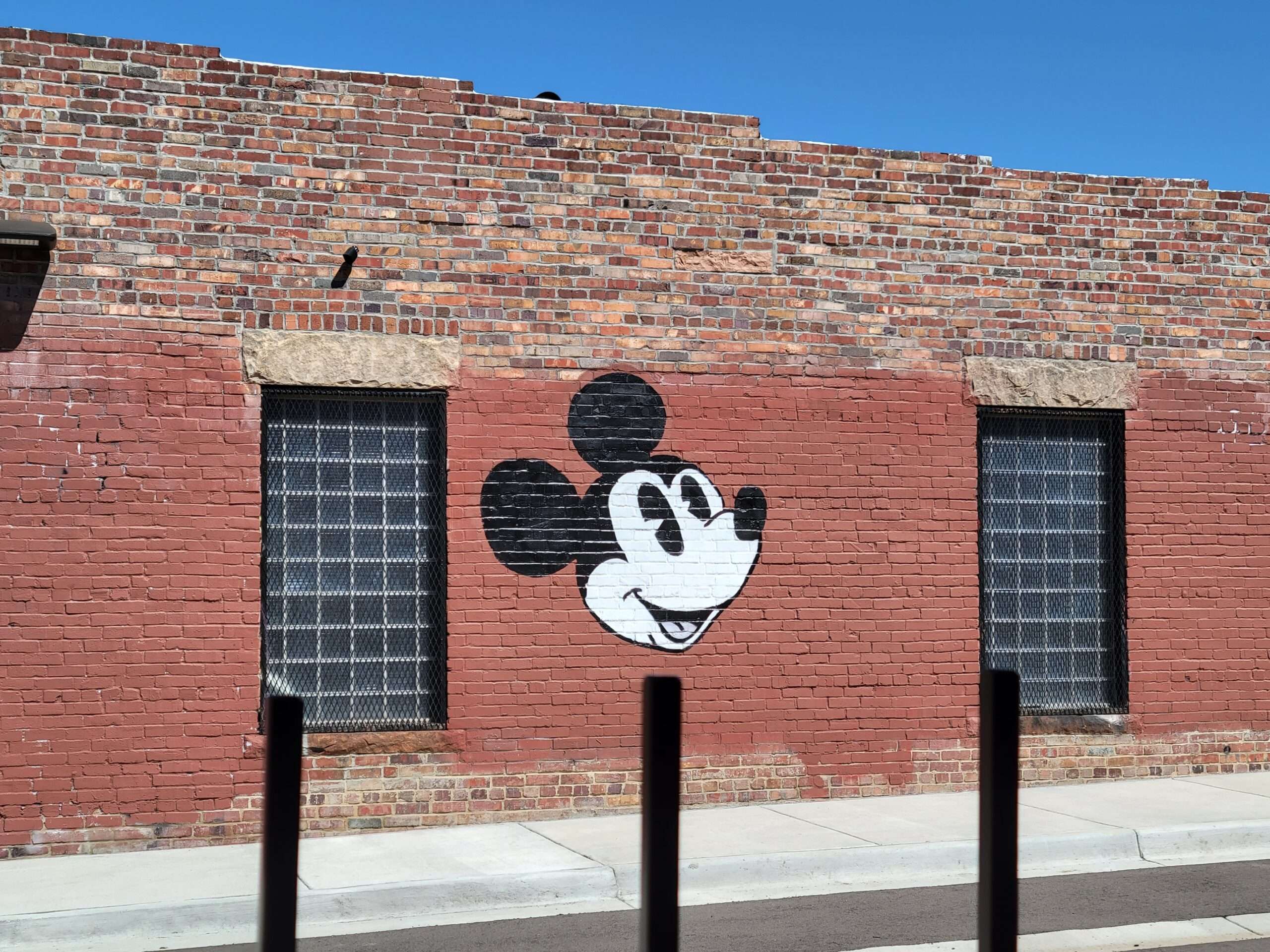 This photograph captures a mural of a classic Mickey Mouse head painted on a two-toned brick wall. The top portion of the wall consists of original, multi-toned red-and-tan brick, while the lower section is painted a solid terracotta red. The Mickey character is rendered in a vintage, mid-century style with a white face, black ears, and a wide, open-mouthed grin. The mural is positioned centrally between two vertical rectangular windows. Both windows are covered with black metal security mesh and topped with rough-hewn tan stone lintels. In the foreground, several dark metal fence posts are partially visible, set against a clean concrete sidewalk and a paved street.
