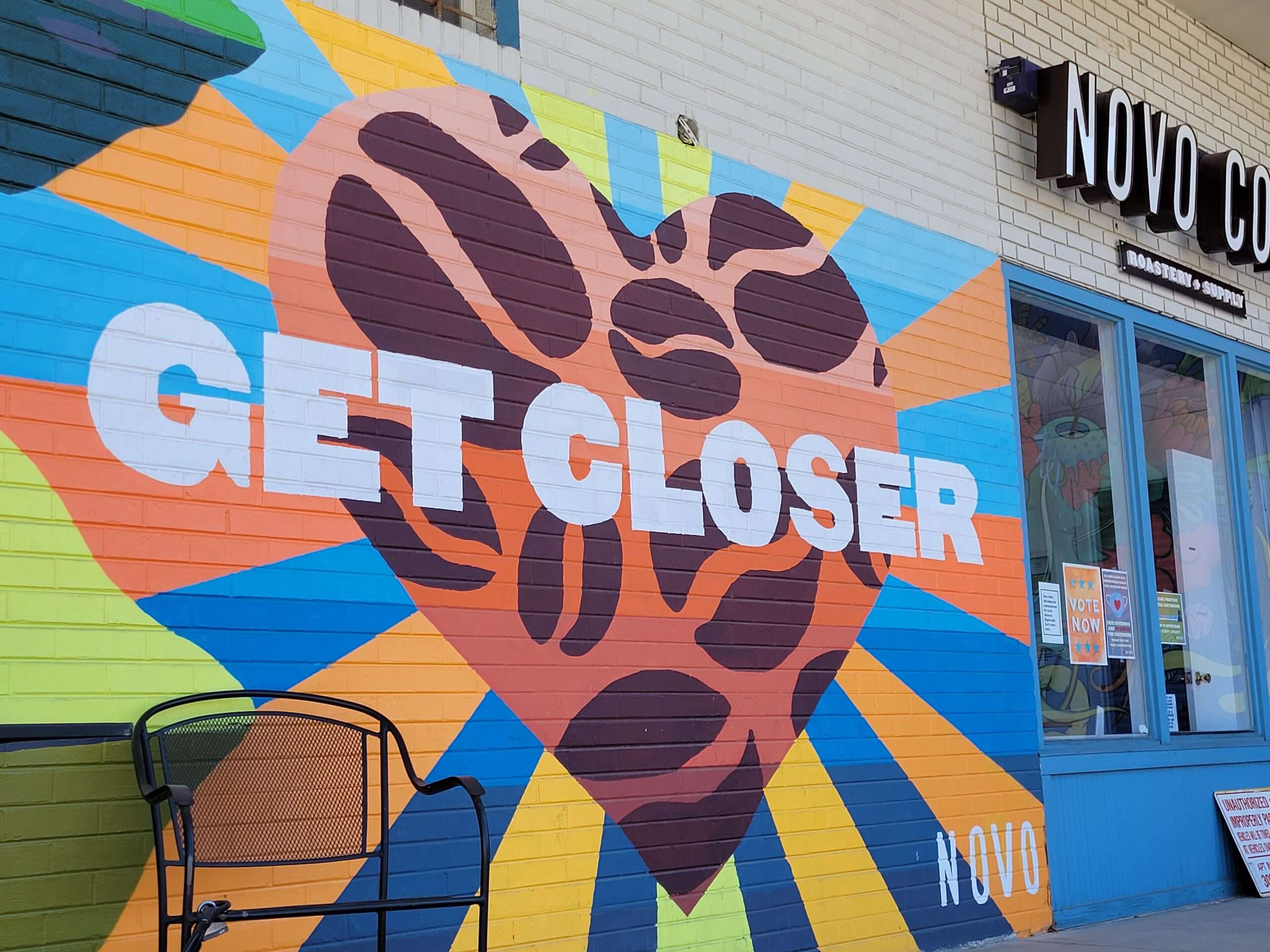 This photograph captures a graphic mural painted on a white brick building wall. The central focus is a large orange heart filled with a pattern of dark brown coffee beans. Overlaid on the heart in large, bold, white sans-serif capital letters is the phrase "GET CLOSER". The heart is the center of a radiant sunburst pattern, with "rays" of light blue, dark blue, teal, orange, and yellow extending to the edges of the frame. The word "NOVO" is neatly painted in white at the bottom right. To the right, the blue-framed window of "NOVO COFFEE ROASTERY & SUPPLY" is visible, featuring various posters and a "Vote Now" sign. A black metal mesh chair sits on the sidewalk in the foreground.