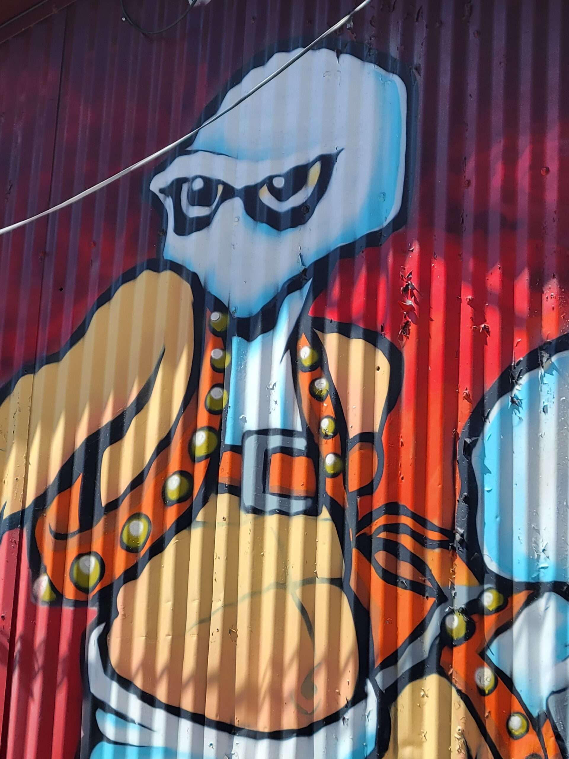 This close-up photograph captures a stylized graffiti character painted on vertical-ribbed, red-painted corrugated metal siding. The character features a light blue-grey head with large, expressive eyes that resemble black-rimmed goggles or spectacles. It is wearing a vibrant orange-and-brown vest decorated with numerous circular yellow-and-gold studs or buttons arranged in rows. A thick black belt with a silver-grey buckle is visible across the midsection. The artwork is characterized by high-contrast black outlines and flat color fills, standing out against the weathered red paint of the industrial wall. A thin white utility wire runs horizontally across the top of the frame.