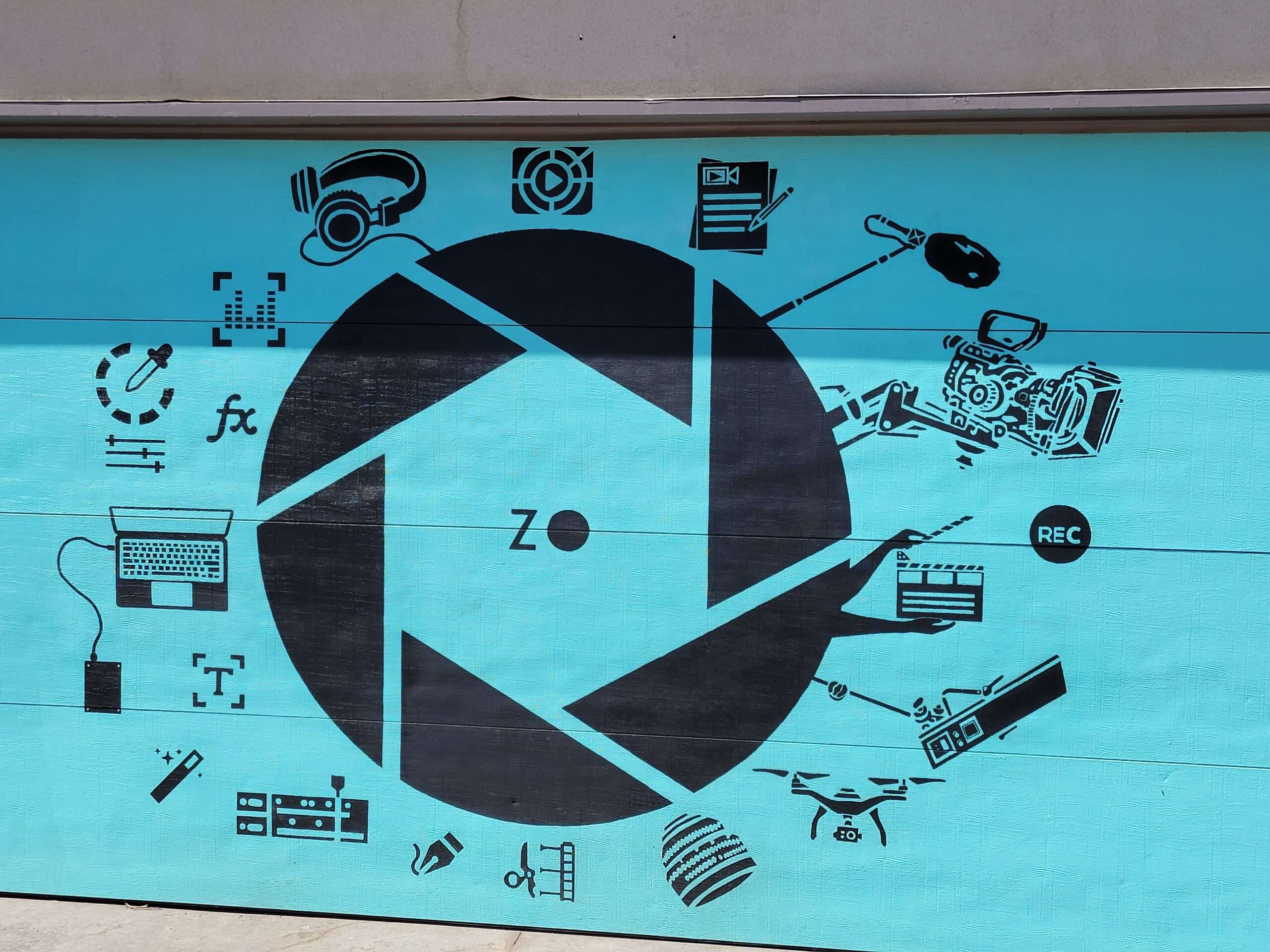 This photograph captures a large-scale graphic mural painted on a bright teal-colored, horizontal-paneled garage door. The central focal point is a large black camera shutter aperture. Inside the center of the aperture is the letter "Z" next to a solid black circle. Arranged in a circle around the shutter are various black silhouettes of video production tools: headphones, a boom microphone, a professional video camera, a "REC" button, a clapperboard, a drone, and a film reel. On the left side, icons for a laptop, editing software effects ("fx"), and a text tool are visible. The entire composition is rendered with sharp, clean lines against the vibrant background.
