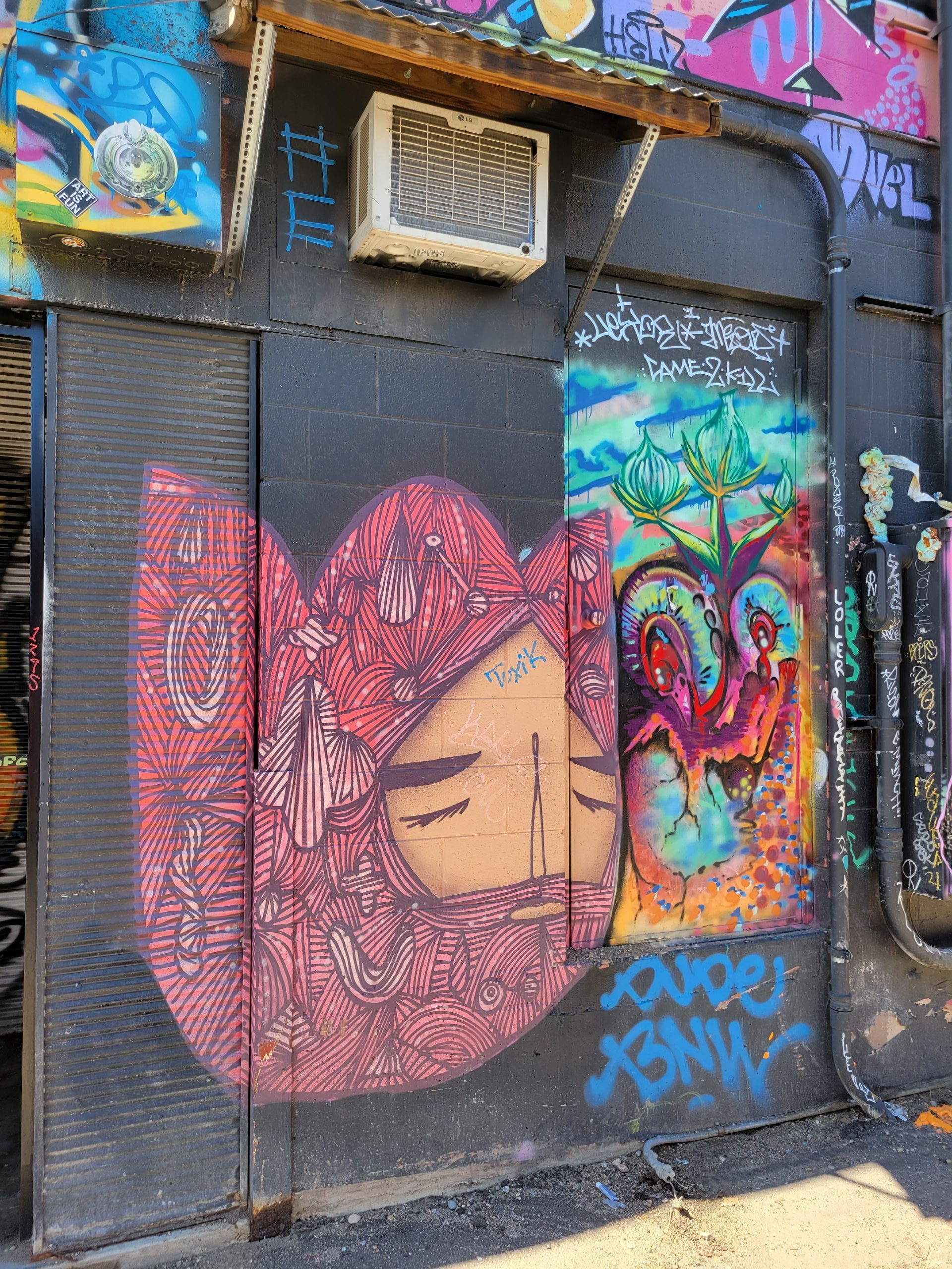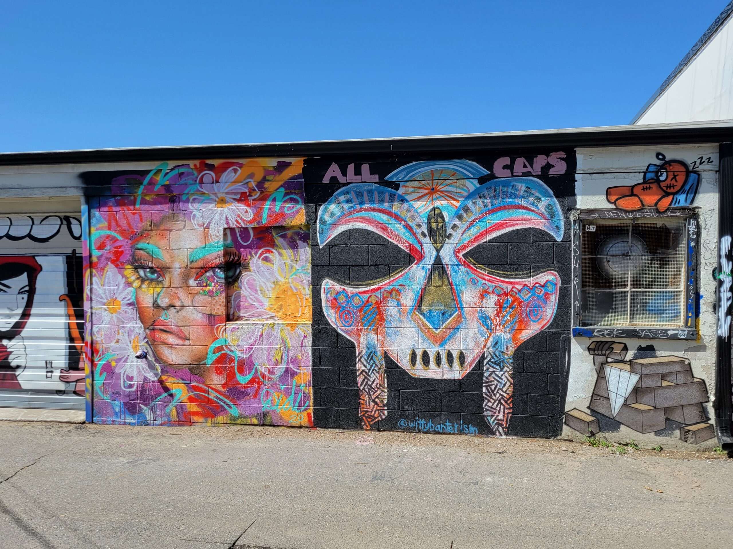 Painted onto the dark exterior walls of a commercial building, this mural presents an intriguing contrast of street art styles. A calm face with closed eyes is wrapped in an intricate, pink geometric pattern, sitting quietly next to a vibrant, chaotic graffiti piece on the adjacent door featuring green plant life sprouting from a brightly colored, abstract base. The artwork adds a rich layer of texture and imagination to Denver's urban landscape.