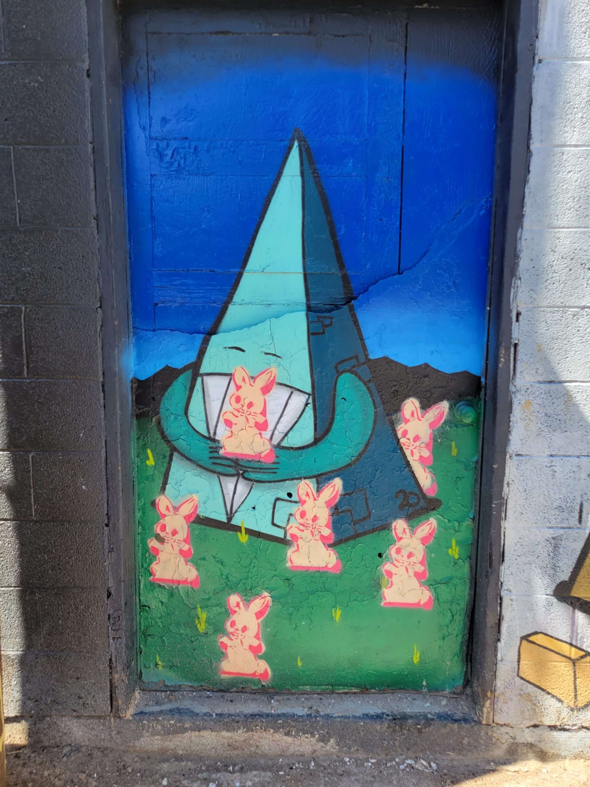 This photograph captures a mural painted on a recessed wooden door set within a grey-and-white cinderblock wall. The central character is a large, light-blue pyramid with a minimalist face and long, flexible green arms. The pyramid is gently cradling a small, pink, stylized rabbit. Six other identical rabbits are scattered across the vibrant green grass at the base. The background consists of a flat blue sky and dark, low-profile mountains. The door itself shows signs of aging, with vertical cracks running through the wood, which adds a weathered texture to the bright, cartoonish artwork.
