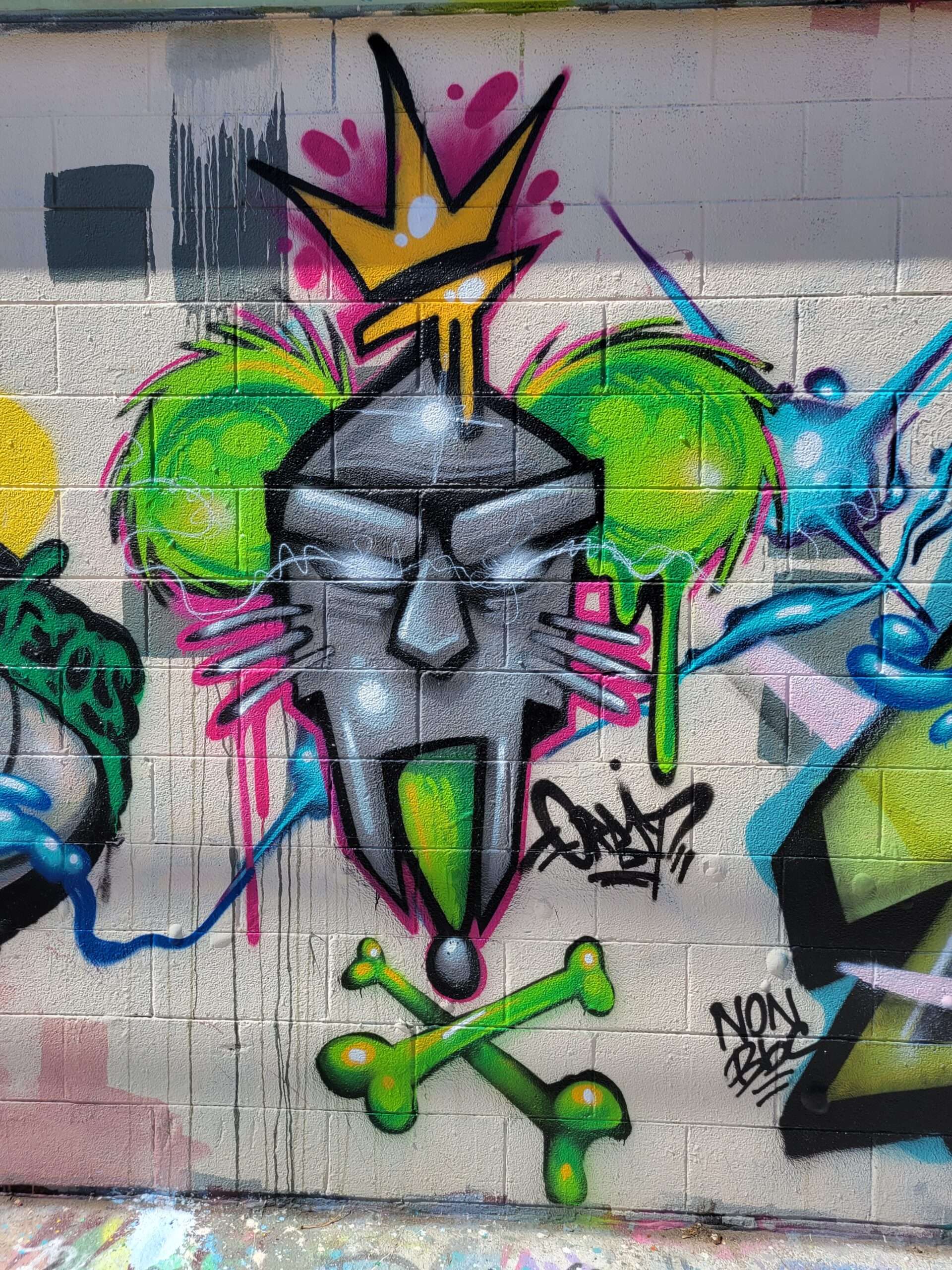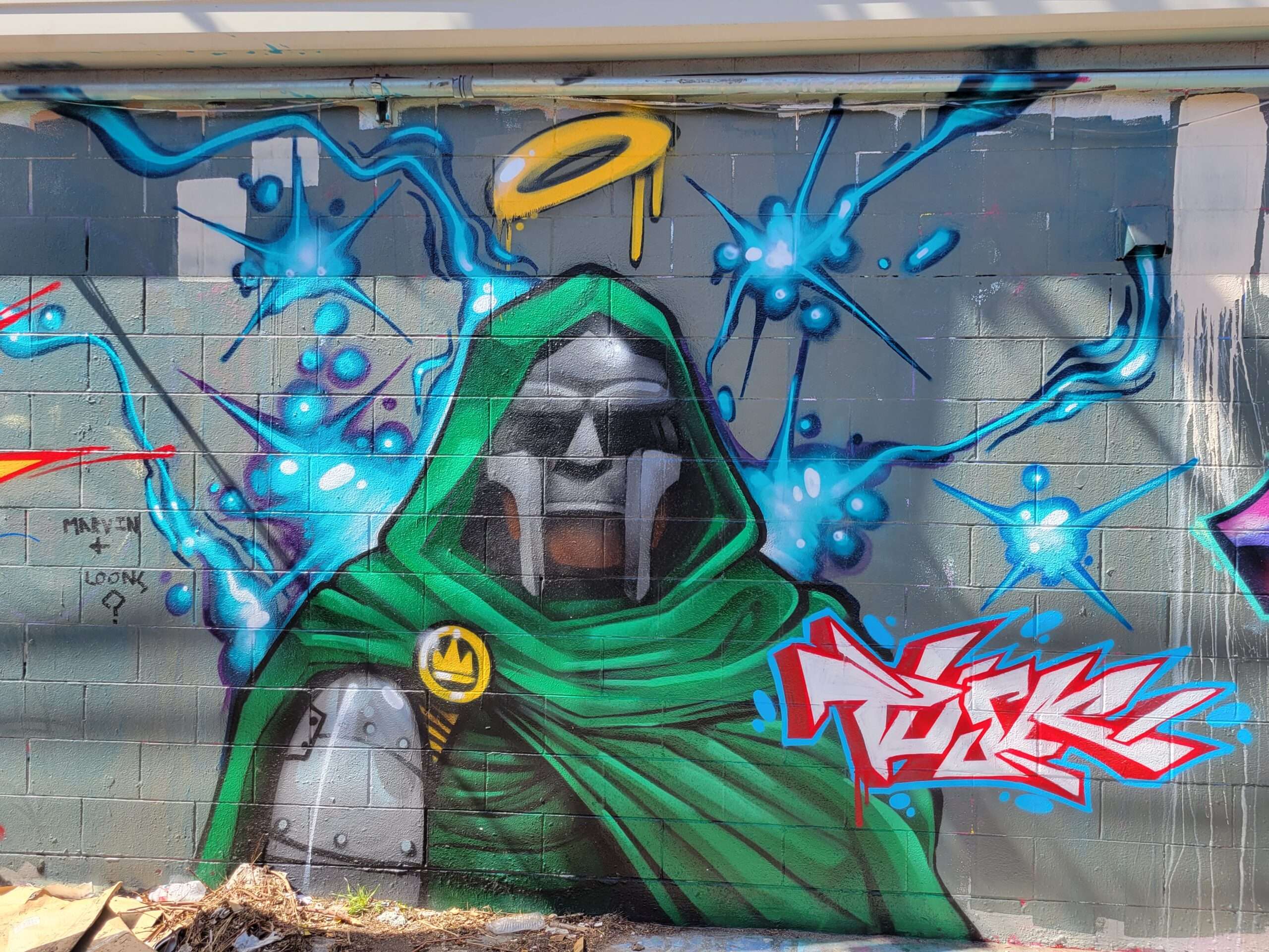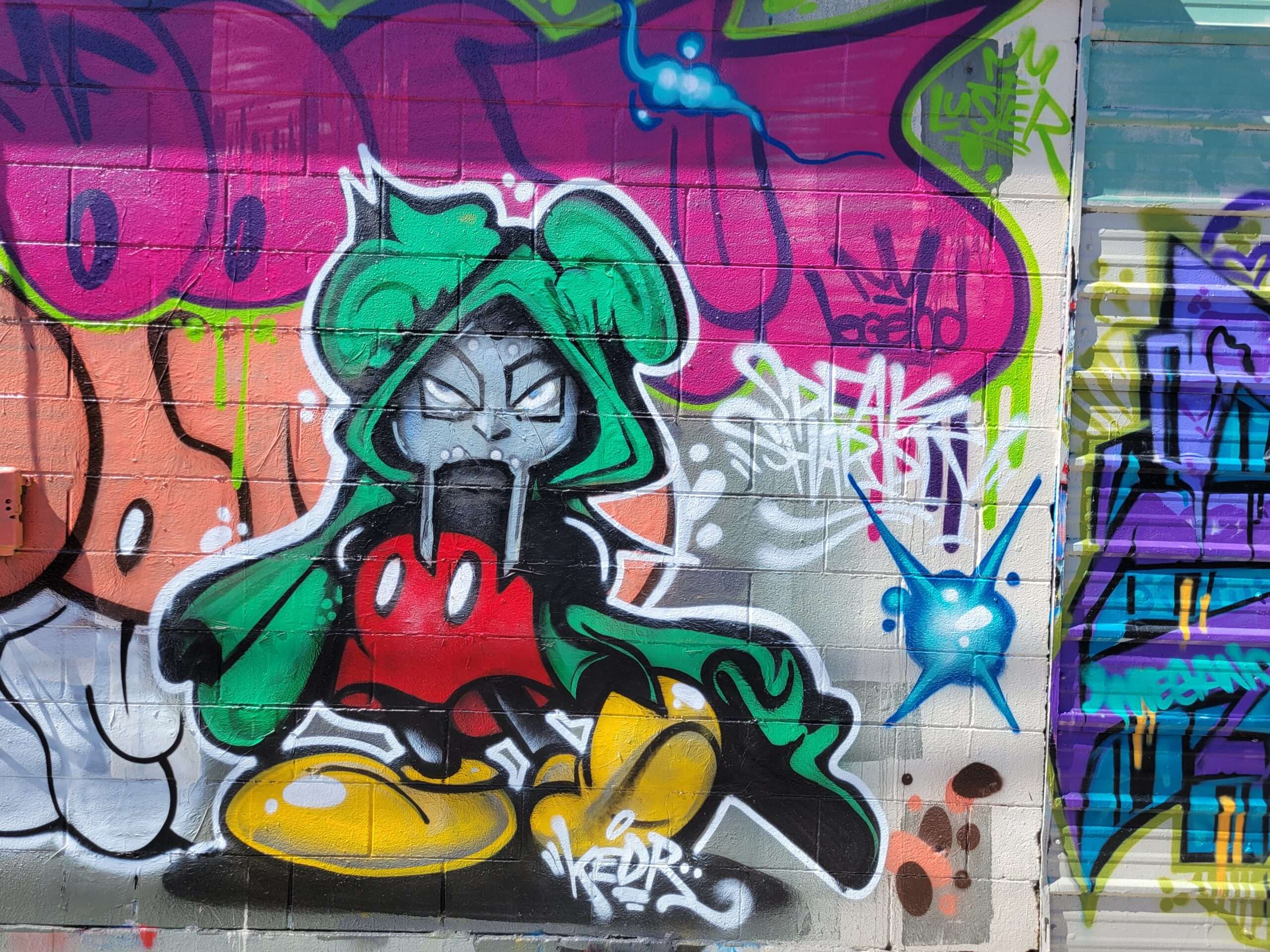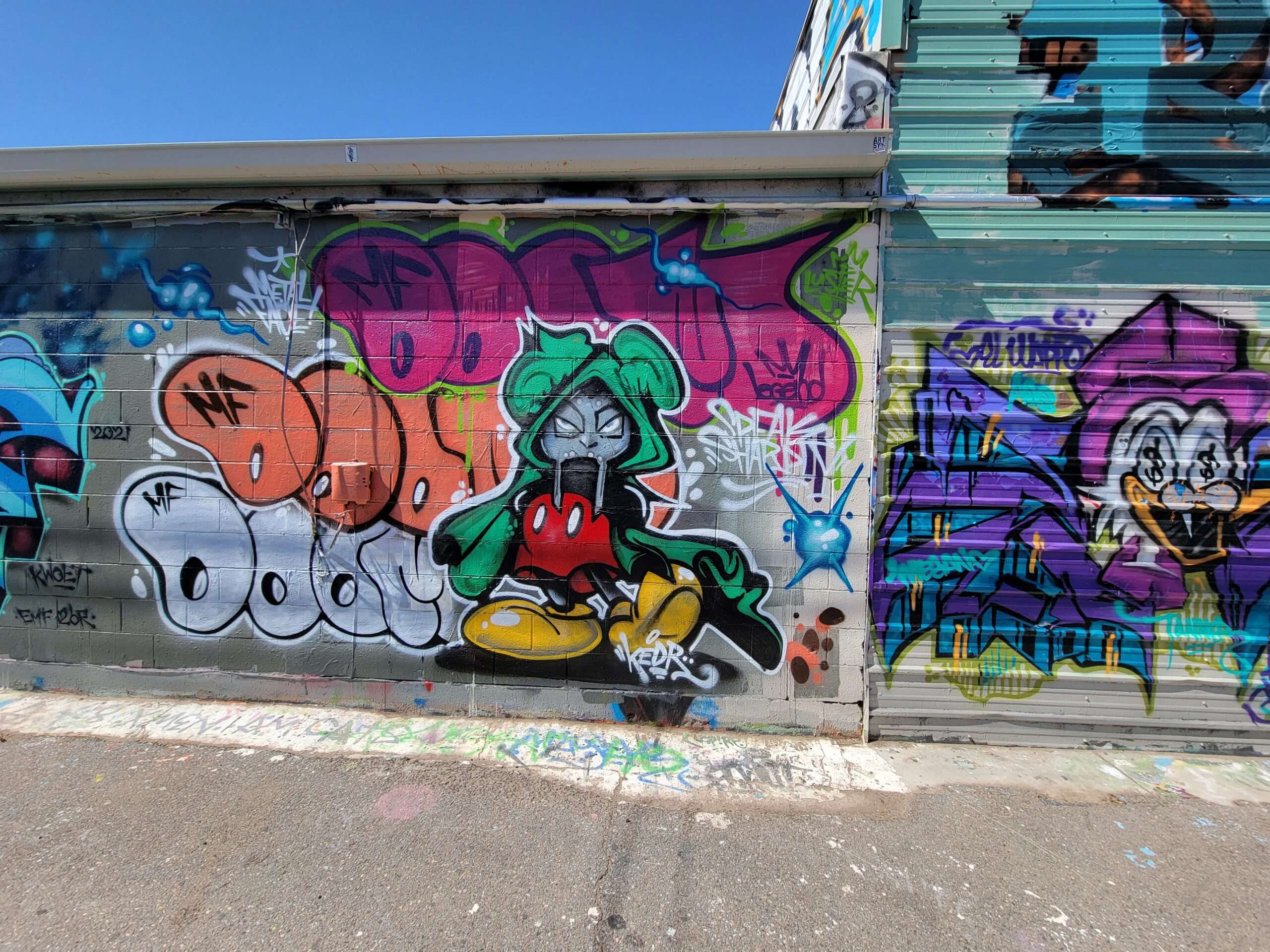 This photograph captures the full scale of a long, horizontal mural on a white-painted cinderblock wall. On the left is the previously documented "Masked Mouse" (Mickey Mouse x MF DOOM mashup). To its right, the mural continues with a stylized duck character—reminiscent of Scrooge McDuck—featuring dollar signs in its eyes and a wide, grinning mouth. The character is surrounded by intricate purple and blue graffiti lettering. To the far left, large grey and orange "DOOM" tags are visible. The wall is topped with green and blue corrugated metal, and the asphalt ground shows colorful paint splatters from the mural's creation.