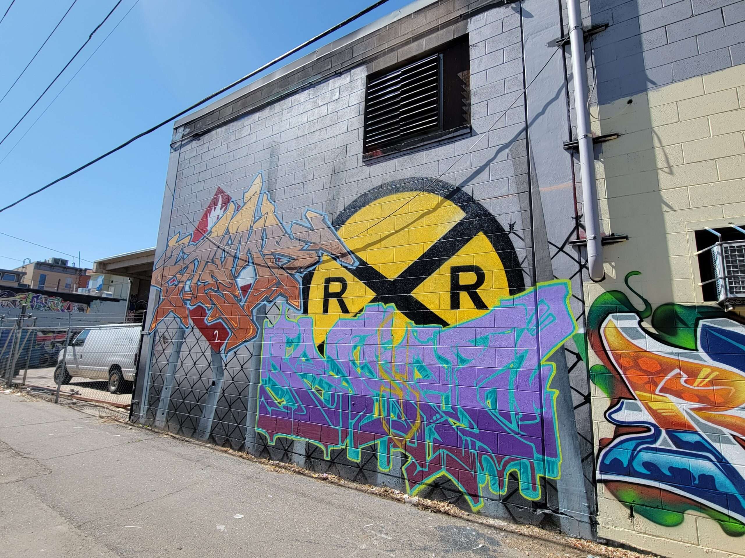 This photograph captures a large mural painted on a cinderblock wall that transitions from dark grey to light tan. The background features a monumental yellow circle with a black "X" and two "R"s, mirroring a standard railroad crossing sign. Overlapping this symbol is a massive piece of purple and teal graffiti lettering with stylized drips. To the left, a separate piece of orange and red lettering is visible, framed by a painted black chain-link fence pattern. The scene is set in a sunny alleyway, with a white utility van parked in the background and a grey vent protruding from the building wall.