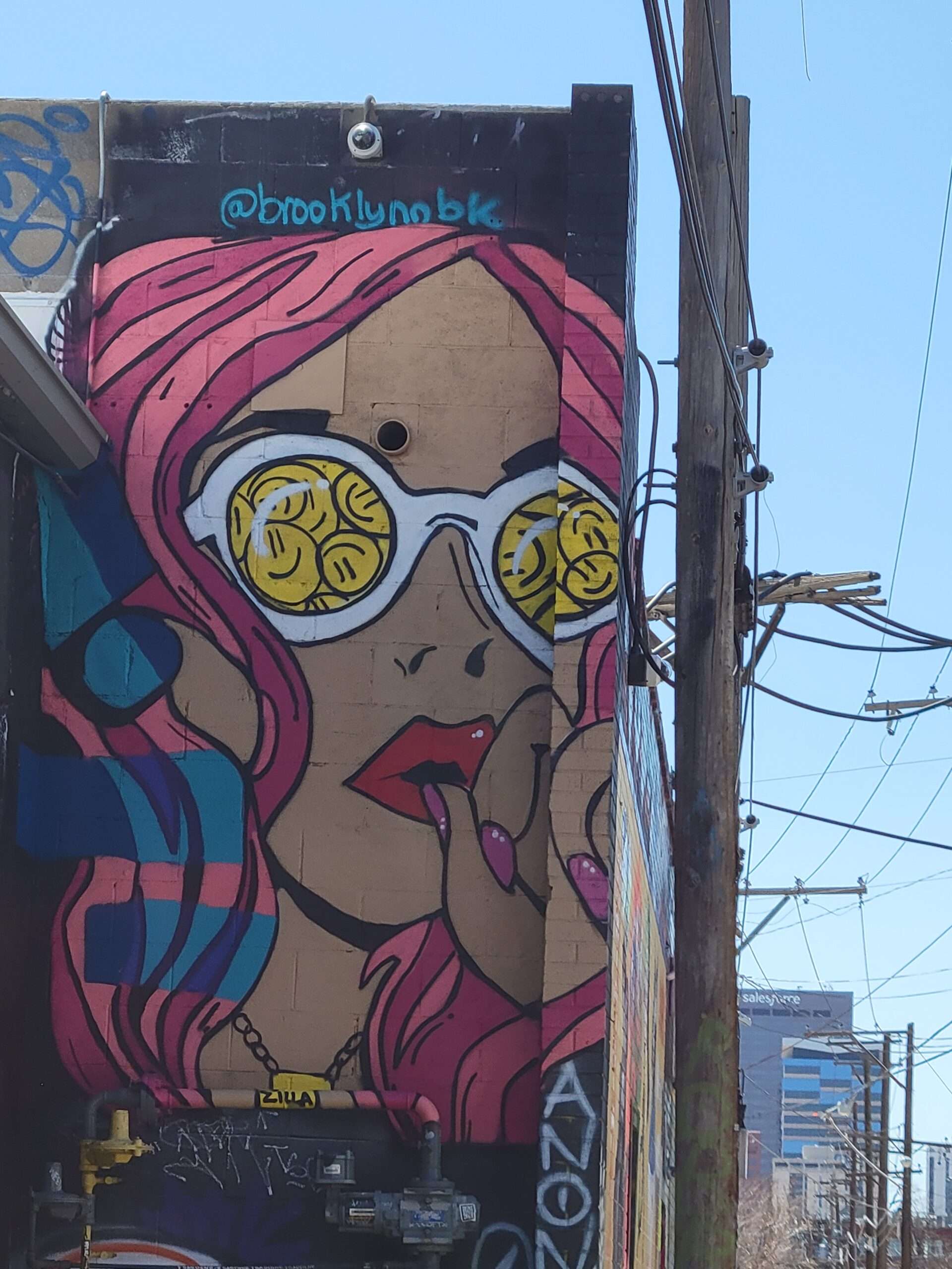 This photograph captures a large-scale vertical mural painted on the side of a tan brick building. The focal point is a woman’s face, featuring voluminous, hot-pink hair and bright red lips. She is wearing oversized white-framed sunglasses, and rather than a traditional reflection, the lenses are filled with a pattern of classic yellow smiley faces. She is captured in a contemplative pose, with her hand near her chin and one finger resting against her lip. The background to her left features a geometric blue and purple pattern, and the artist's handle, "@brooklynnbk," is written in blue at the very top. The mural is situated in a gritty alleyway, with industrial pipes and a wooden utility pole framing the right side of the shot.