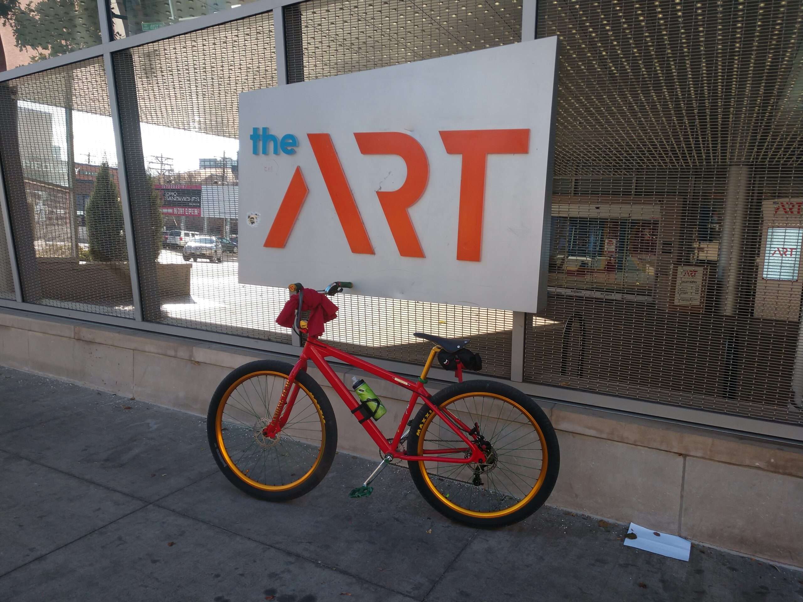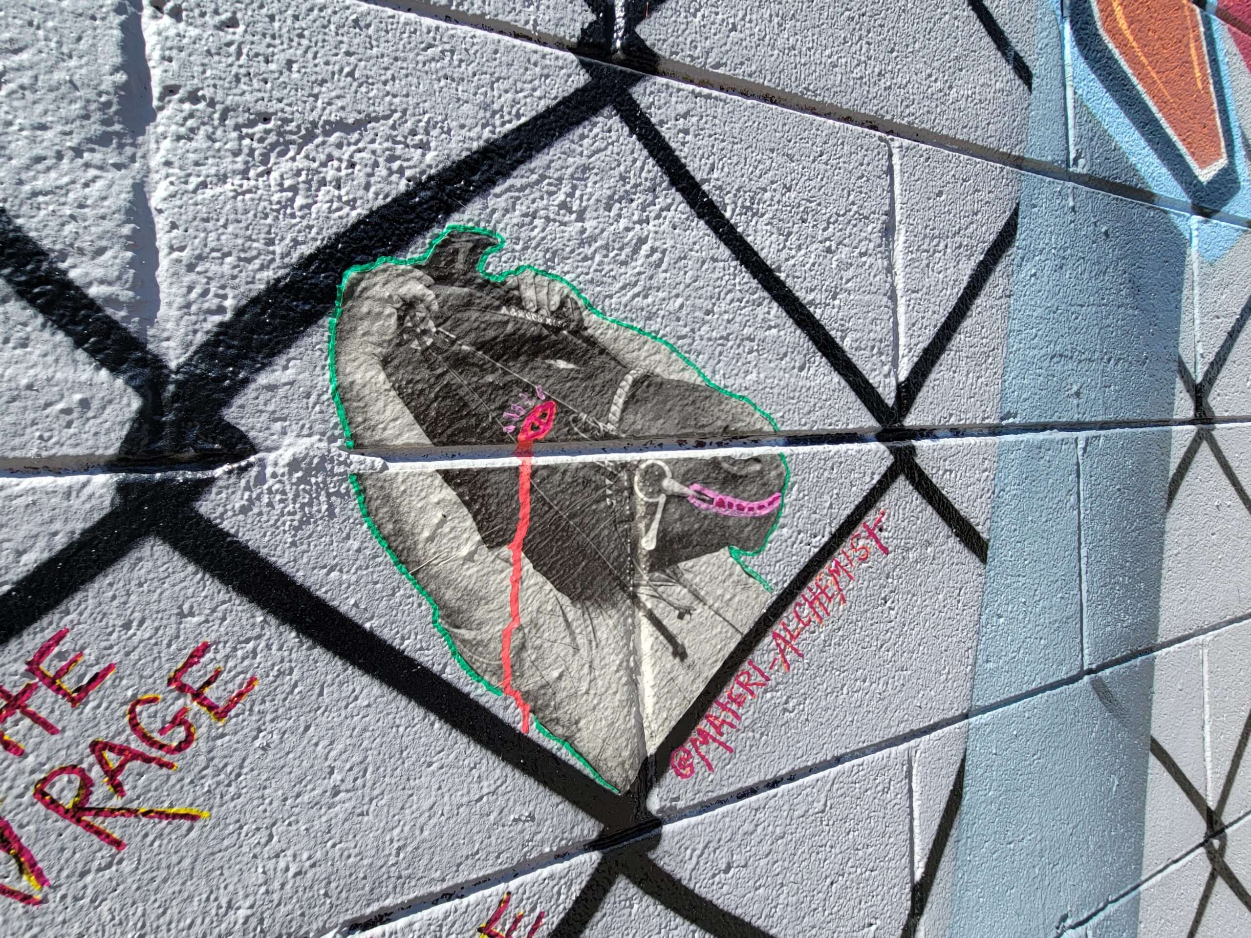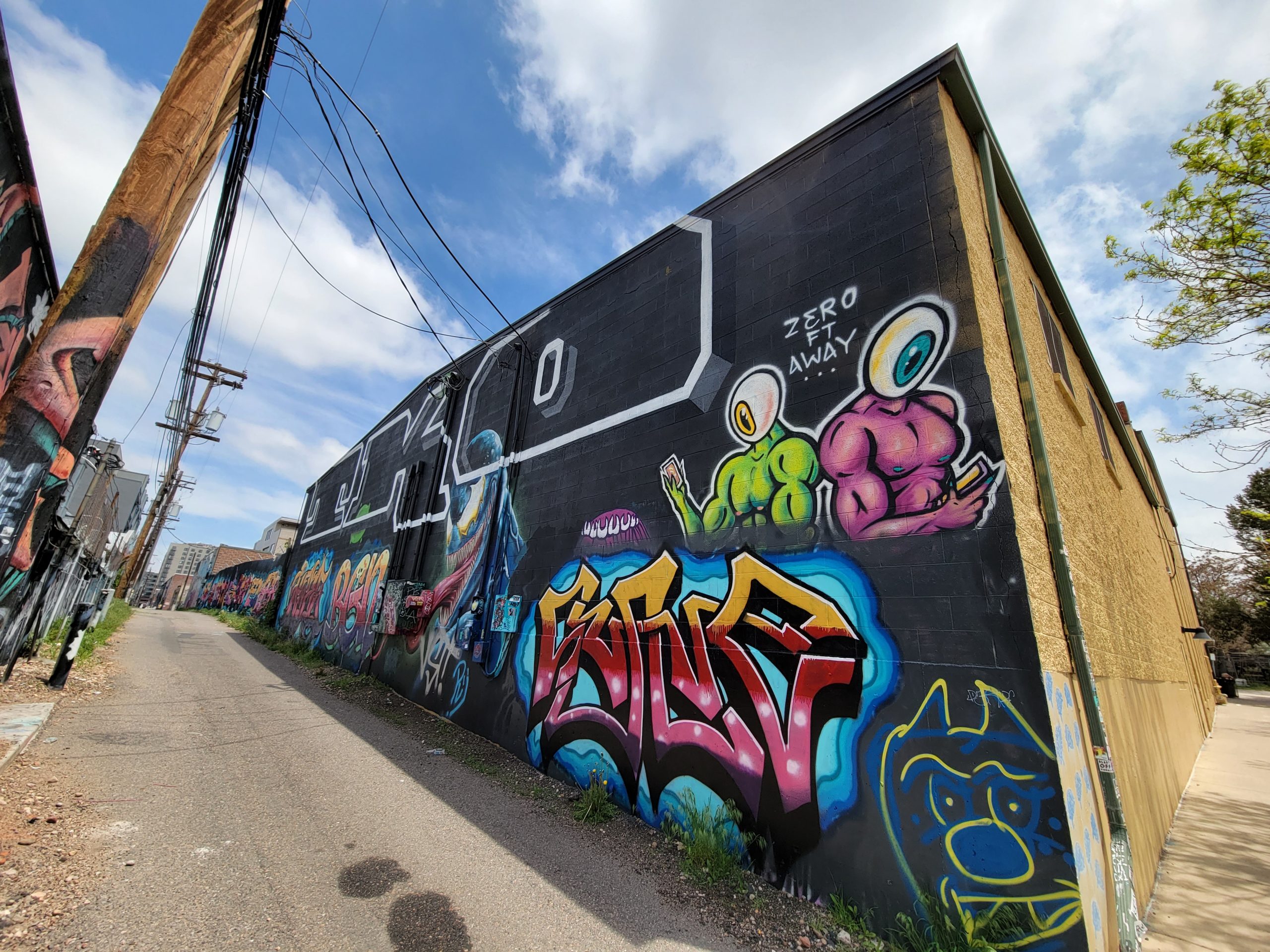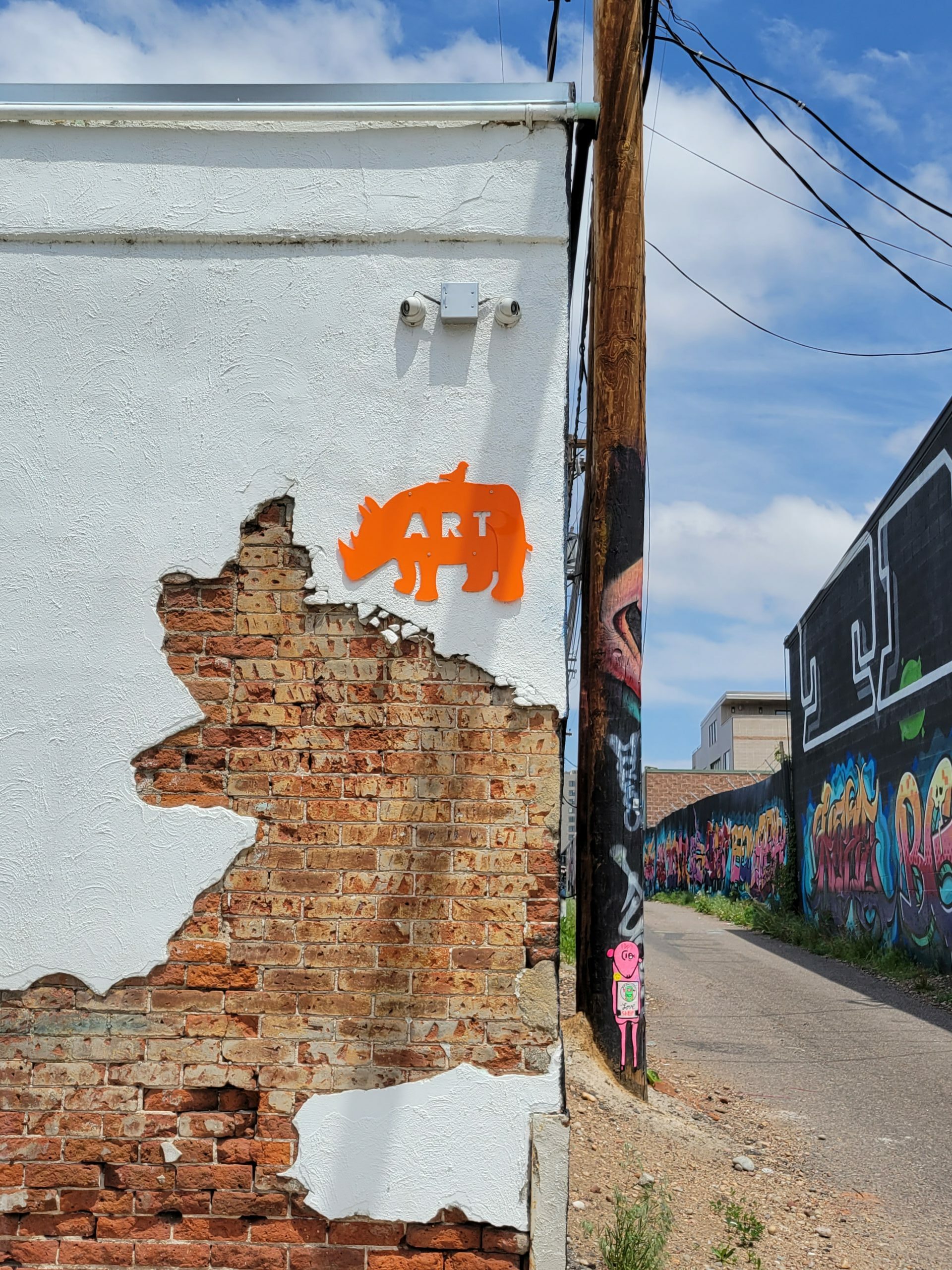 Located at the entrance of a narrow alleyway filled with colorful graffiti, this piece features a vibrant orange rhino silhouette. The word "ART" is stenciled clearly through the center of the rhino's body. The sign is mounted on a white stucco wall that has been intentionally chipped away in a jagged, organic shape to reveal the historic red and tan brick layered beneath. Positioned next to a weathered utility pole and overlooking a path of murals, this work perfectly blends modern graphic design with the gritty architectural history of Denver.