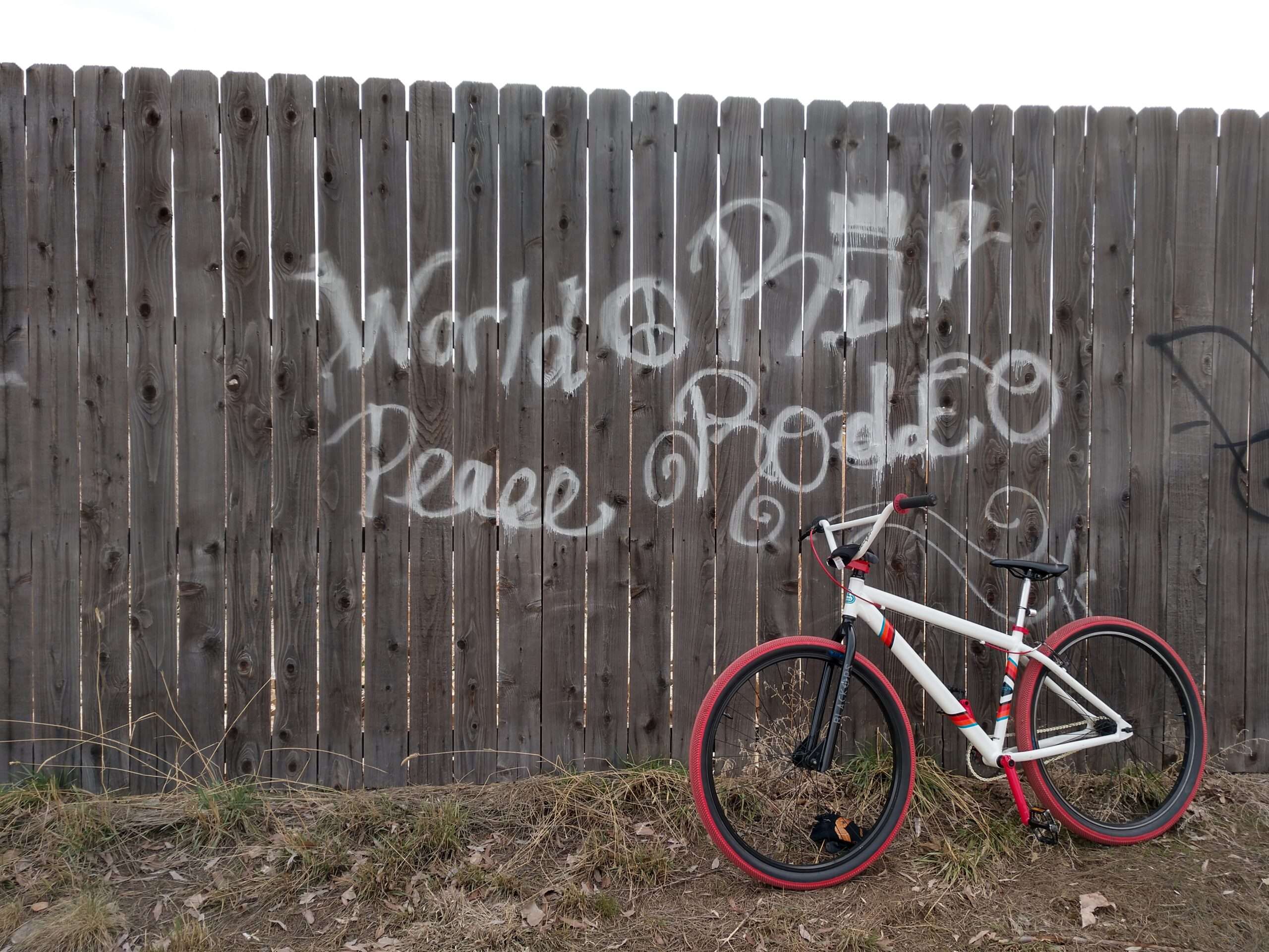This photograph features a white bicycle with striking red tires leaned against a rustic, vertically-planked wooden fence. The fence serves as a canvas for white hand-painted script that reads "World Peace" on the top line and "Rodeo" on the bottom, with a peace symbol integrated between the words. The bicycle features a white frame accented by a unique set of colorful red, teal, and yellow stripes on the seat and down tubes, matching the red seat post and tires. The scene is grounded by dry grass and brush at the base of the fence under a soft, overcast sky.