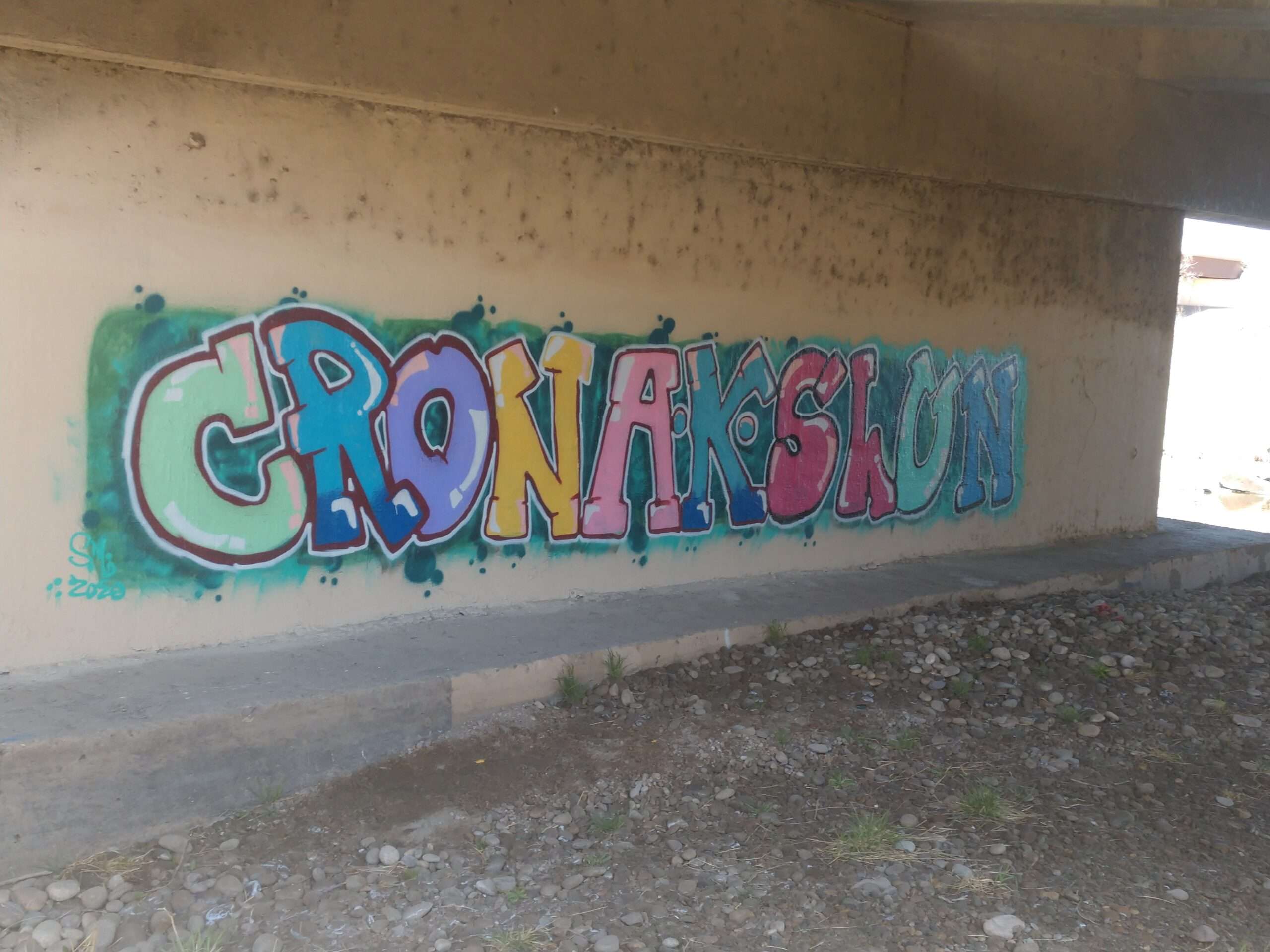 This photograph features a long graffiti piece painted on the tan exterior wall of a concrete underpass. The artwork consists of large, stylized bubble letters that appear to spell out "CRONAKSLON". Each letter features a unique combination of pastel colors, including mint green, sky blue, lavender, pale yellow, and rose pink, all outlined in a deep blue. A soft teal "cloud" or aura surrounds the entire word. A small signature and date, "SM 2020," is visible in the lower-left corner in teal paint. The mural is situated above a concrete ledge, with the ground below covered in smooth, grey and tan river stones.