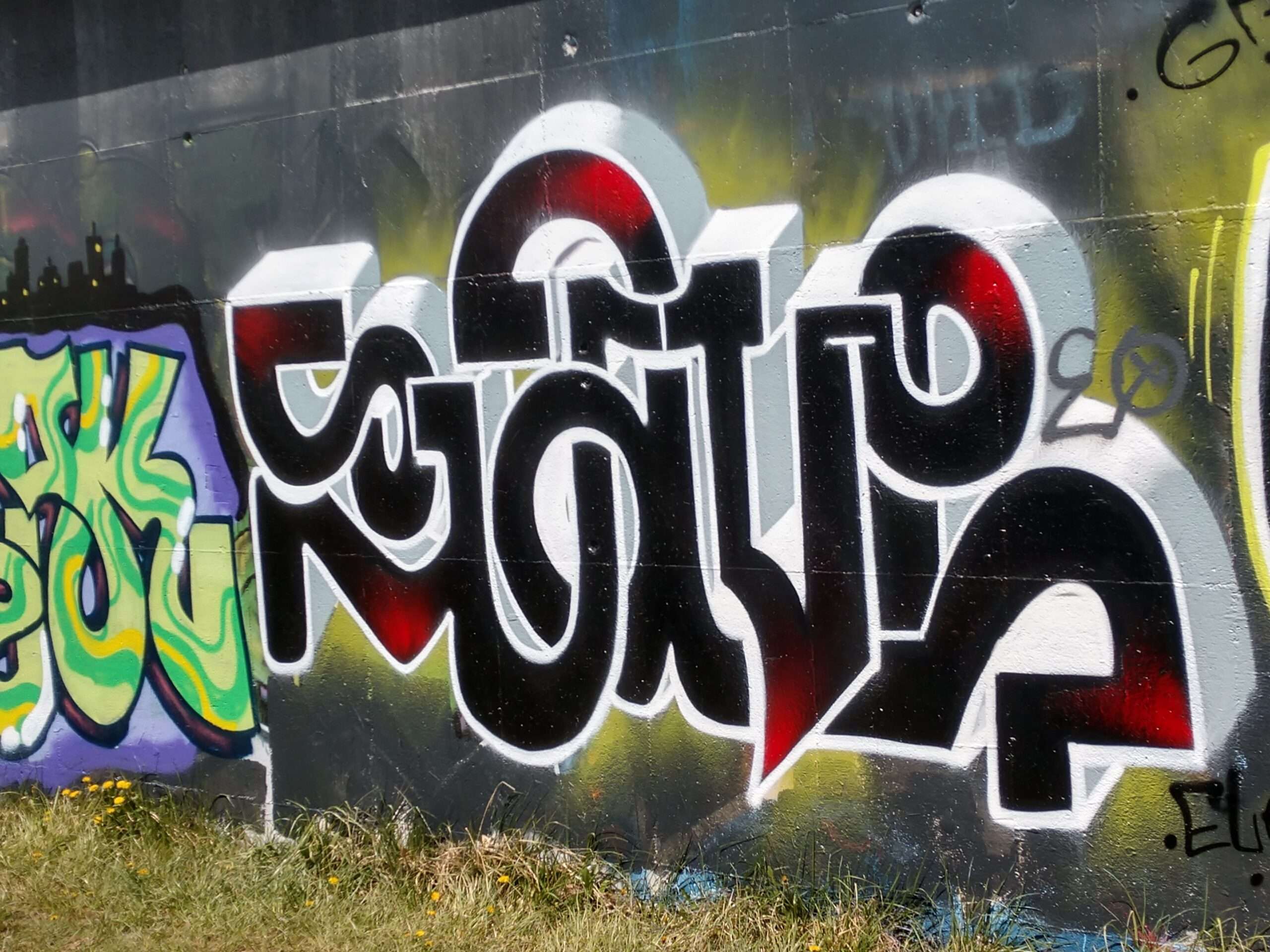 This photograph captures a detailed section of a larger graffiti installation on a concrete wall. The central tag features thick black letters with a white 3D-effect border, accented by atmospheric red glows within the loops of the characters. The text appears to spell out "NOTIRE" in a complex, interlocking font. Above the tag on the left, a small silhouette of a city skyline is painted in black. The base of the wall is bordered by green grass and scattered yellow dandelions, while a separate green-and-yellow mural is partially visible to the far left.