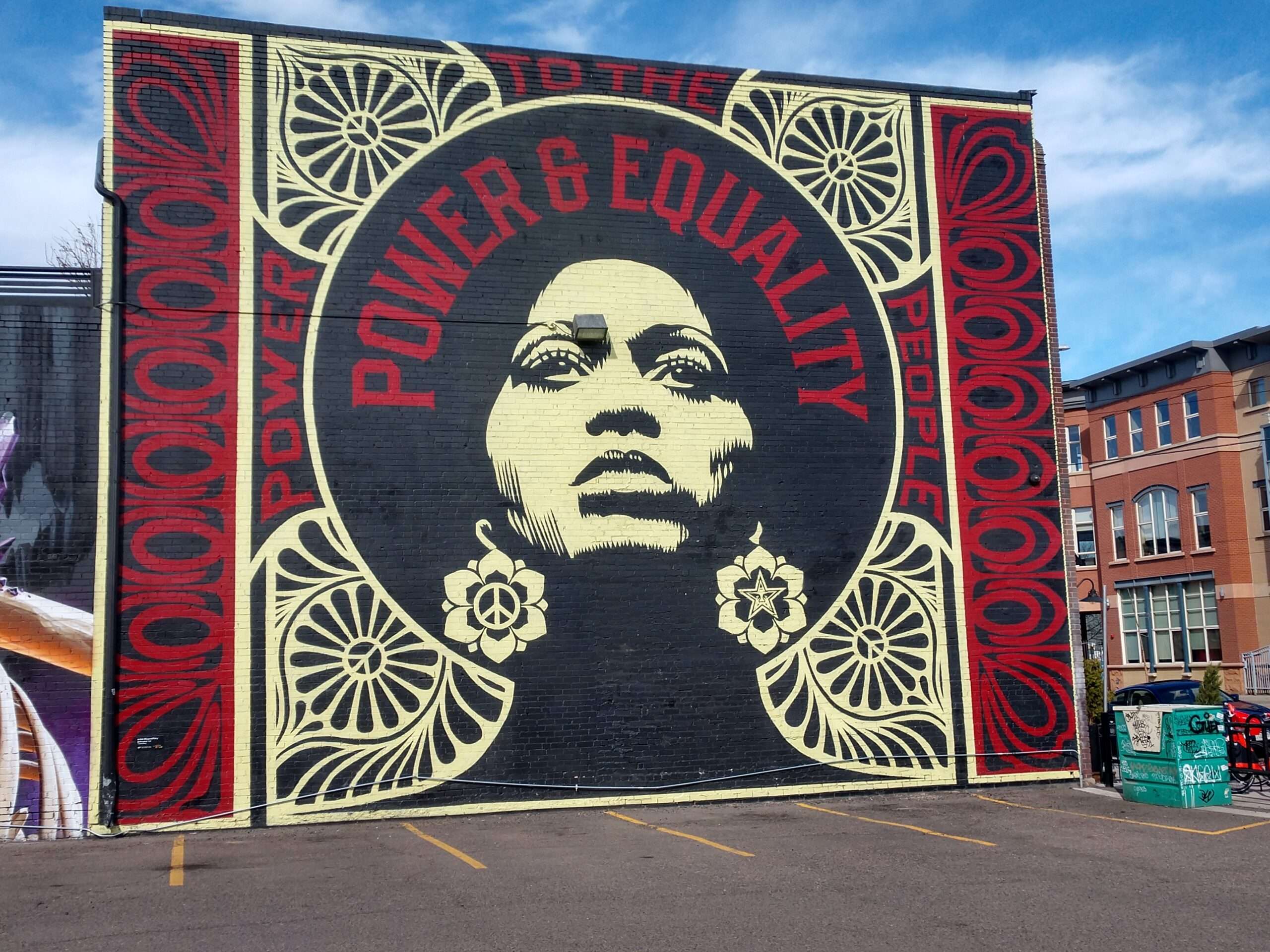 This expansive mural is painted on the black brick exterior of a building bordering an asphalt parking lot. The central focus is a large, high-contrast portrait of a woman looking upward, rendered in a cream and black palette. She wears large, circular earrings—one featuring a peace sign and the other a star. The portrait is encased in an ornate circular border containing the words "POWER & EQUALITY TO THE PEOPLE" in bold red and cream block lettering. The entire composition is framed by intricate, symmetrical floral and scrollwork patterns in deep red and cream that stretch to the edges of the wall.