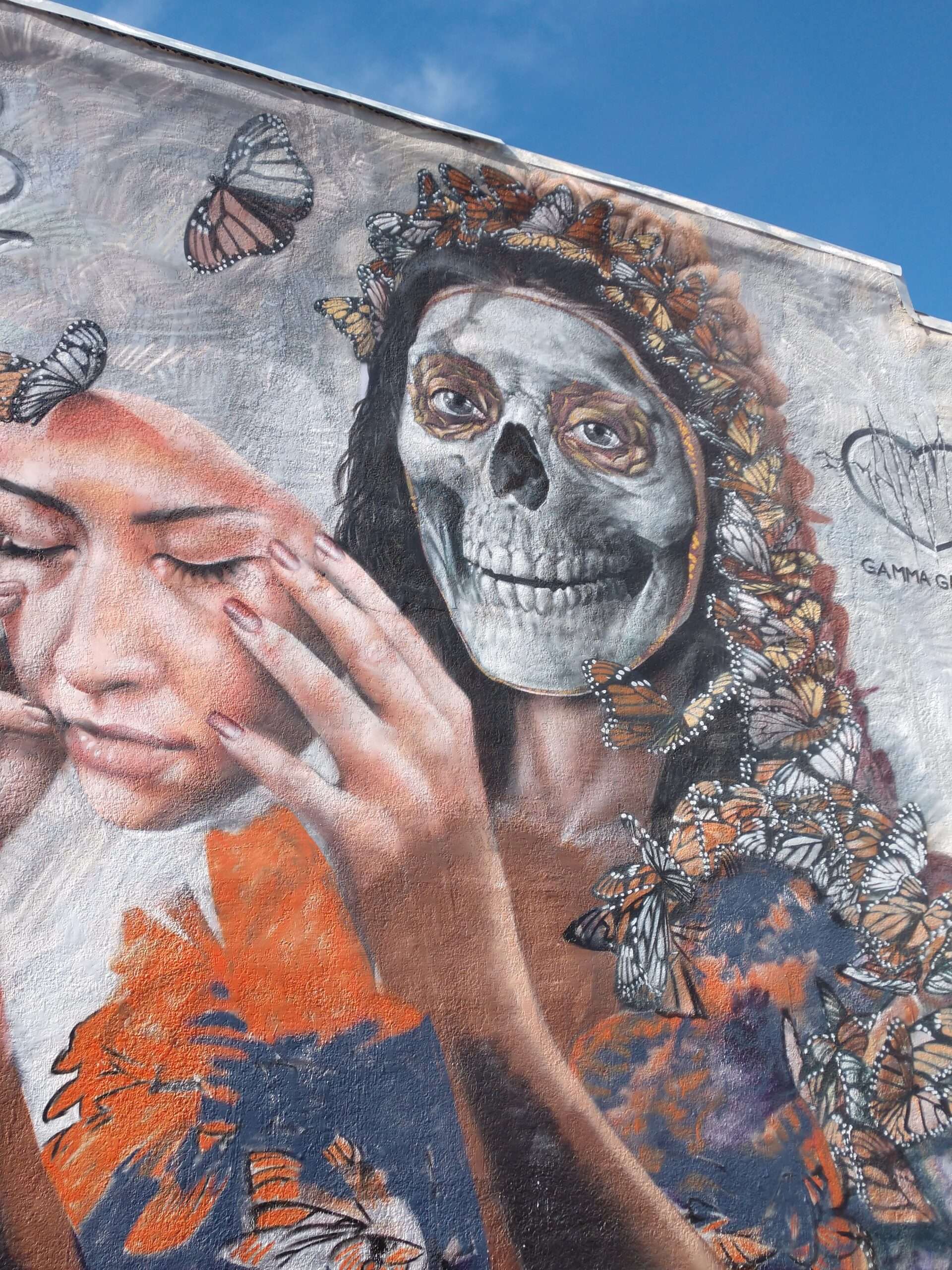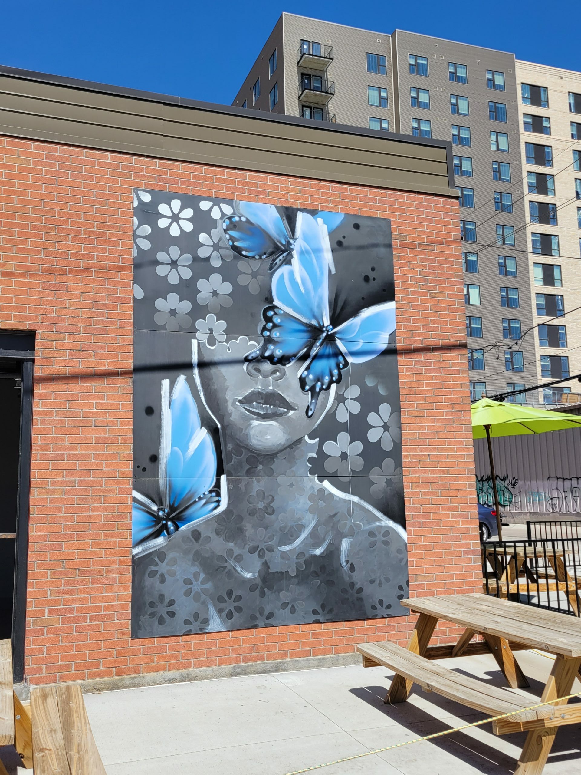 This captivating street art mural transforms a red brick exterior into a stunning visual feature for a local patio space. The artwork features a stylized, monochromatic portrait of a woman whose skin is adorned with a delicate, repeating flower pattern. Creating a dramatic and beautiful contrast, large, brightly colored blue butterflies rest across the figure, with one gracefully obscuring her eye. Framed by wooden picnic tables, a bright green umbrella, and modern city architecture in the background, this piece perfectly exemplifies how urban art is seamlessly integrated into everyday social environments.