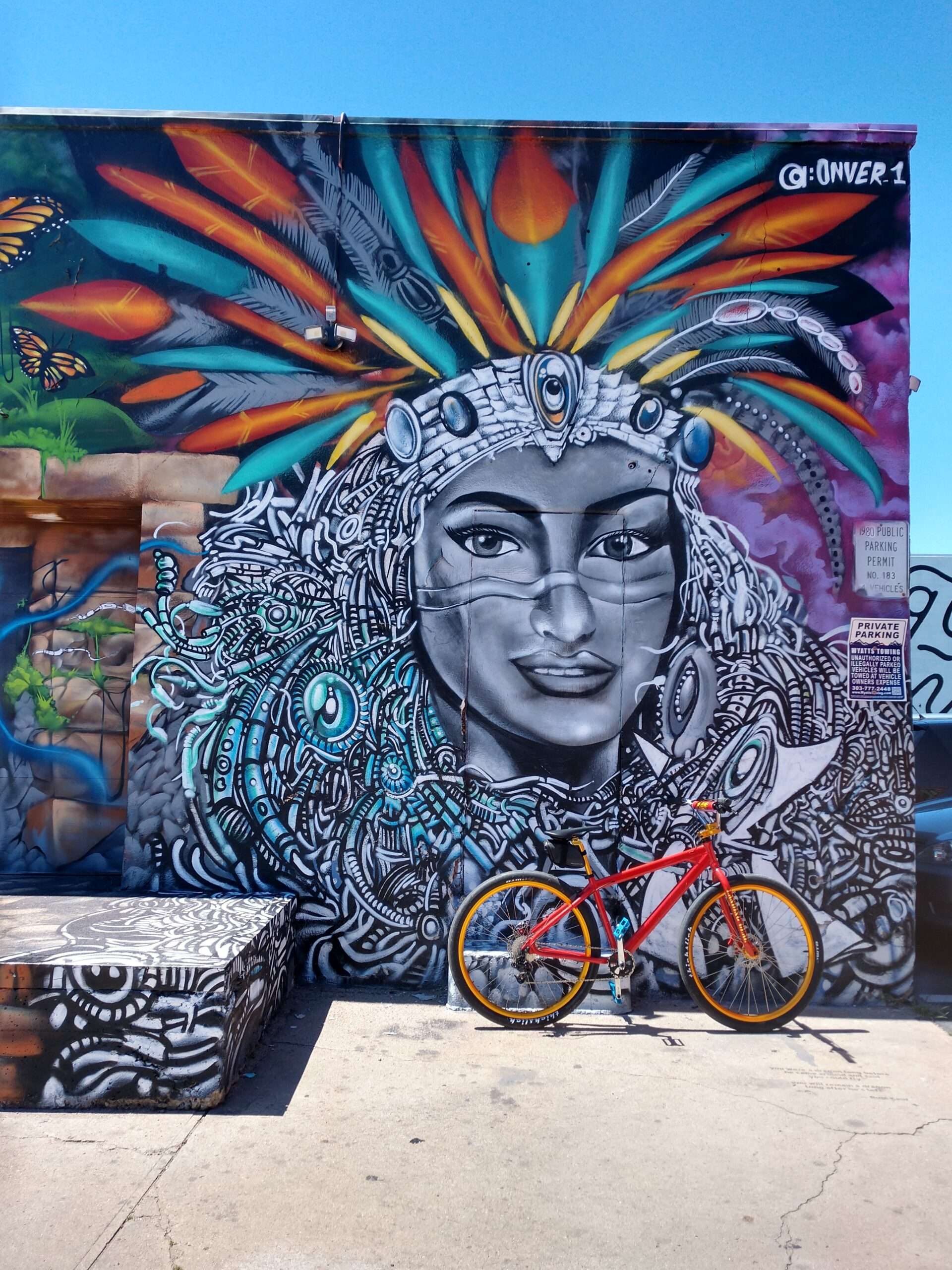 This mural, signed by @ONVER.1 in the top right corner, features a central female face rendered in realistic grayscale. She wears an elaborate, tiered crown topped with a fan of long feathers in saturated shades of orange, red, yellow, and teal. Her hair and neck are detailed with intricate, cyan-colored bio-mechanical or futuristic patterns that give the piece a "cyber-indigenous" aesthetic. Your red bicycle with gold-rimmed tires is parked on the sidewalk directly in front of the mural, framed against the vibrant blue and purple background. To the left, monarch butterflies are seen fluttering near a rocky landscape.