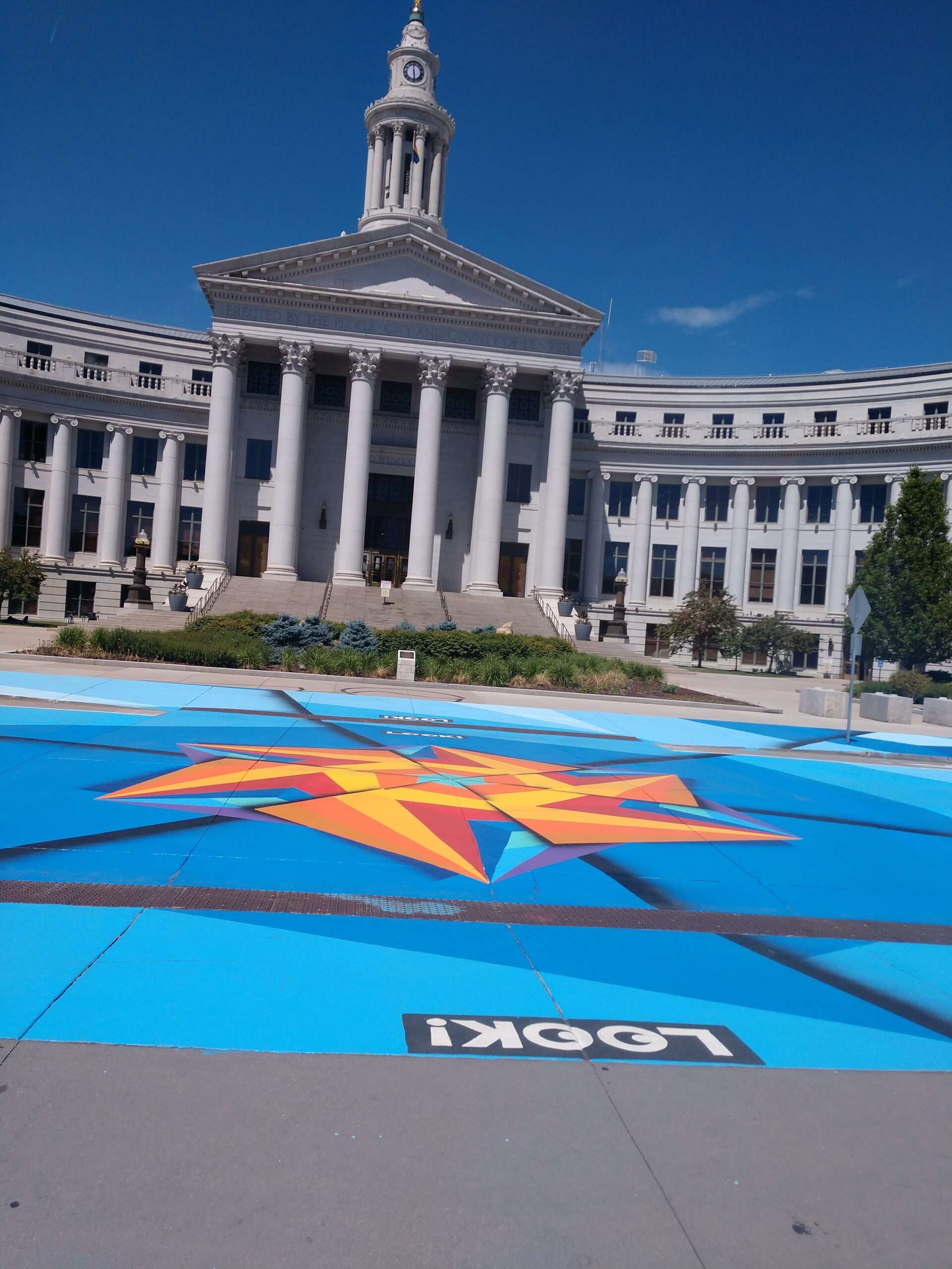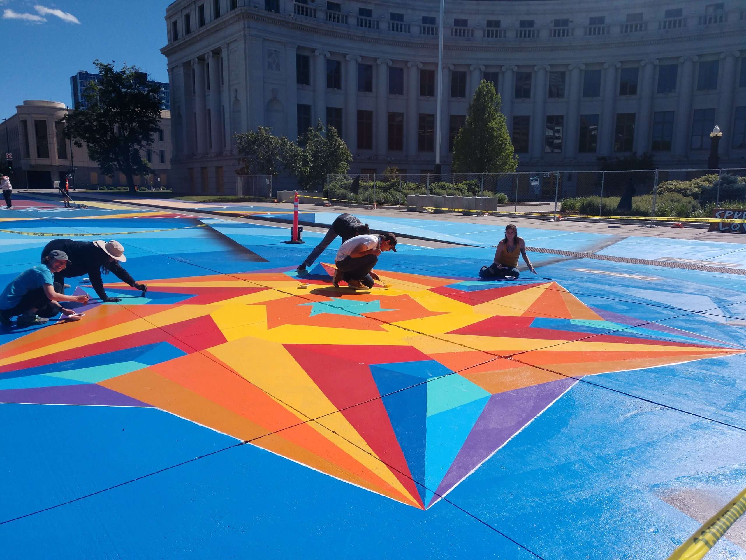These photographs document the creation of a large-scale geometric mural on the plaza of the Denver City and County Building. The mural features a saturated blue base layered with cyan and teal shards. The central focal point is a multi-pointed starburst in brilliant shades of yellow, orange, and red. Several artists are shown on the ground, using tape and brushes to finalize the sharp lines of the design. In the background, the grand neoclassical columns of the city building rise under a clear blue sky. A small sign nearby reminds passersby to "SPREAD LOVE".