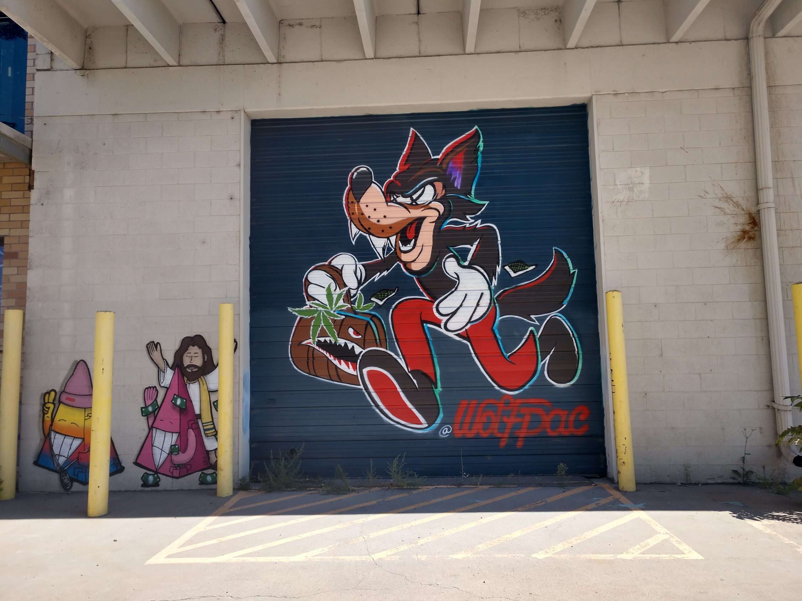 This mural is painted on a dark blue metal roll-up garage door. The central figure is a stylized cartoon wolf with a wild, wide-eyed expression and a large, open mouth showing sharp teeth. The wolf is depicted in a mid-run pose, wearing bright red pants and white "Mickey Mouse" style gloves. In one hand, he carries a brown bag that features a jagged, sharp-toothed mouth and a large green cannabis leaf sticking out of the top. The tag "@Wolfpac" is written in red script in the bottom right corner. To the left of the garage door, on the white cinderblock wall, there is a small mural of a smiling purple-and-pink pyramid character wearing a crown and a yellow crayon character making a peace sign.