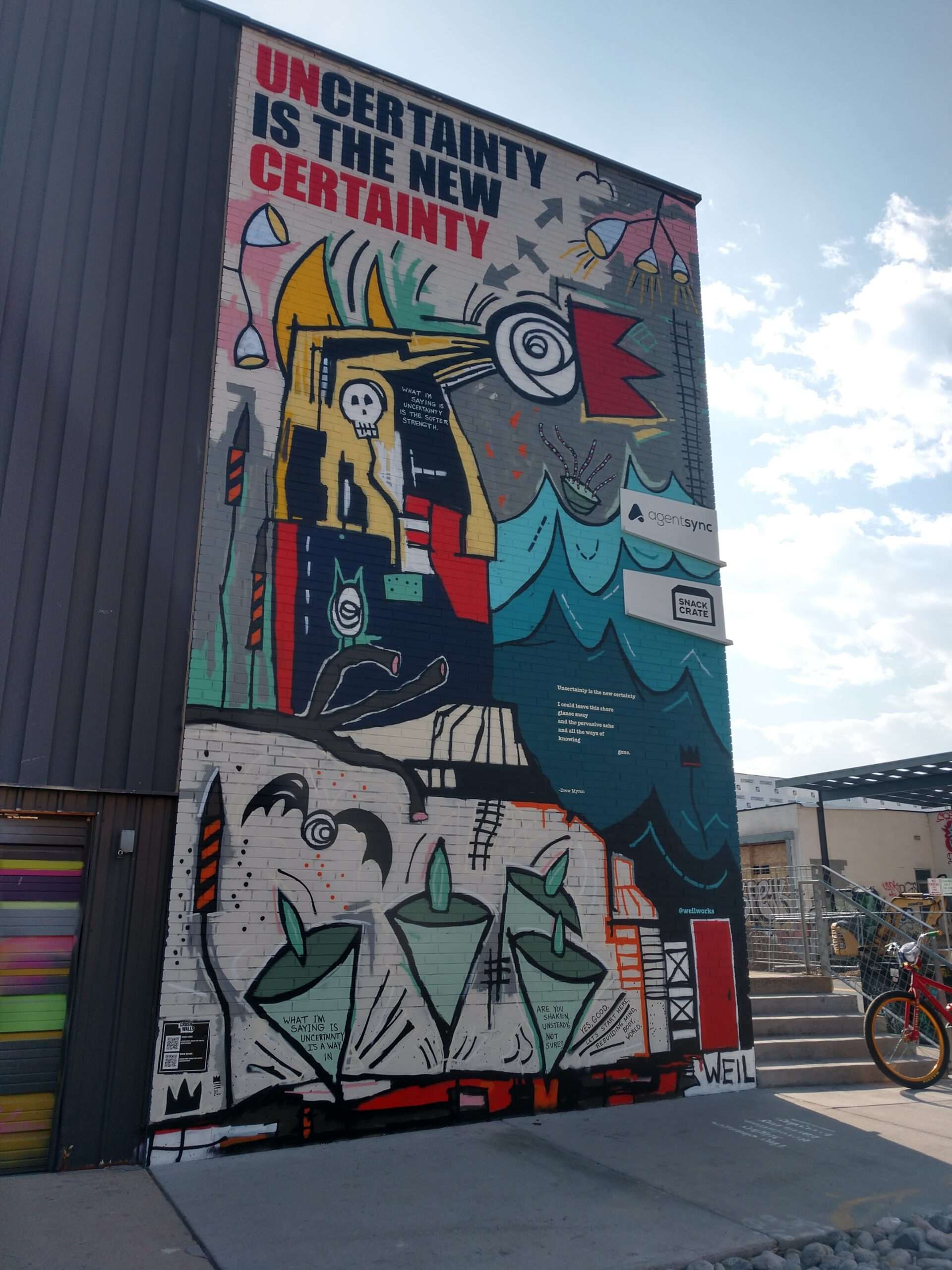 This towering mural spans the height of a light-colored brick building, dominated by the phrase "UNCERTAINTY IS THE NEW CERTAINTY" at the top, with the word "CERTAINTY" highlighted in red. The composition below is a dense mix of abstract and symbolic elements: a yellow figure with a small skull, stylized teal mountain peaks or waves, and three cone-shaped objects at the base that contain hand-written philosophical notes. The mural integrates modern logos for "agentsync" and "SNACK CRATE" on its right side. Your signature red bicycle is partially visible on the far right, parked near a set of concrete stairs.