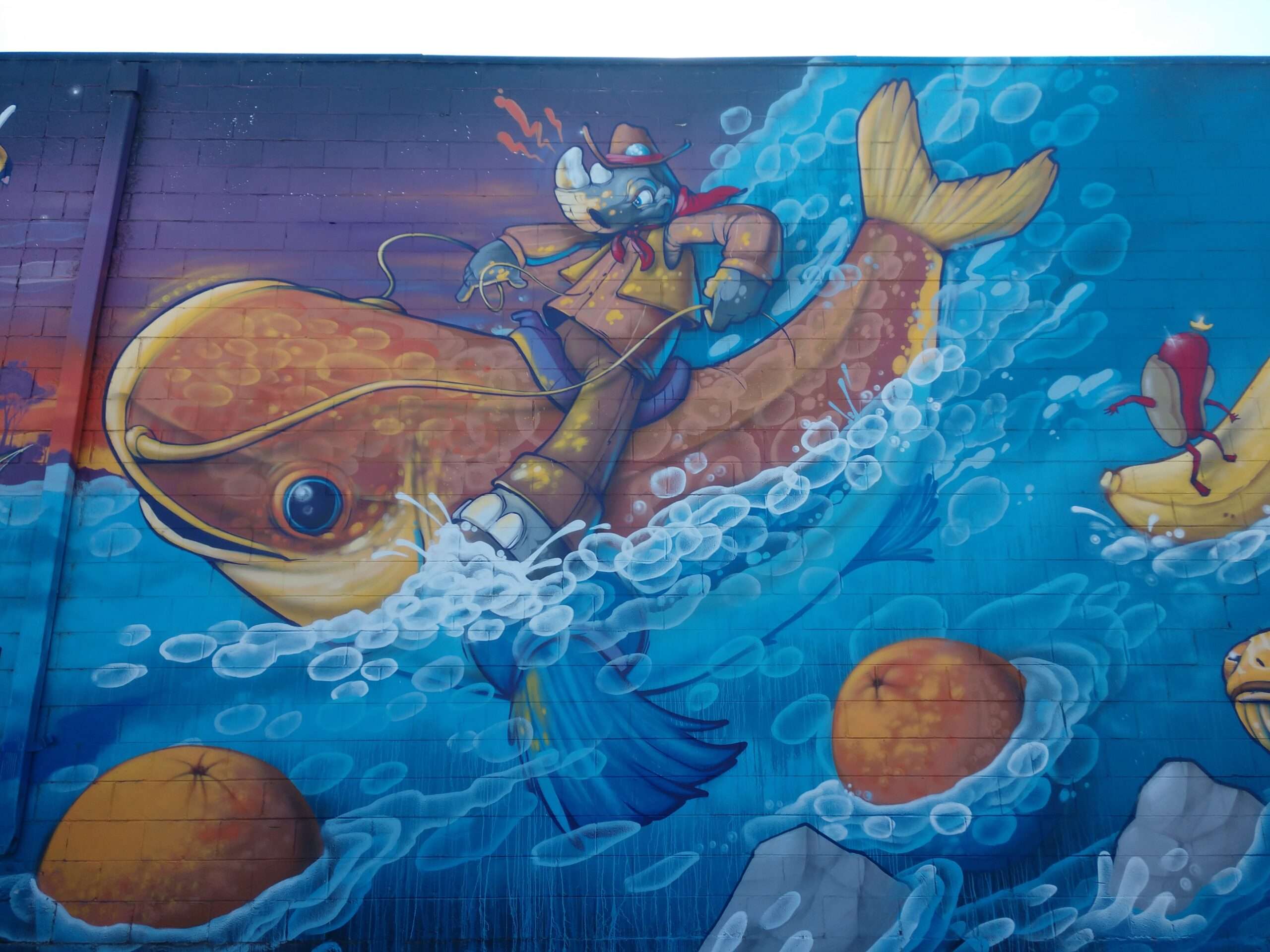 Painted on a blue cinderblock wall, this mural features a grey rhino character dressed in a brown cowboy hat, a red neckerchief, and a brown vest. The rhino is "riding" a massive, bright orange fish that resembles a cross between a goldfish and a catfish, which is depicted kicking up white foam and bubbles in the blue water. At the bottom of the mural, several whole oranges are shown floating in the water near grey rocks. To the far right, a small hot dog character wearing a tiny yellow crown is riding a yellow banana as if it were a surfboard or a vehicle. The background to the left shows a hint of a purple and orange sunset.