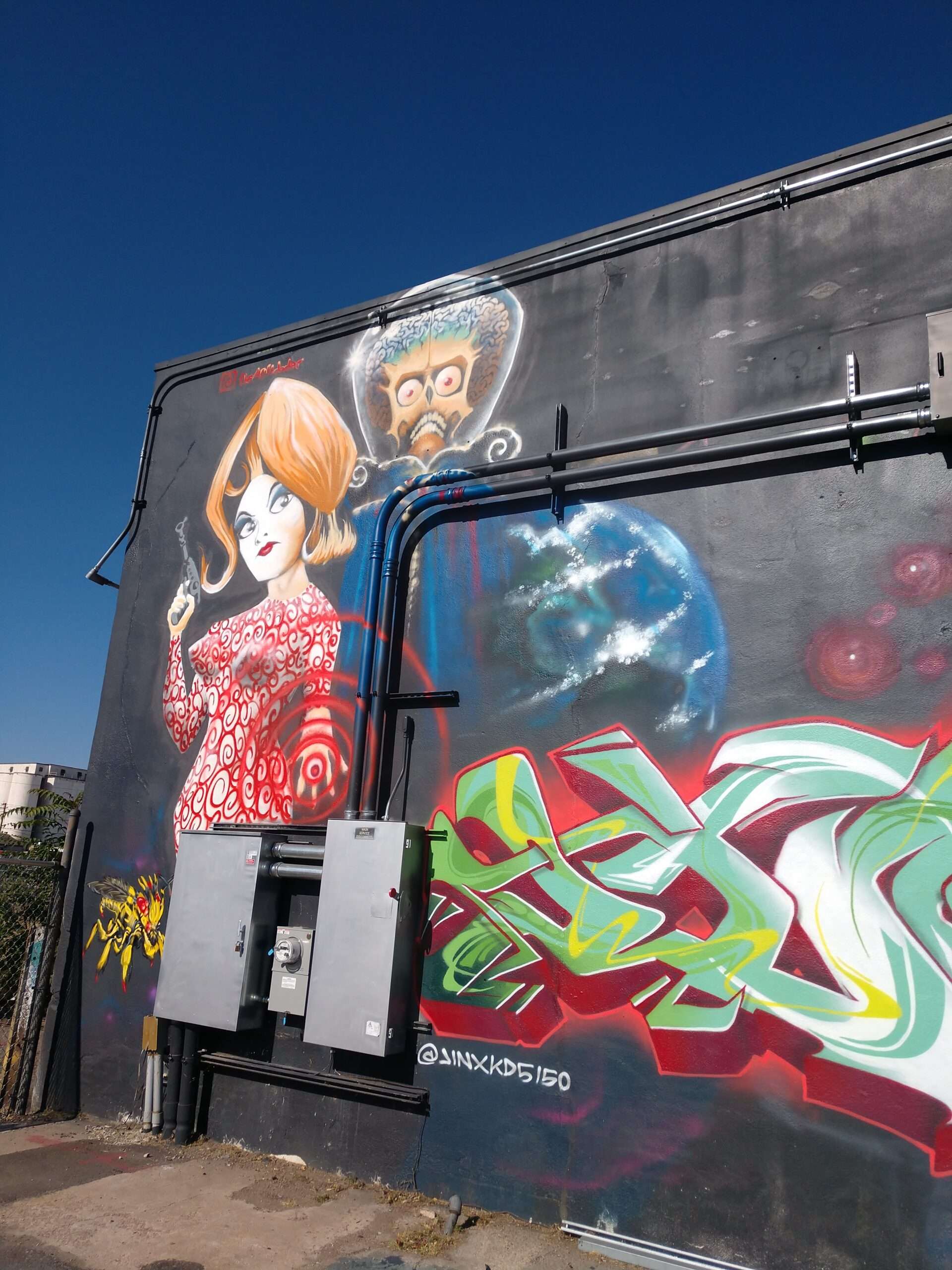 This mural, painted on a dark grey exterior wall, features the "Martian Girl" in her human disguise from the film Mars Attacks!, complete with her signature blonde beehive hairstyle and a red-and-white swirl patterned dress. She is shown holding a ray gun, with a red "sonar" effect emanating from her hand. Behind her, a classic Martian soldier with a massive, exposed brain and bulging red eyes is depicted in its glass helmet. The planet Earth and a celestial blue glow fill the background. Below the characters, a large, 3D wildstyle graffiti tag in vibrant lime green and red adds an energetic contrast. A small yellow and black hornet is visible on the far left, and the artist's handle, "@JINXKD5150," is signed at the bottom. Several grey electrical boxes and blue-painted conduits are integrated into the wall's surface.