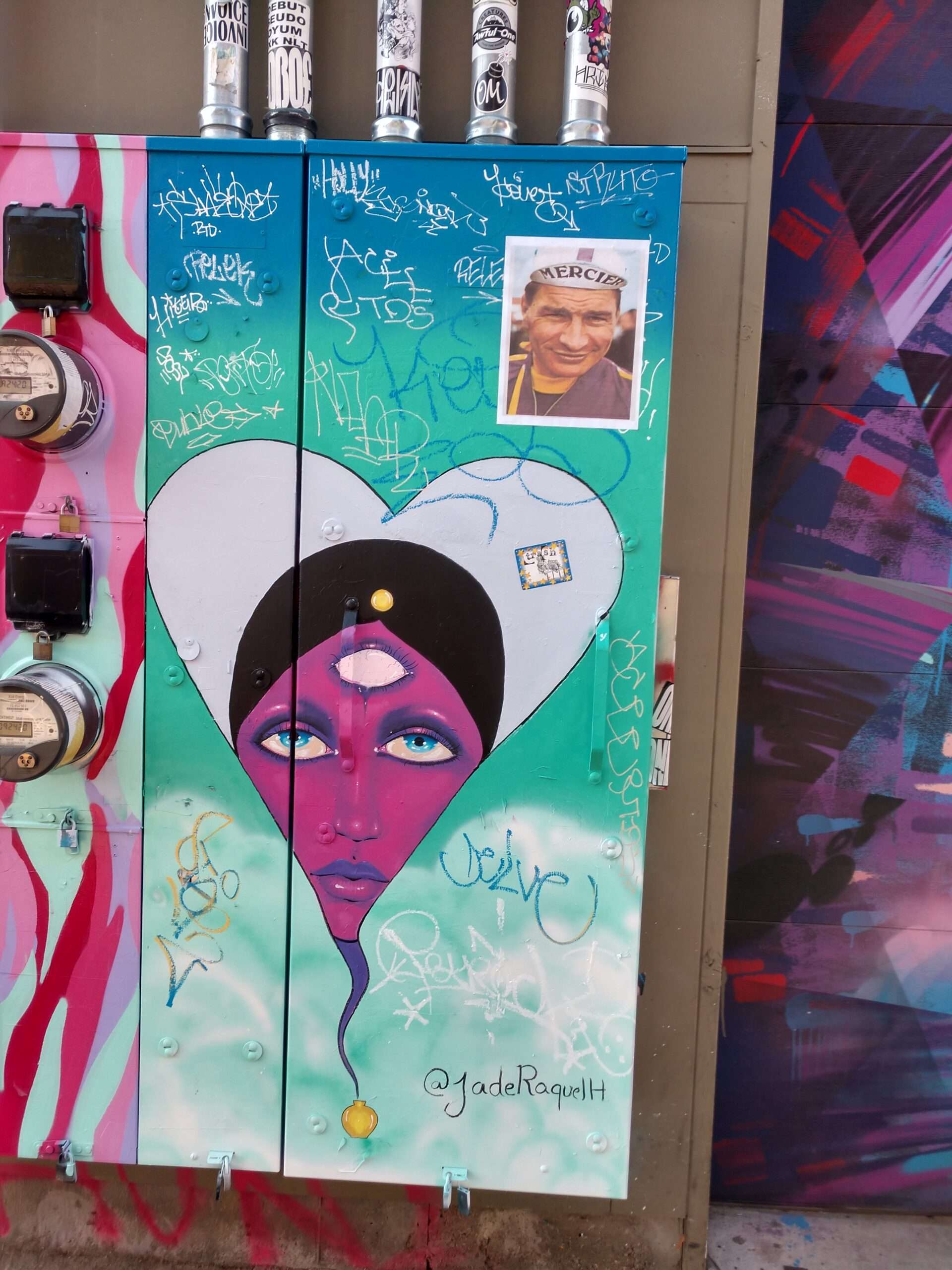 Painted on a teal utility box, this piece features a large white heart outline. Inside the heart is a stylized, purple-skinned face with three large, expressive blue eyes—two in the standard position and one centered on the forehead. The character has a black, widow's peak hairline and a long, thin purple neck that ends in a small yellow bulb. The box is covered in numerous white and black graffiti tags, including "DELVE" and "PACE". A small, rectangular photo of a smiling man wearing a vintage "MERCIER" cycling cap is pasted on the upper right side, adding a personal, collage-like touch. The artist's handle, "@JadeRaquelH," is written in black script at the bottom.