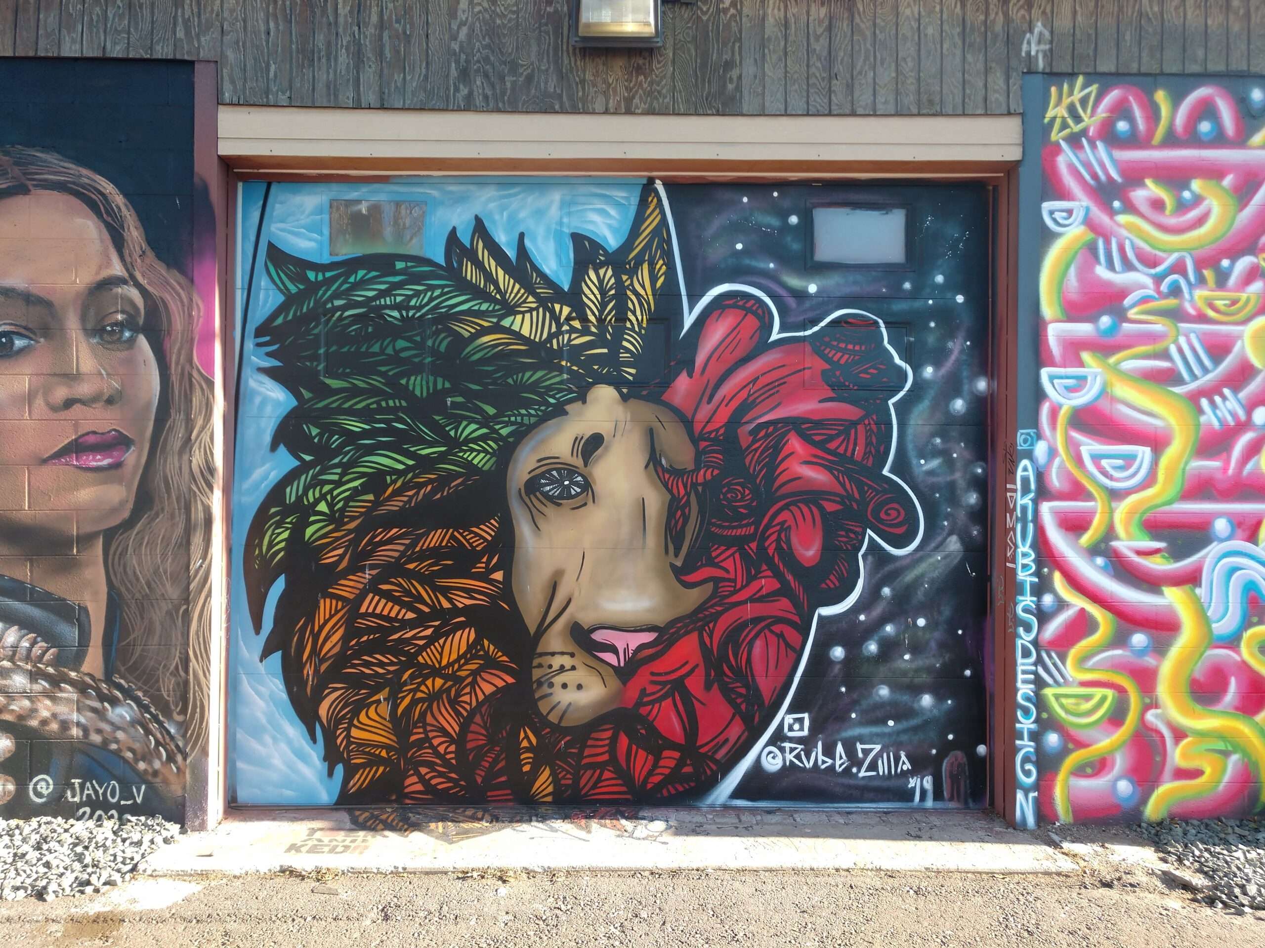 This mural, painted across a central garage door, features a unique split-face lion. The left half of the lion's face and mane is composed of intricate, overlapping leaf-like patterns in shades of green, yellow, and orange, set against a bright blue sky. The right half of the face is transformed into a large, stylized red anatomical heart, set against a dark, star-filled cosmic background. The artwork is signed "@RUBEZILLA '19" at the bottom right. It sits between two other distinct works: a realistic portrait of a woman by @JAYO_V on the left and a vertical strip of bright, abstract shapes on the right.