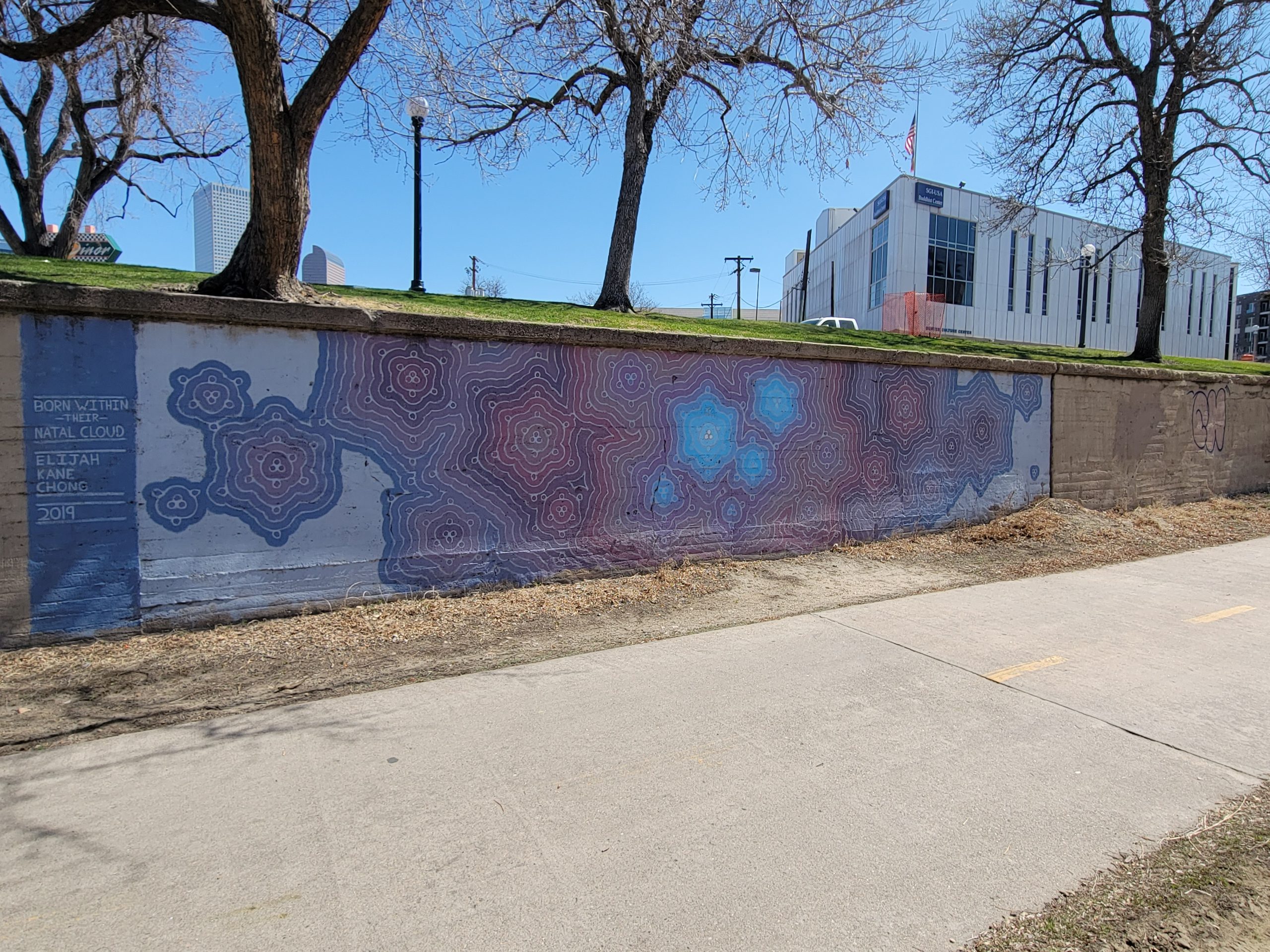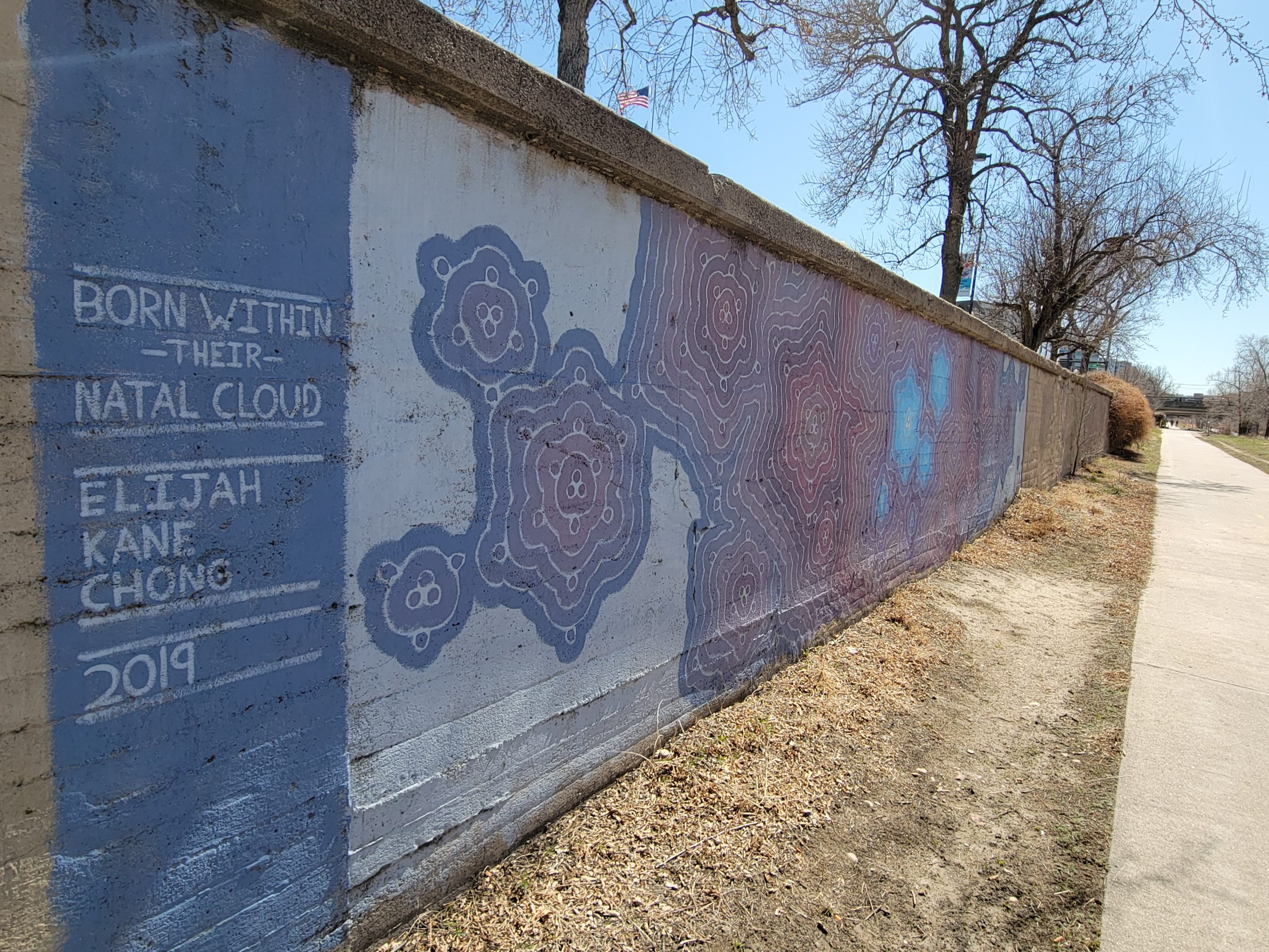 This expansive view captures the full scale of the "Natal Cloud" street mural along a paved urban trail in Denver, Colorado. The artwork's sweeping topographical patterns in cool blues, purples, and reds beautifully contrast with the stark concrete retaining wall and the adjacent grassy hill. It provides a peaceful, thought-provoking stretch of public art for cyclists and pedestrians navigating the city's extensive outdoor pathway system.
