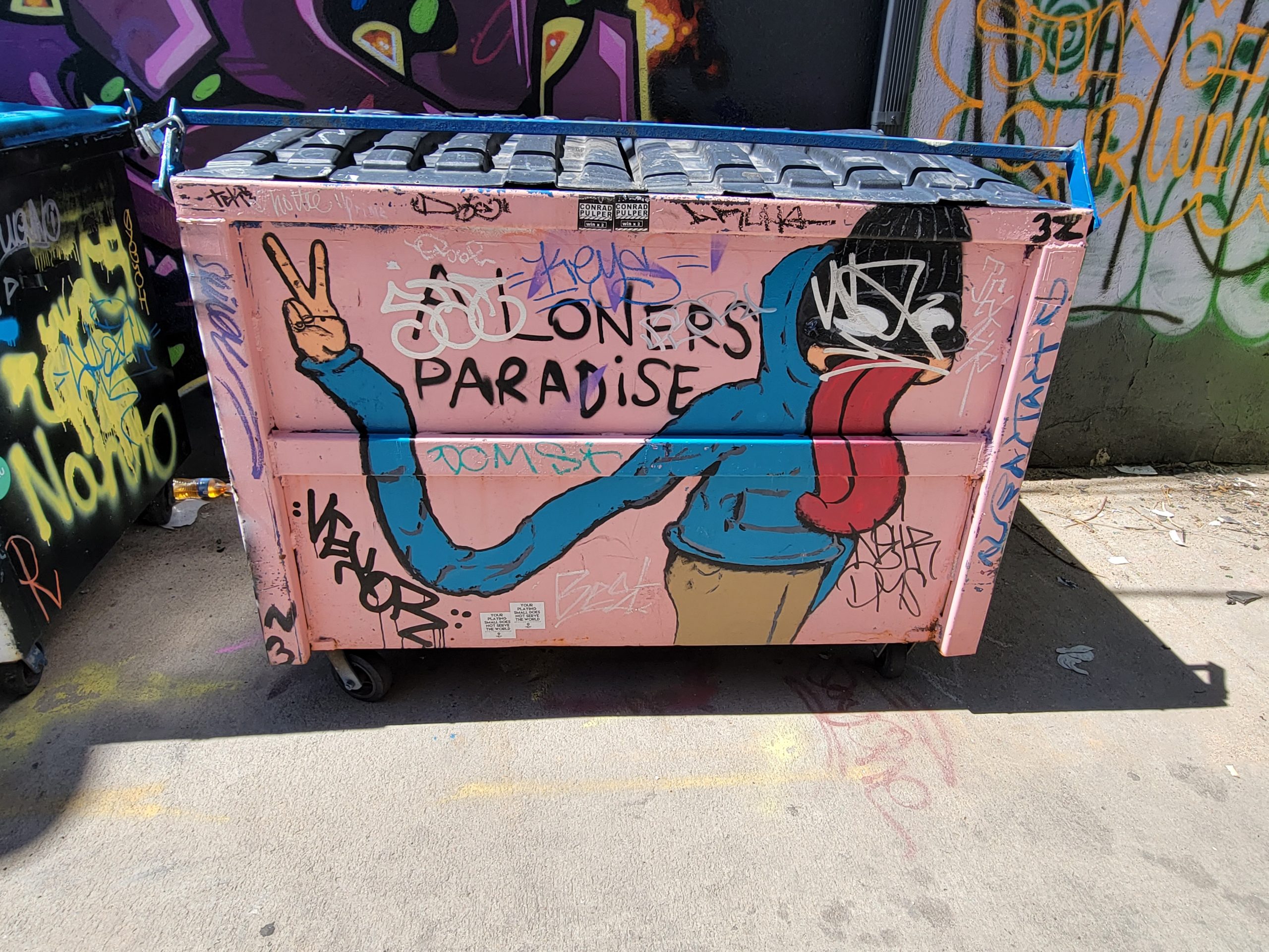 This playful piece of urban street art transforms an ordinary pink dumpster into a vibrant, unexpected canvas in a sunlit Denver alleyway. The graffiti features a stylized cartoon character wearing a blue hoodie and black beanie, complete with an exaggerated, long red tongue and a stretchy arm flashing a peace sign. Centered around the bold text "LONERS PARADISE" and surrounded by various street tags, the artwork perfectly encapsulates the city's spontaneous, creative, and slightly irreverent street culture.