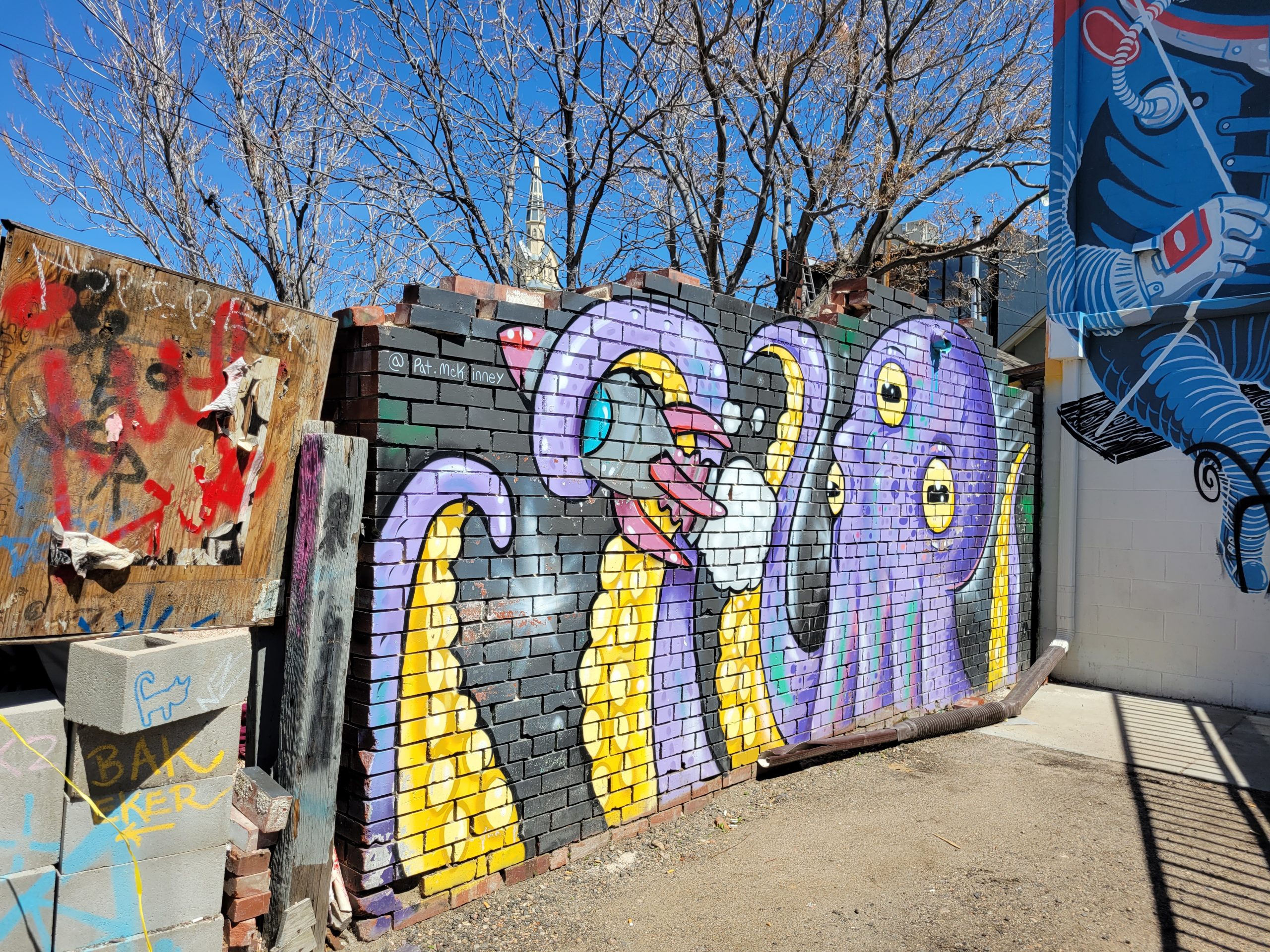 Painted on a freestanding brick wall under a bright blue Denver sky, this lively street art mural features a large, stylized purple octopus with bright yellow suction cups. The tentacles playfully wrap around a painted mechanical element, showcasing the imaginative work of artists like Pat McKinney, who continue to transform the city's alleyways into vibrant outdoor galleries.