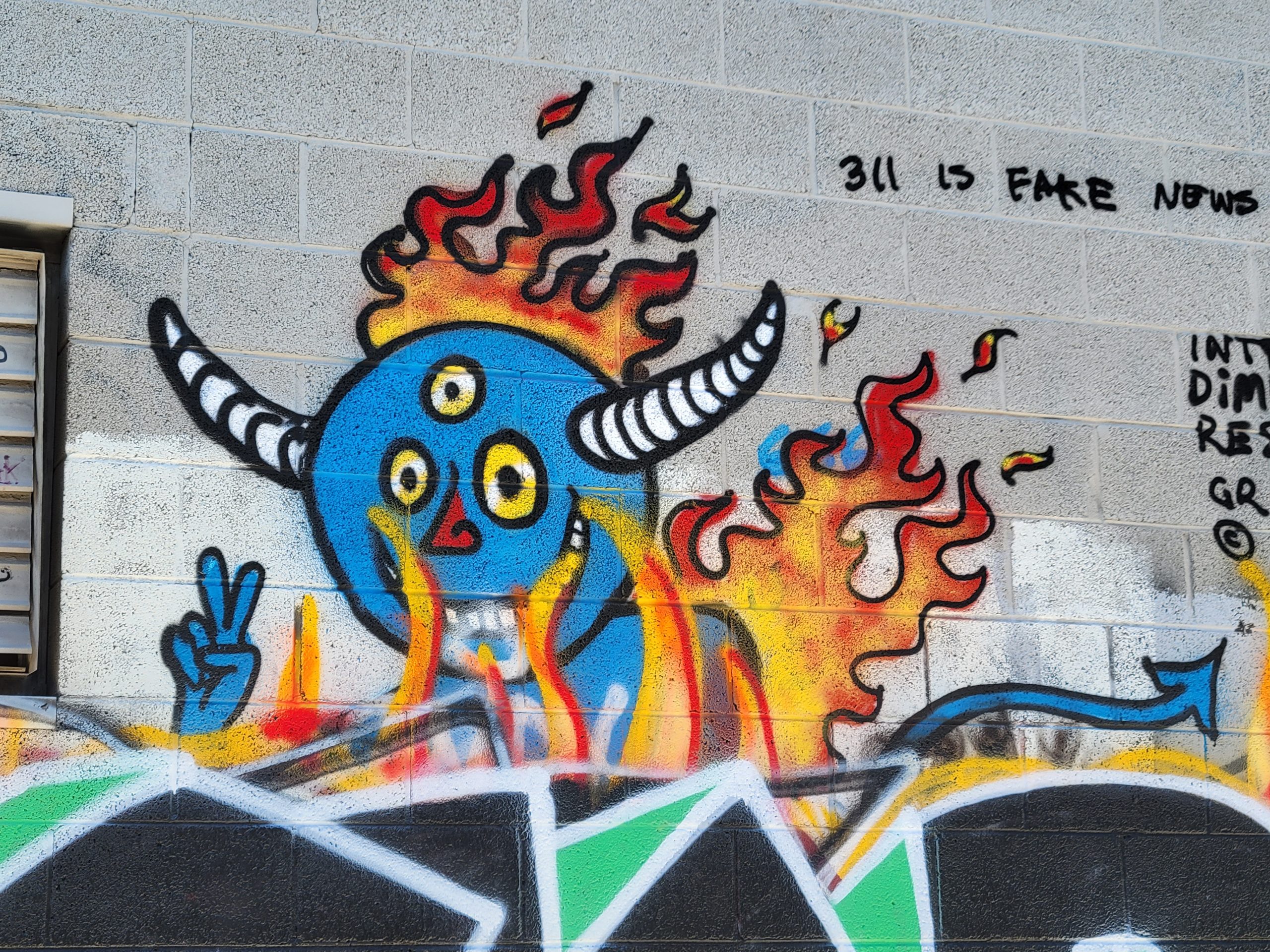 This playful piece of Denver street art features a bright blue, three-eyed devil character engulfed in painted flames. Flashing a peace sign and breathing fire, the cartoonish figure is painted on a textured white block wall alongside the quirky text "311 IS FAKE NEWS". The artwork perfectly highlights the humorous, spontaneous, and diverse nature of the city's urban graffiti culture.
