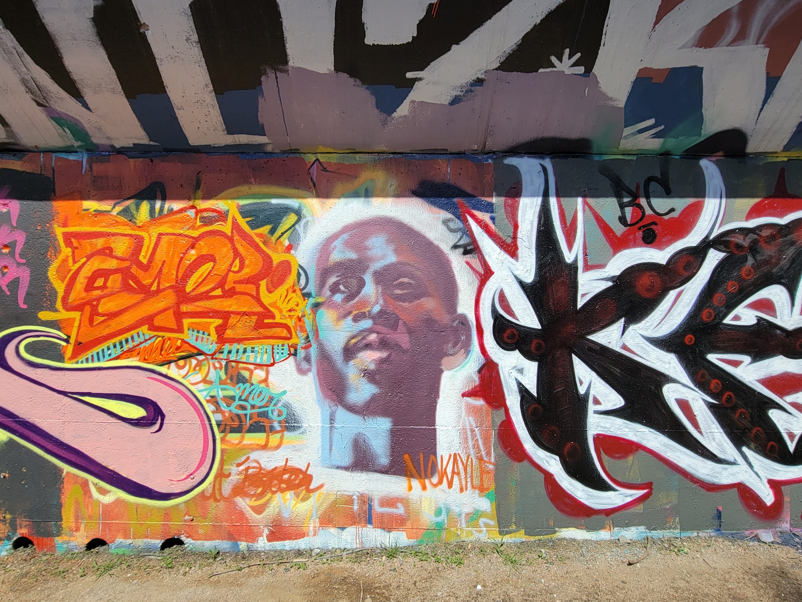 This dynamic street art piece is painted on a concrete wall situated beneath an overpass or bridge structure. The central focal point is a striking, realistic portrait of a man's face rendered in soft purples, blues, and warm hues, dramatically highlighted by a natural, rectangular patch of sunlight cutting across the shadows. The portrait is flanked by heavily contrasting graffiti styles: a bright orange and yellow wildstyle tag on the left, and a sharp, black and white jagged letter design with red dotted accents on the right. Featuring tags like "NOKAYLE," this mural beautifully contrasts fine art portraiture with raw, energetic urban lettering.